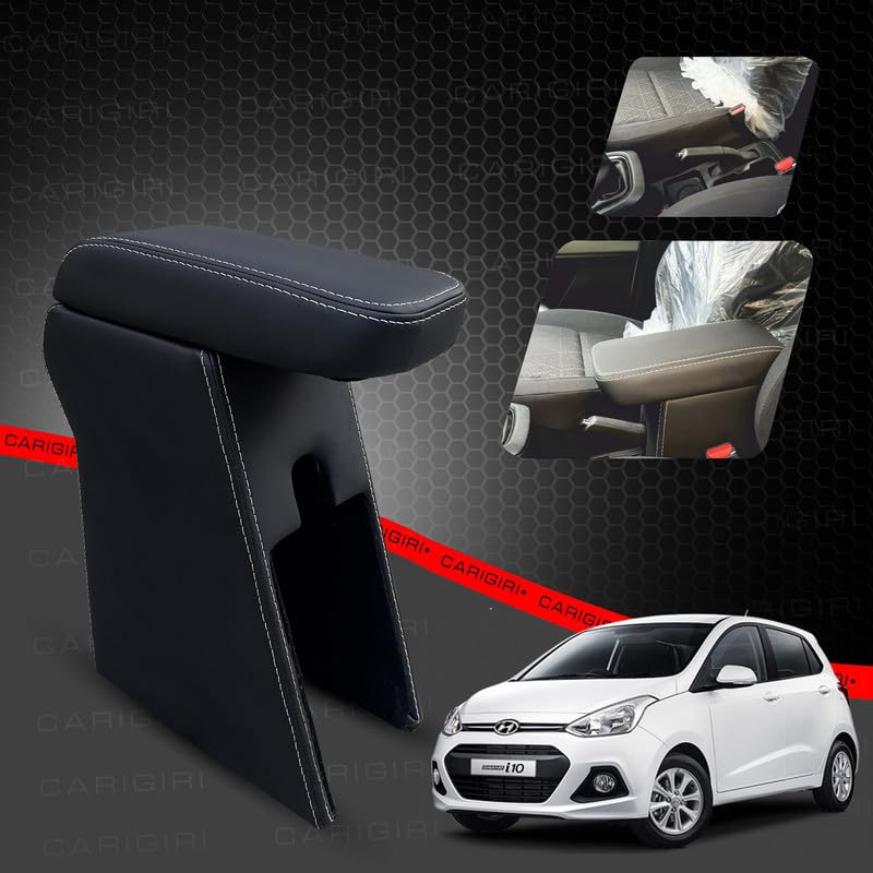 Carigiri Premium Finish Car Armrest with Storage Box And High Density Moulded Foam For Hyundai I10 Grand (Models-2013-2018) (Black With White Double Stitching,Nappa Leatherette)