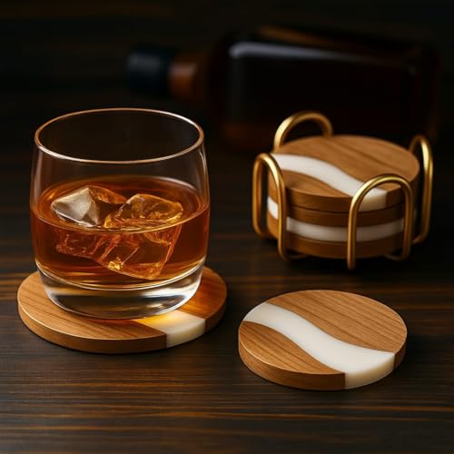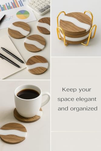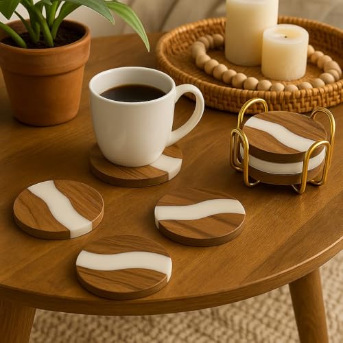 Elegant Coasters Set for Every Table: Add a touch of luxury to your home with this stylish coasters set. Perfect for protecting your dining table, coffee table, or office desk in style. Premium Wood & Resin Design: These dining table coasters feature a beautiful blend of natural wood and smooth white resin for a modern, classy look that complements any decor. Durable & Heat Resistant: Crafted for everyday use, this coasters set is heat-resistant, water-proof, and easy to clean — keeping your furniture safe from stains and scratches. Includes a Chic Gold Metal Stand: Comes with a sturdy gold metal stand to keep your coasters organized and within reach — no more scattered coasters! Perfect Gift for Any Occasion: This elegant dining table coasters set makes a thoughtful housewarming, wedding, or festive gift for family and friends who appreciate fine decor.