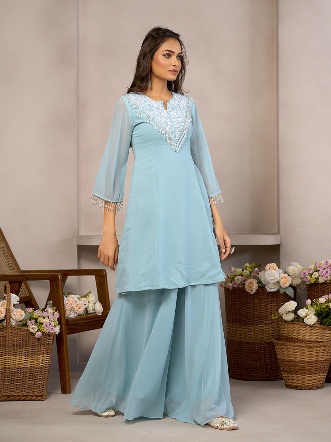 Buy this stylish CHHAAP Floral Embroidered Round Neck Beads And Stones A-Line Kurta With Palazzos at Marincart Nepal. This product offers great quality and value. Perfect for those looking for the latest trends in fashion. Get yours now at unbeatable prices.