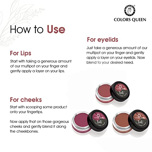This Colors Queen Lip and Cheek Tint - is designed to be a Multitasker and for women who love the Minimal Look. Infused with essentials Oil and Vitamin E, this Tint for cheeks and Lips prevents infection and helps maintain healthy skin and Lips. Why COLORS QUEEN LIP AND CHEEK TINT: This Lip and Cheek tint for women is not only meant for giving you that last minute Touch up look, but also acts as a cure and prevention for your Lips, Cheeks and EyeLids. It is a 100% Natural tinted lip balm, to effectively cure dryness, darkness and chapped lips, cheeks and Eye Lips. USE CASE: For How many times have you ever been in the middle of something, where you just need that last minute touch up, Well! We agree that you don’t like OTT Makeup, but that last minute touch-up is required, here is where our Colors Queen Minimal Lip and Cheek Tint would come as a super-power. Give your lips, cheeks and Eyelids an instant Gorgeous Look to steal the show. ACTIVE INGREDIENTS: These Include Vitamin E, Castor Oil, Jojoba Oil, BeesWax Candelilla Wax and Carnauba Wax. Infused with essential oils and Vitamin E, this Tint for cheeks and Lips prevents infection and helps maintain healthy Cheek, Lips and Eyelid. Castor Oil prevents Fine lines and Wrinkles, fights Acne and Reduces Puffiness. Jojoba Oil acts as an Antioxidant and is hypoallergenic. DIRECTIONS TO USE: Take a small amount on your fingertips and apply to lip, cheek and eyelid spreading evenly.