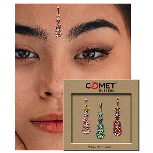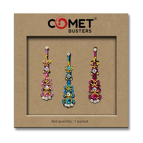 Comet Busters Bindis : We have designed our bindis tapping into centuries of tradition and with attention to detail. Our online bindi store has a beautiful collection of Single, Black color, Maroon Color and multi color body bindis and comprises a range of masterfully created minimalist bindi designs. All bindi designs are handcrafted with care and attempt to embody the elegance and grace of a woman. Skin Friendly and Reusable : Each unique design is intricately handcrafted to perfection. We make our exquisite collection of bindis using high-quality material as per set quality standards.Our bindis are 100% handmade, not tested on animals, perfect for skin, safe, non toxic and are reusable Apply Instruction : To apply a bindi carefully remove it from the plastic and place on your forehead in between the eyebrows. Hold the bindi down for a few seconds or until you feel that your bindi holds firmly in place.The bindi can be reused and worn multiple times or until it loses its ‘stickiness’. You also can use eyelash glue to enhance the stickiness for avoiding fall off. Comet Busters Bindi Styling : We have a wide variety of colors, shapes, sizes and designs. Our bindi includes beadwork, studded stones, pearls and diamonds. Comet Busters Bindis are great to wear for night out, proms, parties, weddings, festivals or any other special occasions. Add these beautiful designed bindis to your cart and experience the rich culture. Comet Busters Bindi Quality : We try to ensure utmost care while designing our bindis, each bindi is handcrafted with precision to give that premium finish, ensuring to draw immediate attention.