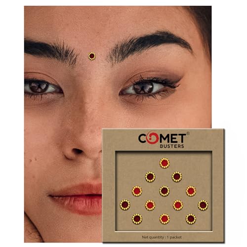 Skin Friendly and Reusable : Each unique design is intricately handcrafted to perfection. We make our exquisite collection of bindis using high-quality material as per set quality standards.Our bindis are 100% handmade, not tested on animals, perfect for skin, safe, non toxic and are reusable Comet Busters Bindis : We have designed our bindis tapping into centuries of tradition and with attention to detail. Our online bindi store has a beautiful collection of Single, Black color, Maroon Color and multi color body bindis and comprises a range of masterfully created minimalist bindi designs. All bindi designs are handcrafted with care and attempt to embody the elegance and grace of a woman. Apply Instruction : To apply a bindi carefully remove it from the plastic and place on your forehead in between the eyebrows. Hold the bindi down for a few seconds or until you feel that your bindi holds firmly in place.The bindi can be reused and worn multiple times or until it loses its ‘stickiness’. You also can use eyelash glue to enhance the stickiness for avoiding fall off. Comet Busters Bindi Styling : We have a wide variety of colors, shapes, sizes and designs. Our bindi includes beadwork, studded stones, pearls and diamonds. Comet Busters Bindis are great to wear for night out, proms, parties, weddings, festivals or any other special occasions. Add these beautiful designed bindis to your cart and experience the rich culture. Comet Busters Bindi Quality : We try to ensure utmost care while designing our bindis, each bindi is handcrafted with precision to give that premium finish, ensuring to draw immediate attention.