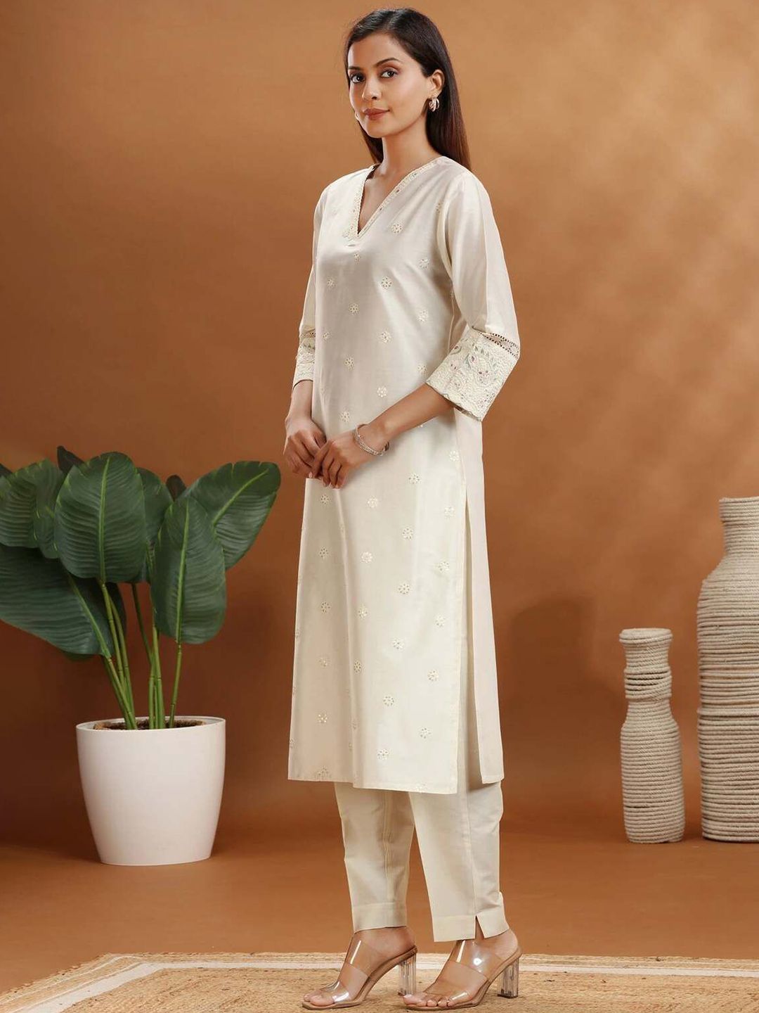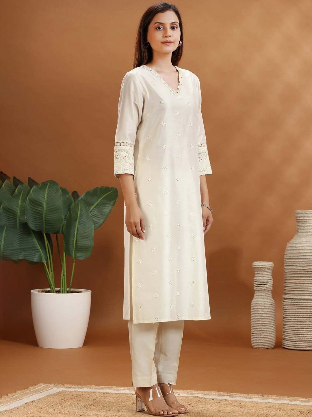 COTTON CULTURE Floral Embroidered V-Neck Pure Cotton Straight Kurta With Trousers