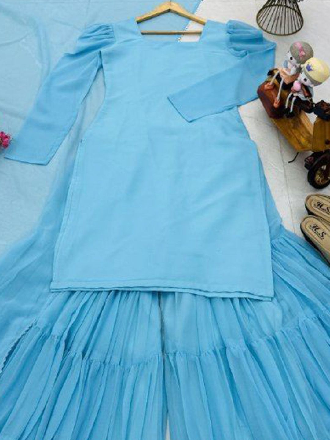 CRAFTLE V-Neck Georgette Straight Kurta With Sharara & Dupatta