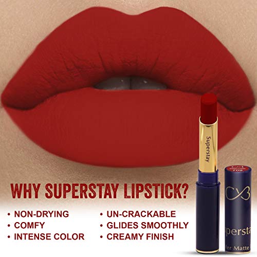 MATTE LIPSTICK COMBO - CVB Superstay No Transfer Matte Lipstick is a combo of matte-finish lipsticks that provide sensual matte lips without costing too much. FULL PIGMENTED - The full pigmented formula of these lipsticks ensure long-lasting stay on your lips. You don’t have to worry about partial fade or full fade due to water as it is water repellant. WATERPROOF - CVB lipstick is superstay lip colour and has waterproof properties. It means no matter how much you sweat or drink water or wash your face, this lipstick won’t come out unless you wipe it off. MULTICOLOUR - We know you don’t love monotonous makeup routine. To ensure that. Apply a lighter one while going to face and dark colour for going to late-night parties.; HOW TO USE - Apply liquid straight from the bullet. Thicken the colour along with the cupid’s bow and the lower lip for a natural plucker. Target Audience Keywords: Women; Target Gender: Female