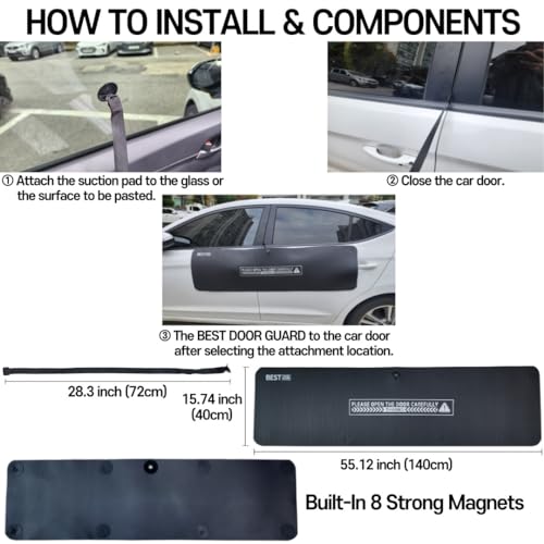 [EASY TO ATTACH AND DETACH] - BestDoorGuard has 8 neodymium magnets inside with quick installation within 10 seconds, also this removable BestDoorGuard remains no scratches during installation thus this product is for those of who prefer having well-managed vehicle without any scratches and want to avoid sticker- typed door guard. [EXCELLENT SHOCK ABSORPTION] - Using 10mm high-density foam provides excellent shock absorption, so no matter how many stones are thrown, it stays clean like a new car, protecting your car from parking scratches. [EASY TO STORE] - Because of designed for portability When storing, BestDoorGuard can be roll up and neatly stored in the space to the rear seat or in the trunk of the vehicle. [ATTACHMENT APPLIED VEHICLE] - How to check vehicles that can be attached : Please check in advance whether it is possible to attach it to the vehicle door using a magnetic sticker or magnet attached to the refrigerator in your home. Magnets won't stick to aluminum, carbon fiber or polymer doors, including TESLA. *Doors must be clean of debris for magnets to stick well.