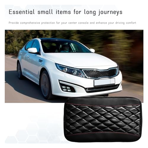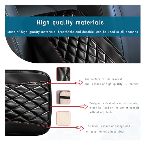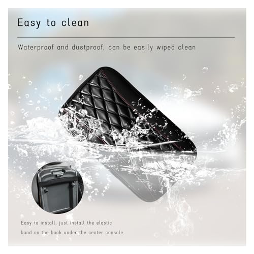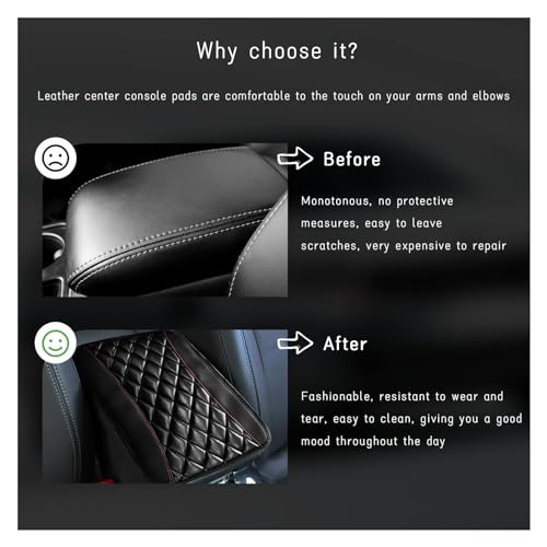 ?Dual Protection?: For one thing, the car armrest box cushion pad is thick enough to protect your armrest box from pet claws, sticky fingers or smudges. It also can effectively resist lasting suncrack, making the center console last long time. For another, the product is soft and skin-friendly enough to provide a comfortable touch and release pressure for your arms or elbows. ?Good Quality?: The car center console cover is made of premium leather. Leather can serve as a good cushion, especially on bumpy roads. This material has a waterproof and dustproof surface which is wear resistant and durable, lightweight and eco-friendly, safe to apply. ?Simple Cleaning?: It is quite simple and convenient to wipe or clean this center console armrest box pad only with wet tissue or towel. Firstly, thanks to its waterproof function mentioned above, the water stains on the product can be easily and quickly wiped out and new as before. Secondly, the cover is quite breathable, will be dry right away after being cleaned or wiped. ?Easy Installation?: This center console armrest pad is designed with double flexible elastic straps at the bottom. You just need to install the elastic bands on the back under the center console. This allows you to fix it steadily on the vehicle's center console without the need for any tools. In addition, the back adopts anti-slip cloth so that it will not slip off at will in the installation process. ?Wide Compatibility?: The 7.48×12.6 inches leather car armrest box cover is universally compatible with most cars, trucks, SUVs, and so on. If you are not sure of the size, you'd better measure the size of your automotive armrest boxs before purchasing to ensure that the product is suitable for your center console.