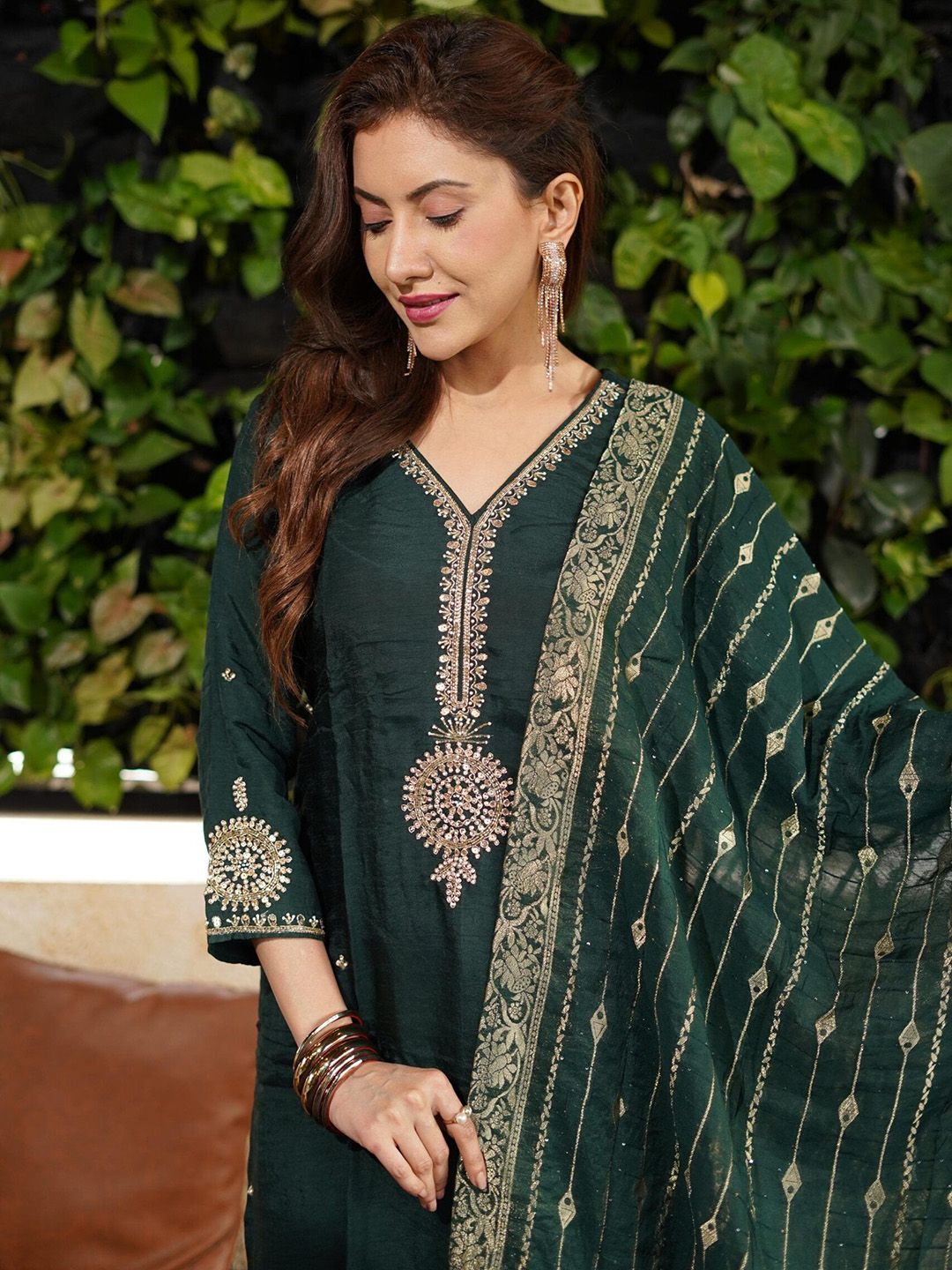 DIVASTRI Embroidered V-Neck Beads & Stones Pure Cotton Kurta With Trousers & Dupatta