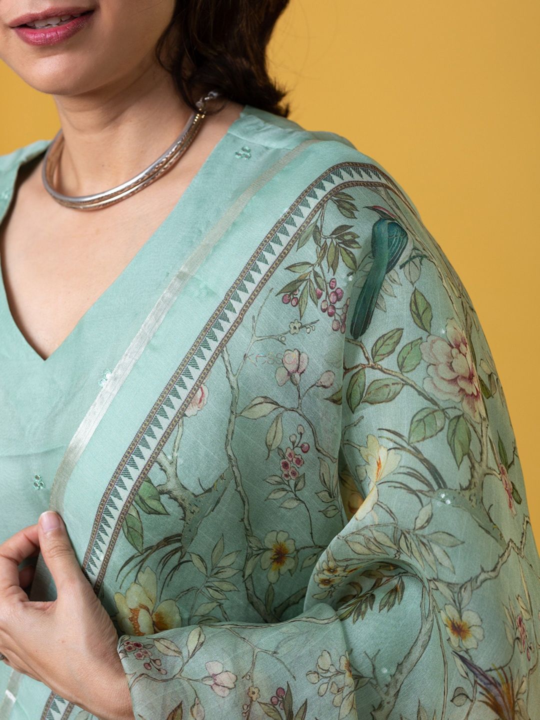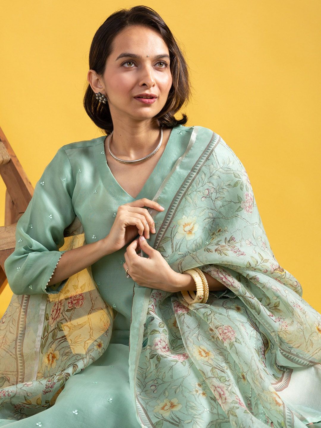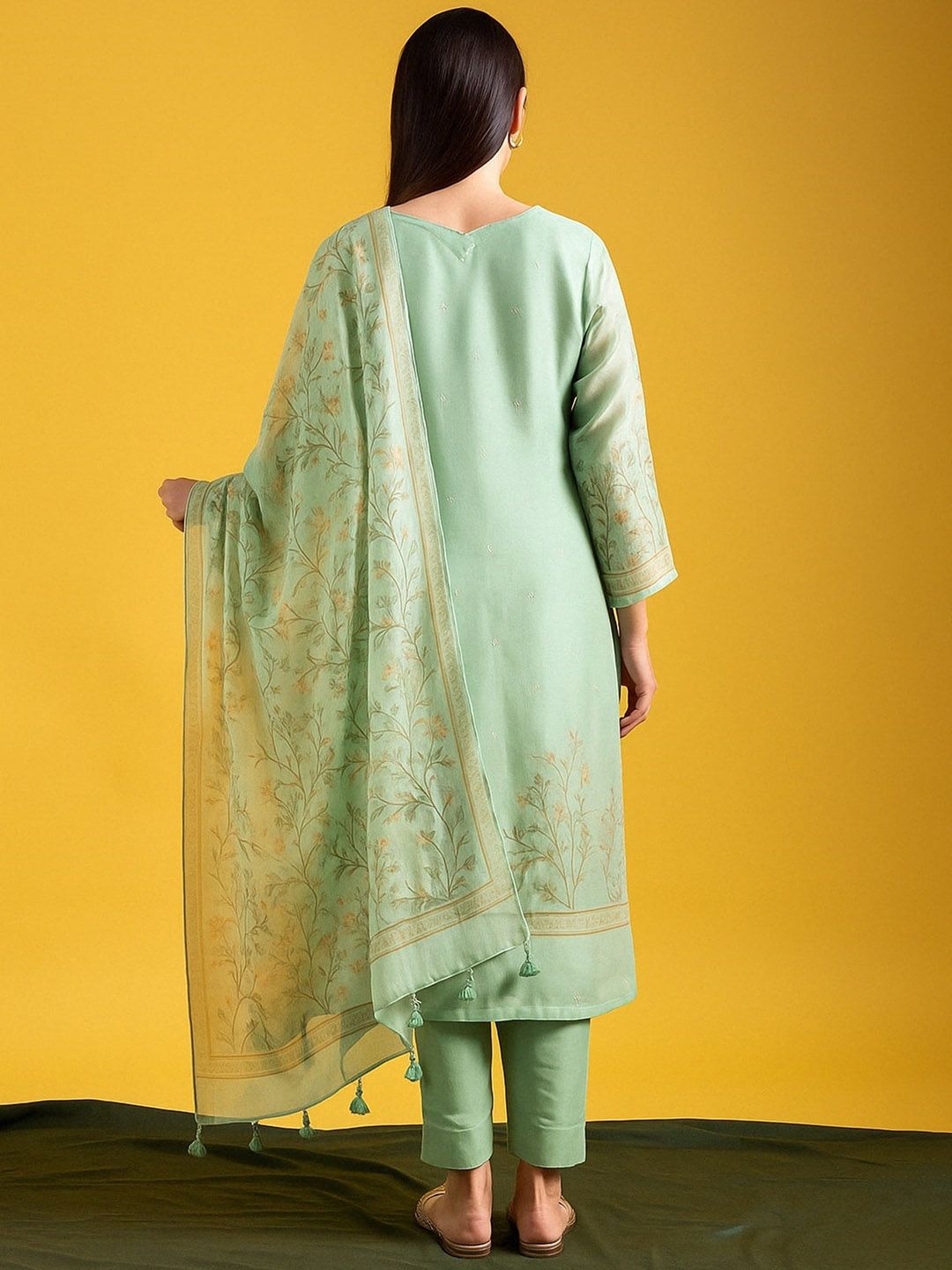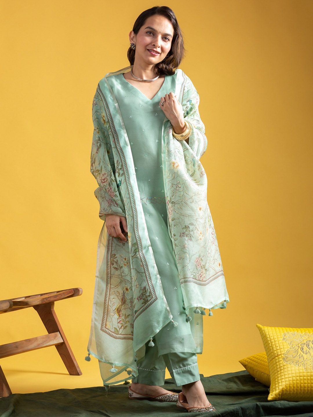 DIVASTRI Embroidered V-Neck Mirror Work Straight Kurta With Trousers And Dupatta