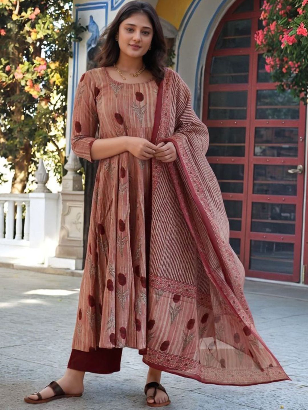 DIVASTRI Floral Printed Round Neck Anarkali Kurta With Trousers & Dupatta