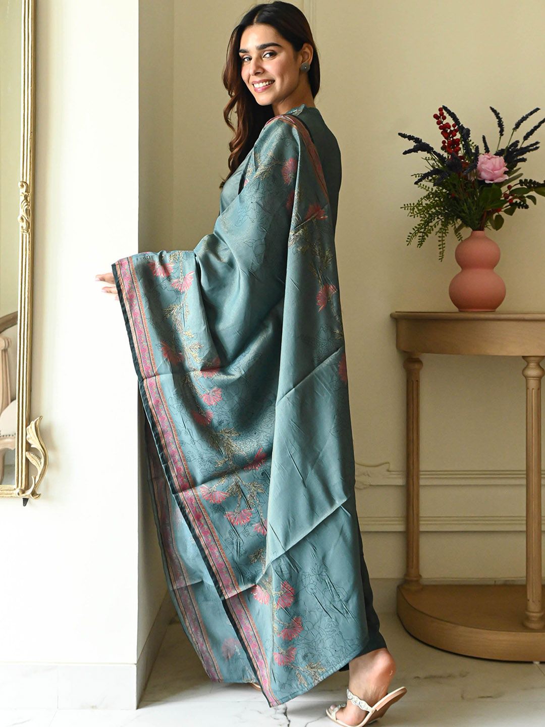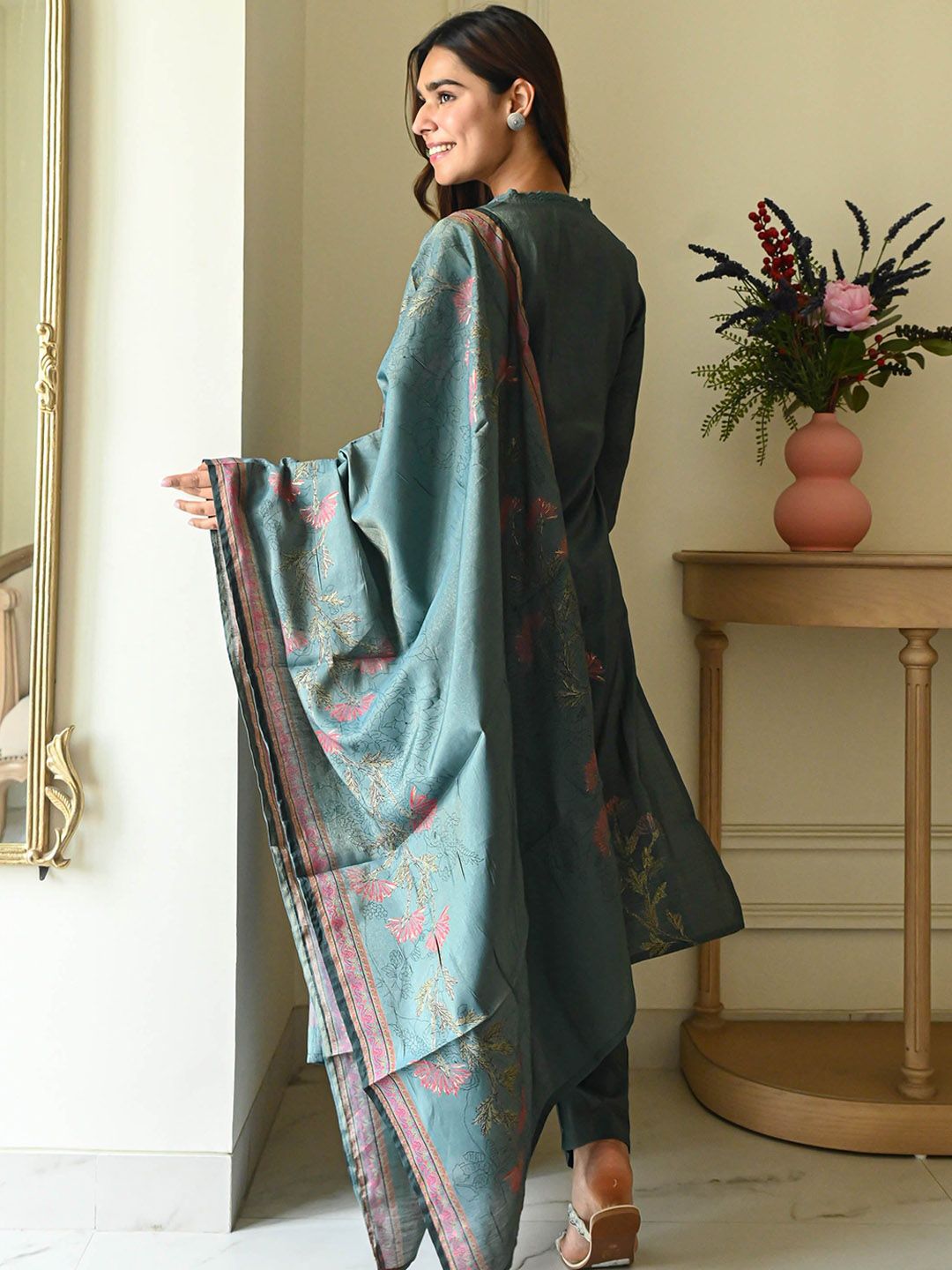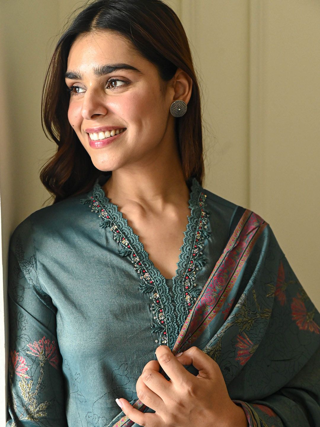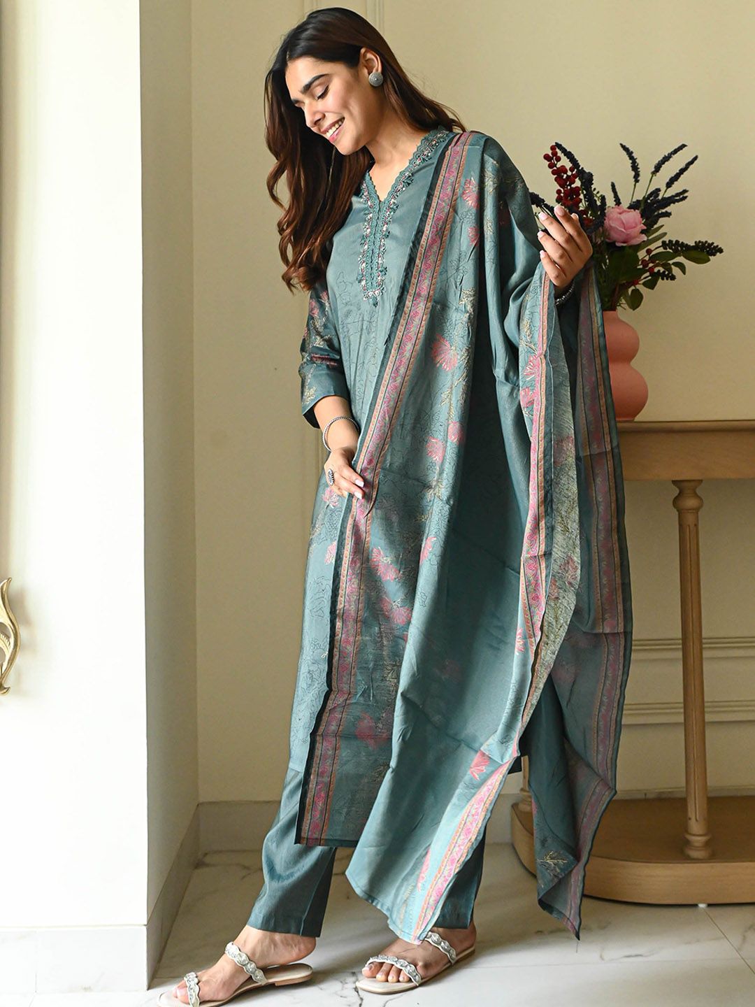 DIVASTRI Floral Printed V-Neck Beads And Stones Straight Kurta With Trousers & Dupatta