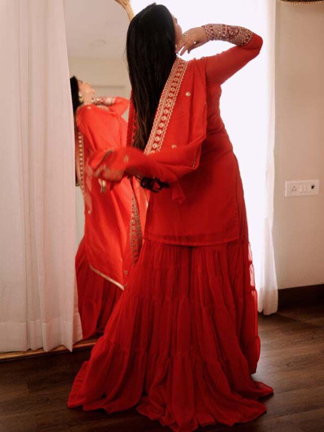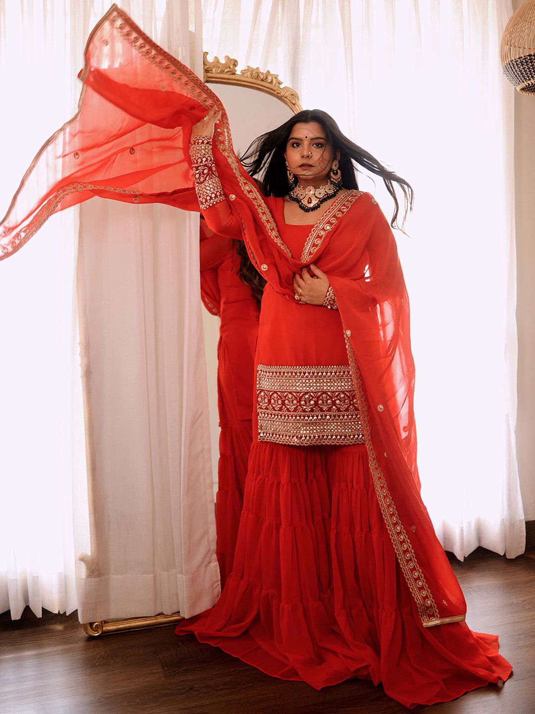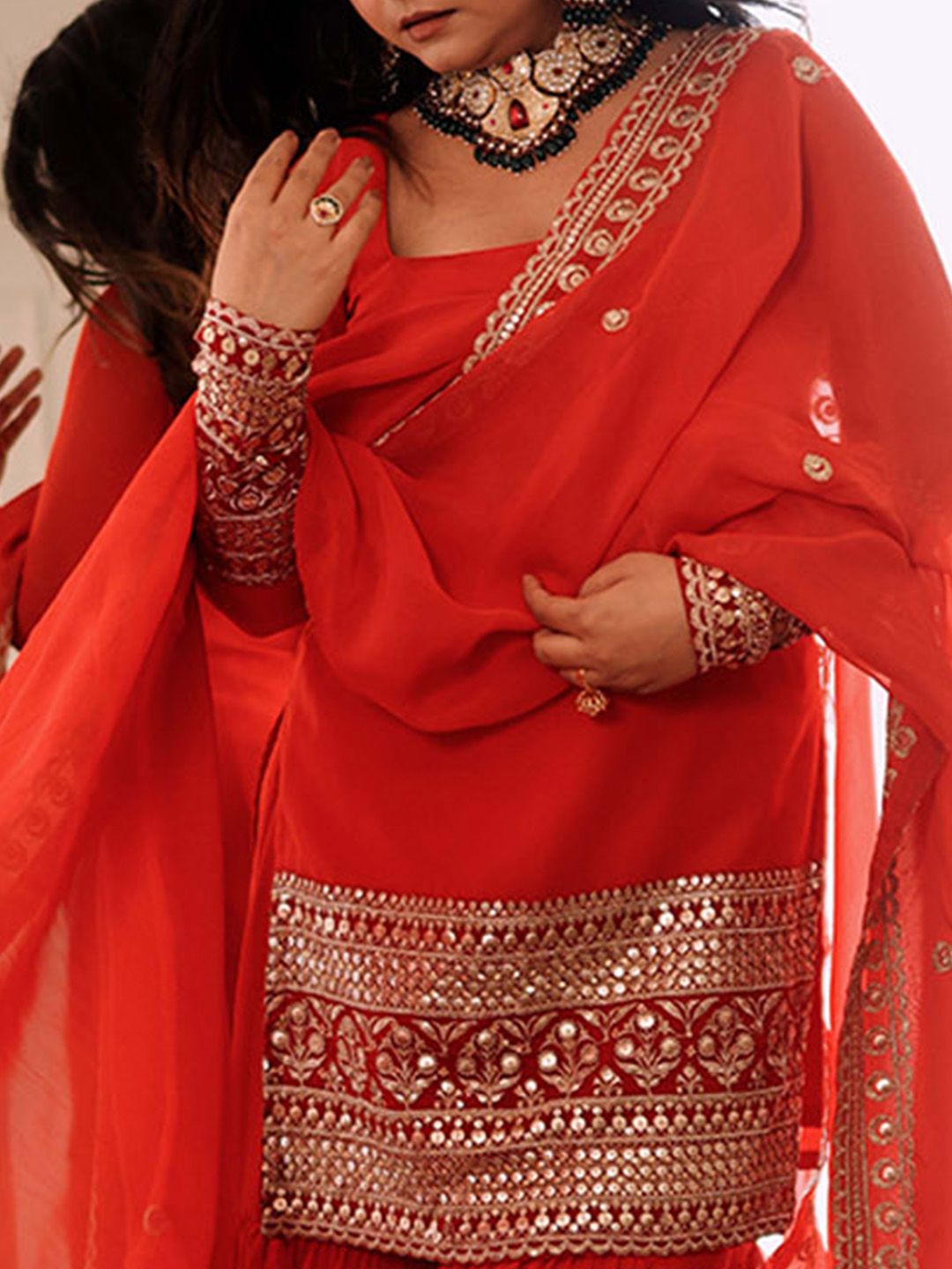 DIVASTRI Floral Yoke Design Square Neck Sequinned Georgette Straight Kurti With Sharara