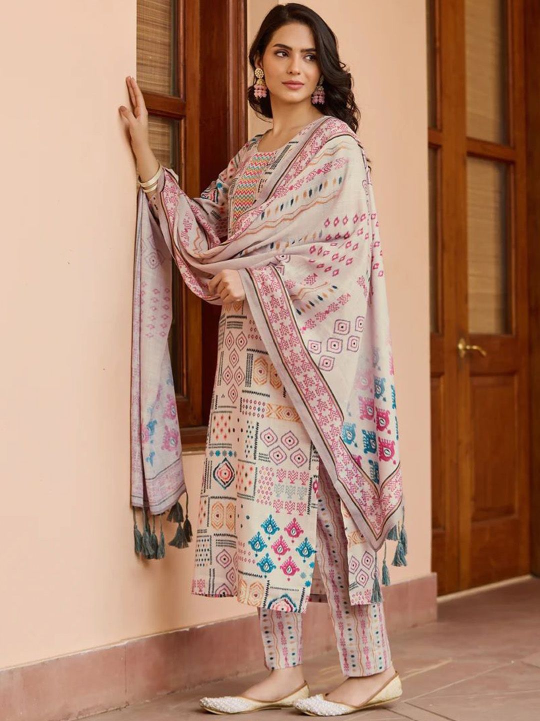 DIVASTRI Geometric Printed Round Neck Pure Cotton Straight Kurta With Trousers & Dupatta