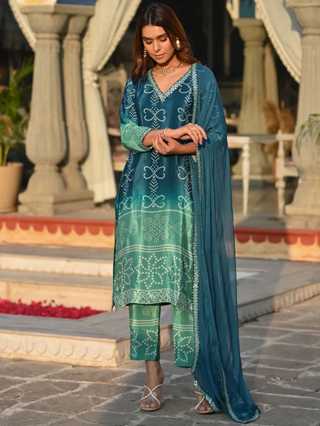 DIVASTRI Printed V-Neck Mirror Work Chanderi Silk Straight Kurta With Trousers & Dupatta