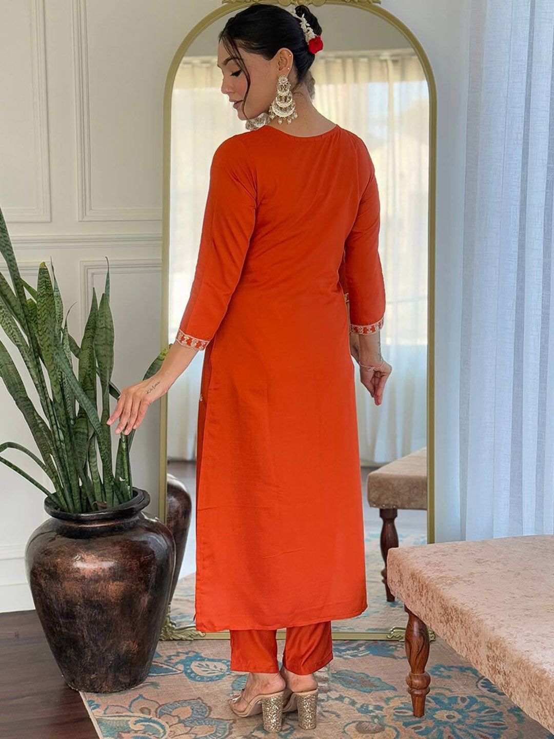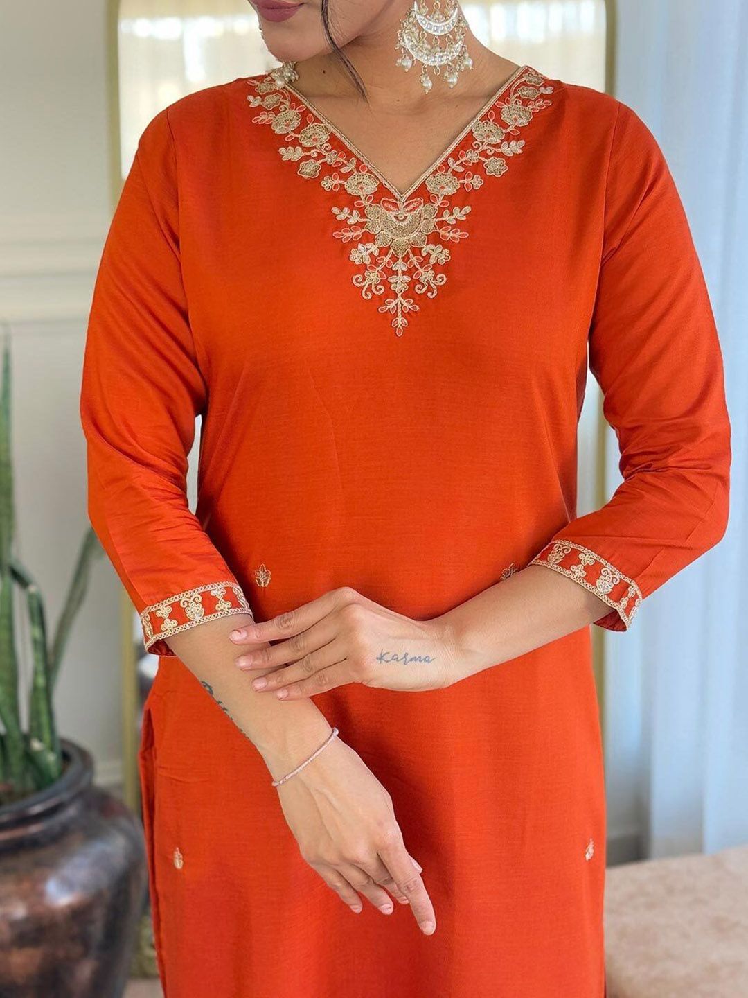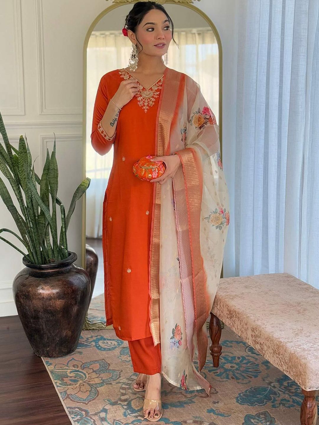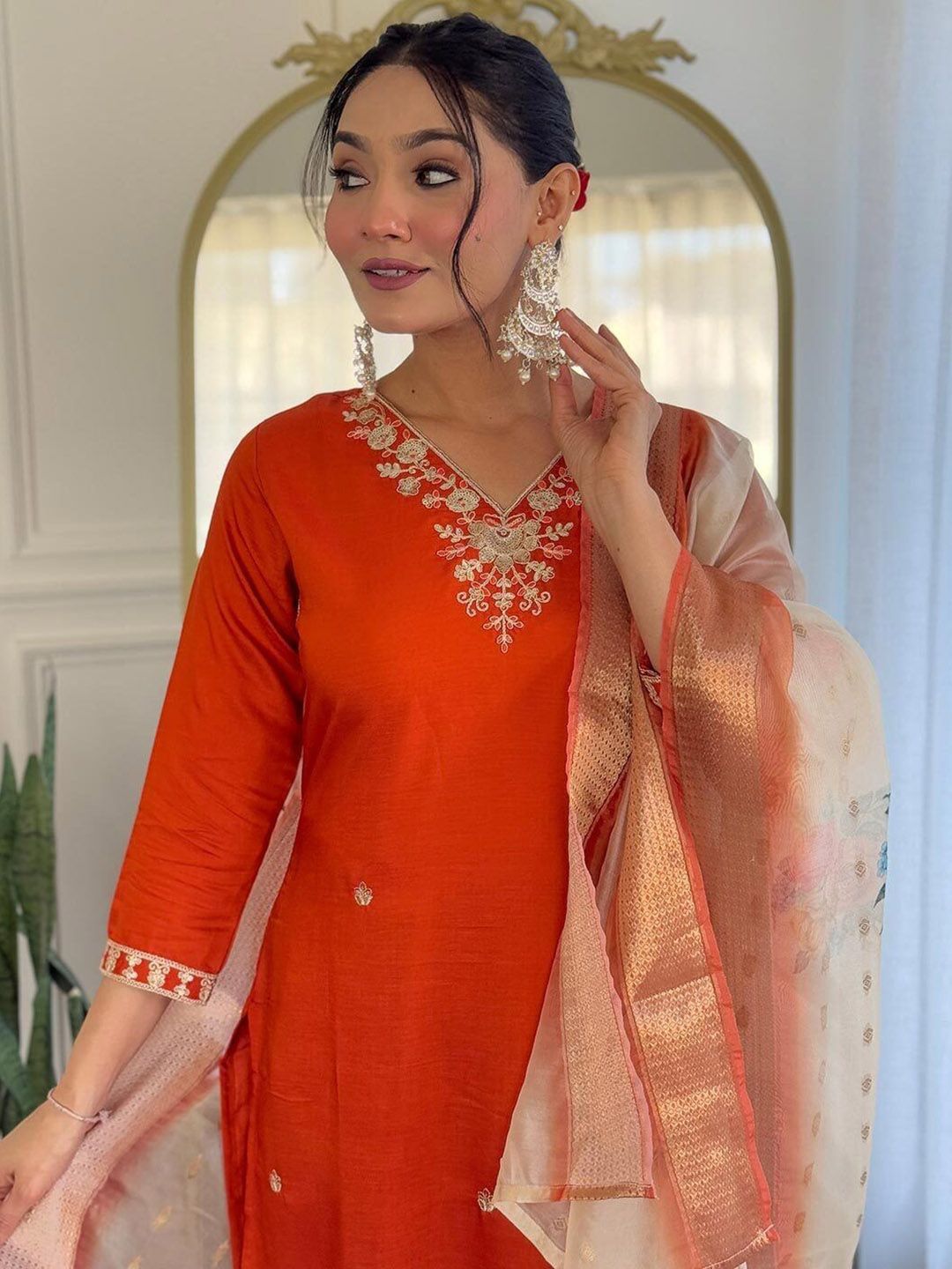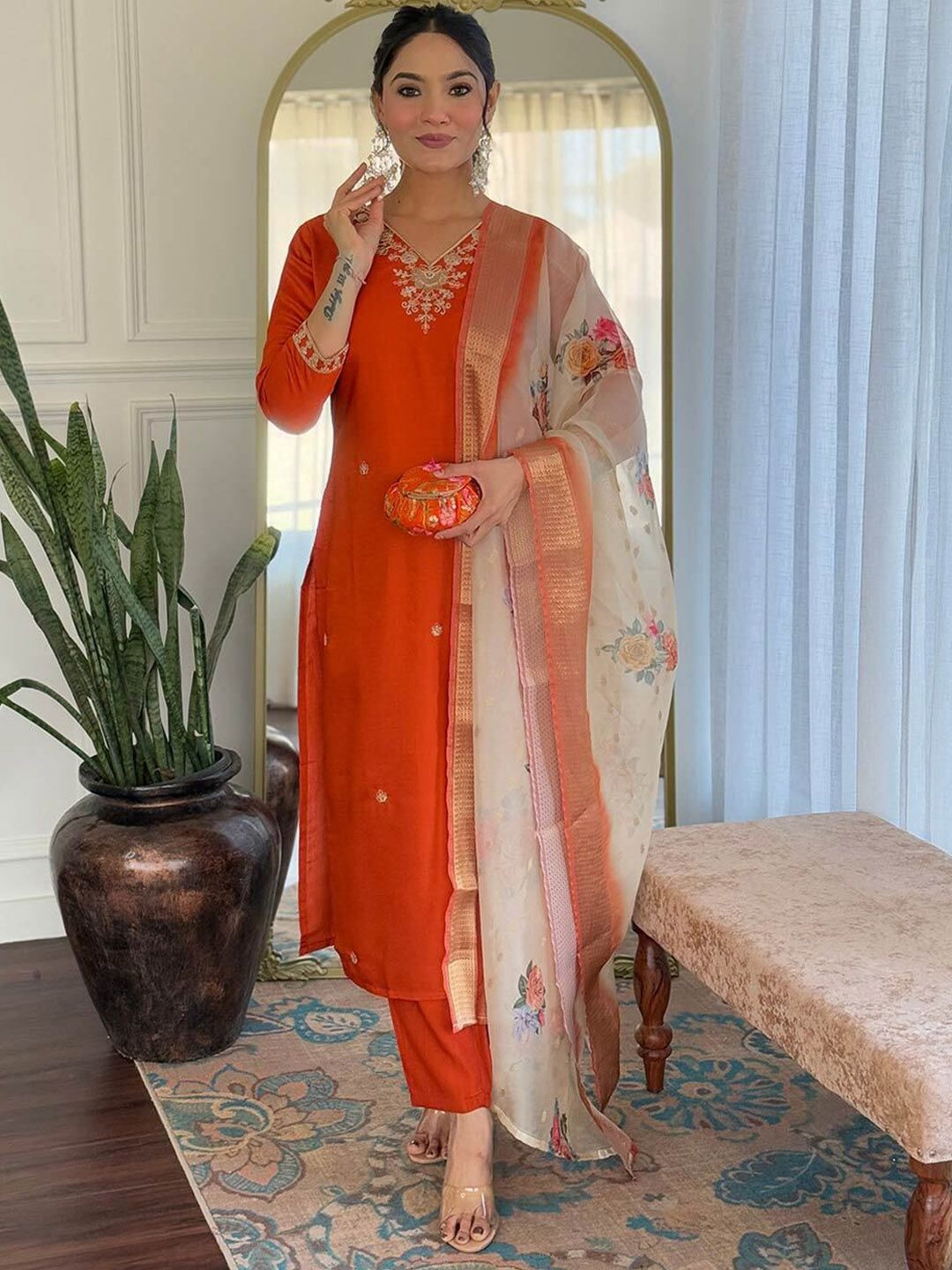 DIVASTRI Women Embroidered V-Neck Kurta with Trousers & Dupatta
