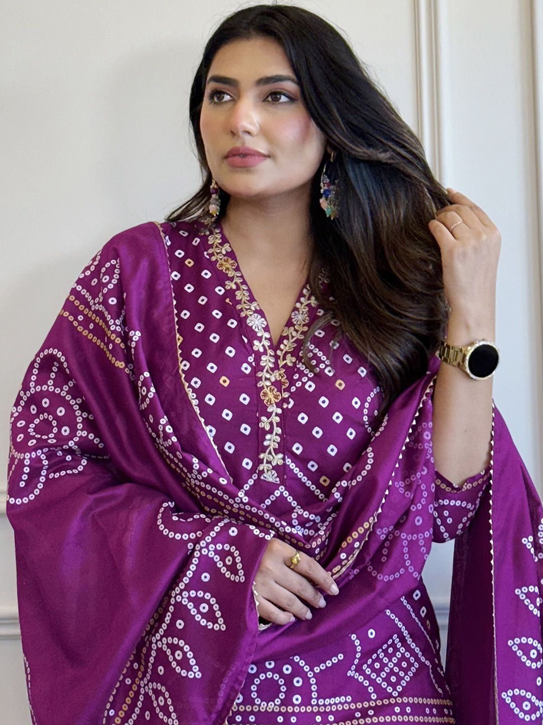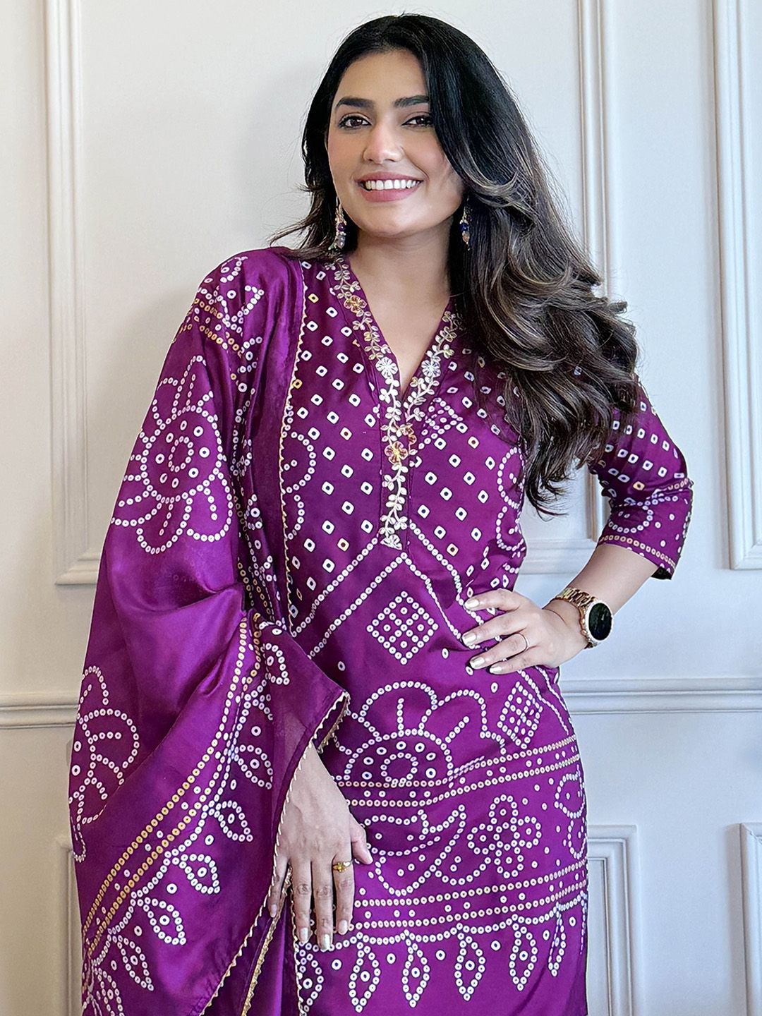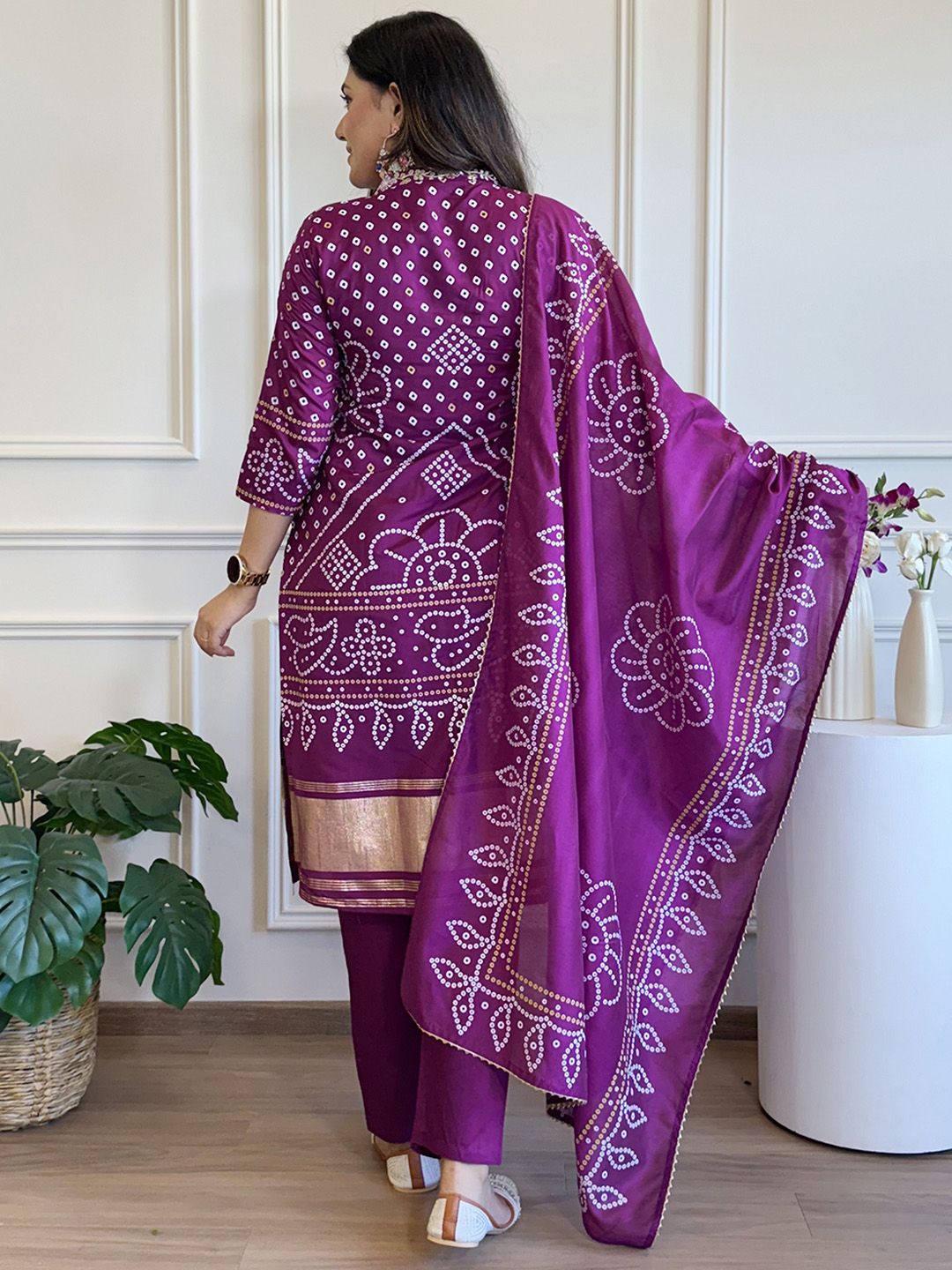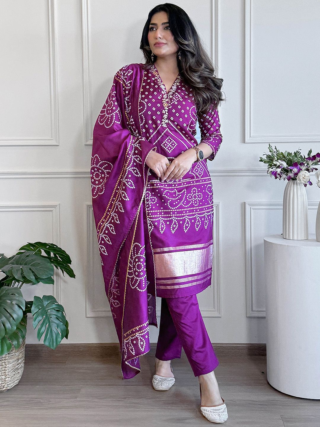 Divyadham Textiles Bandhani Printed Chanderi Silk Straight Kurta With Trousers & Dupatta