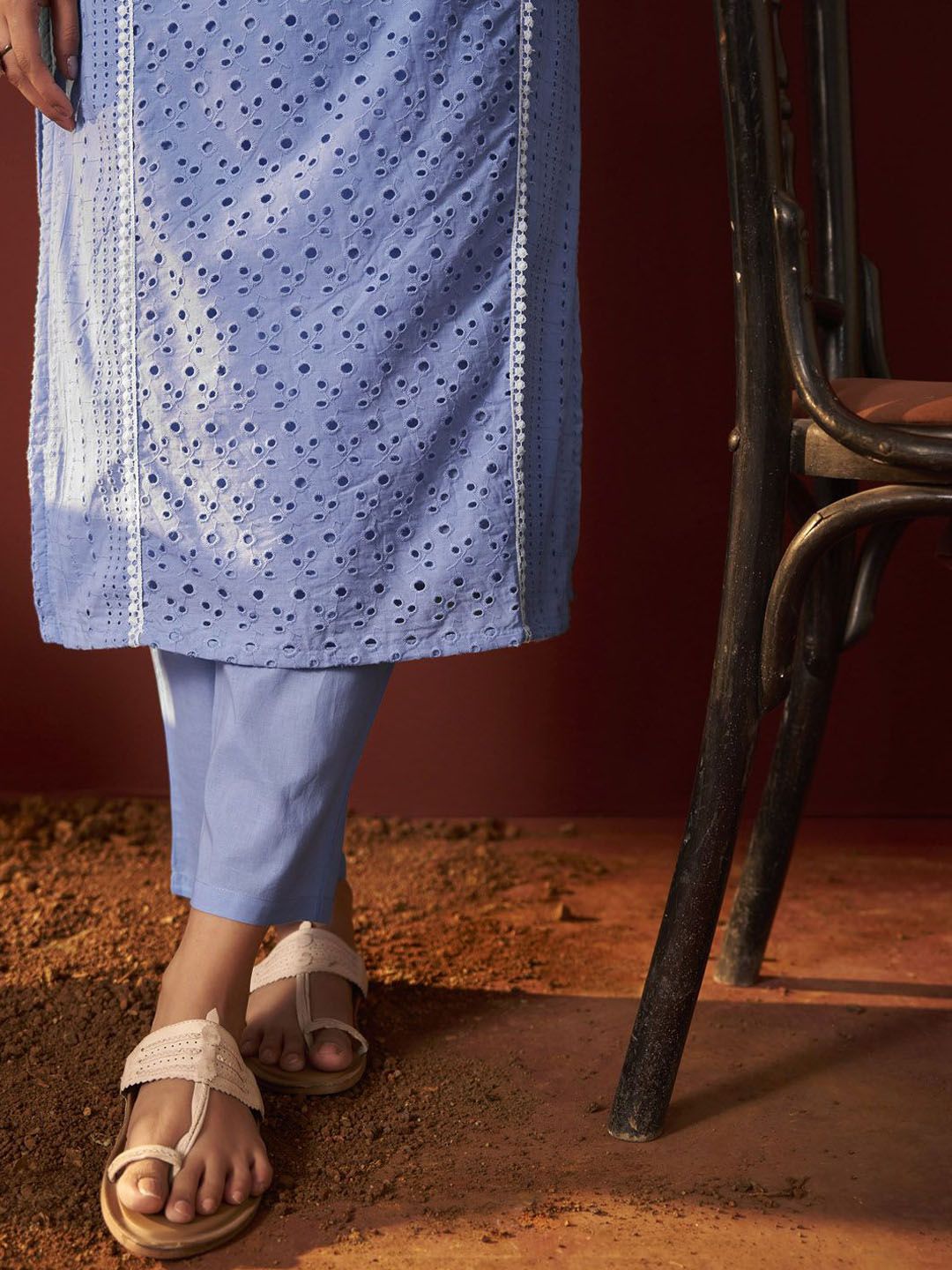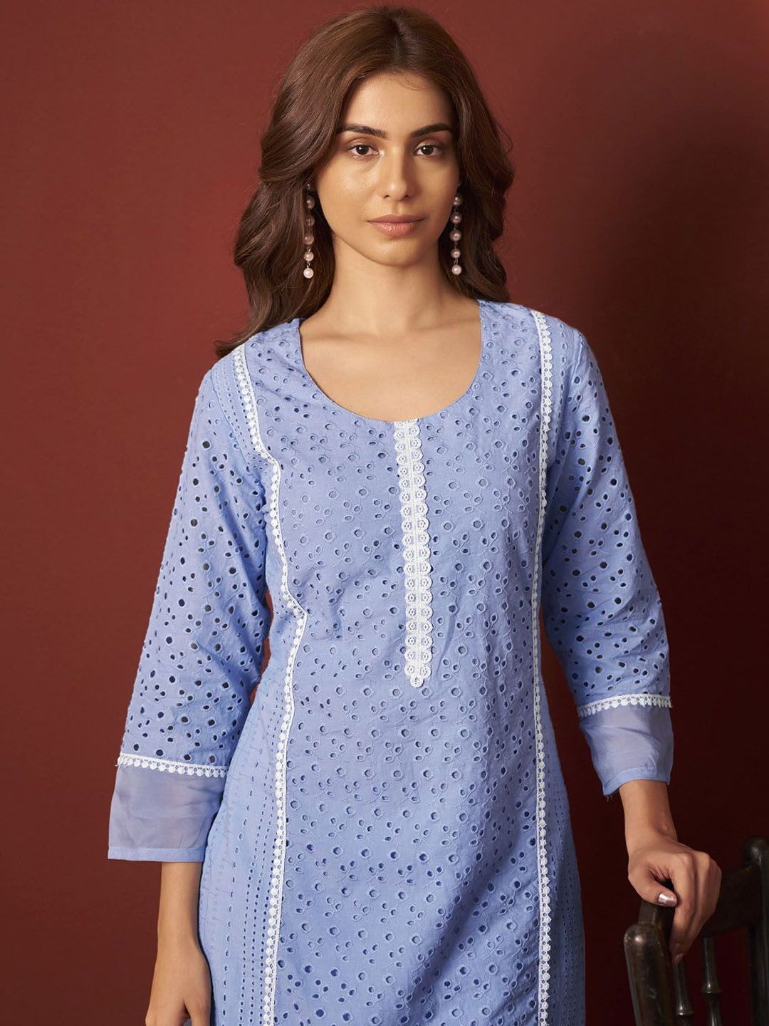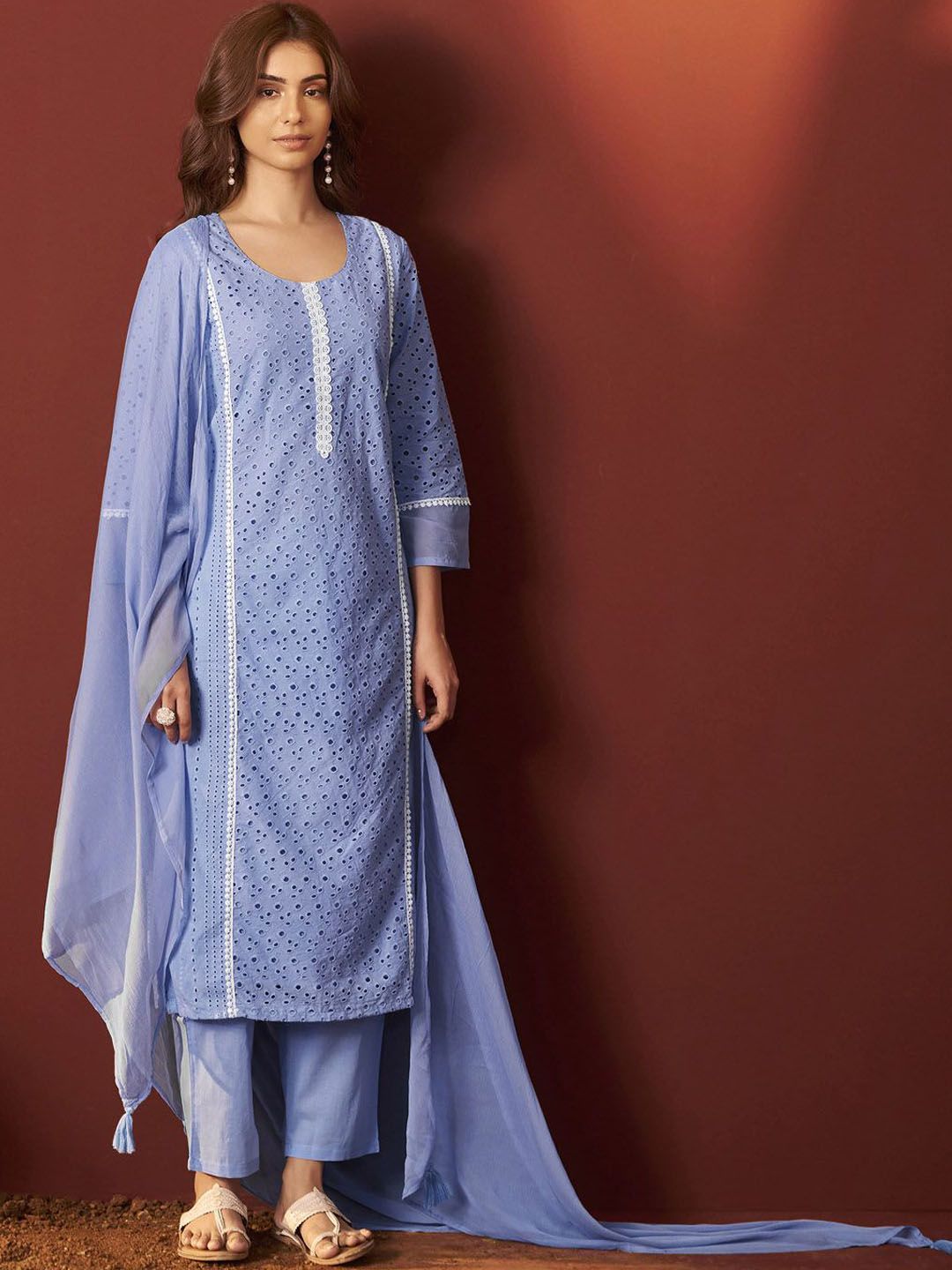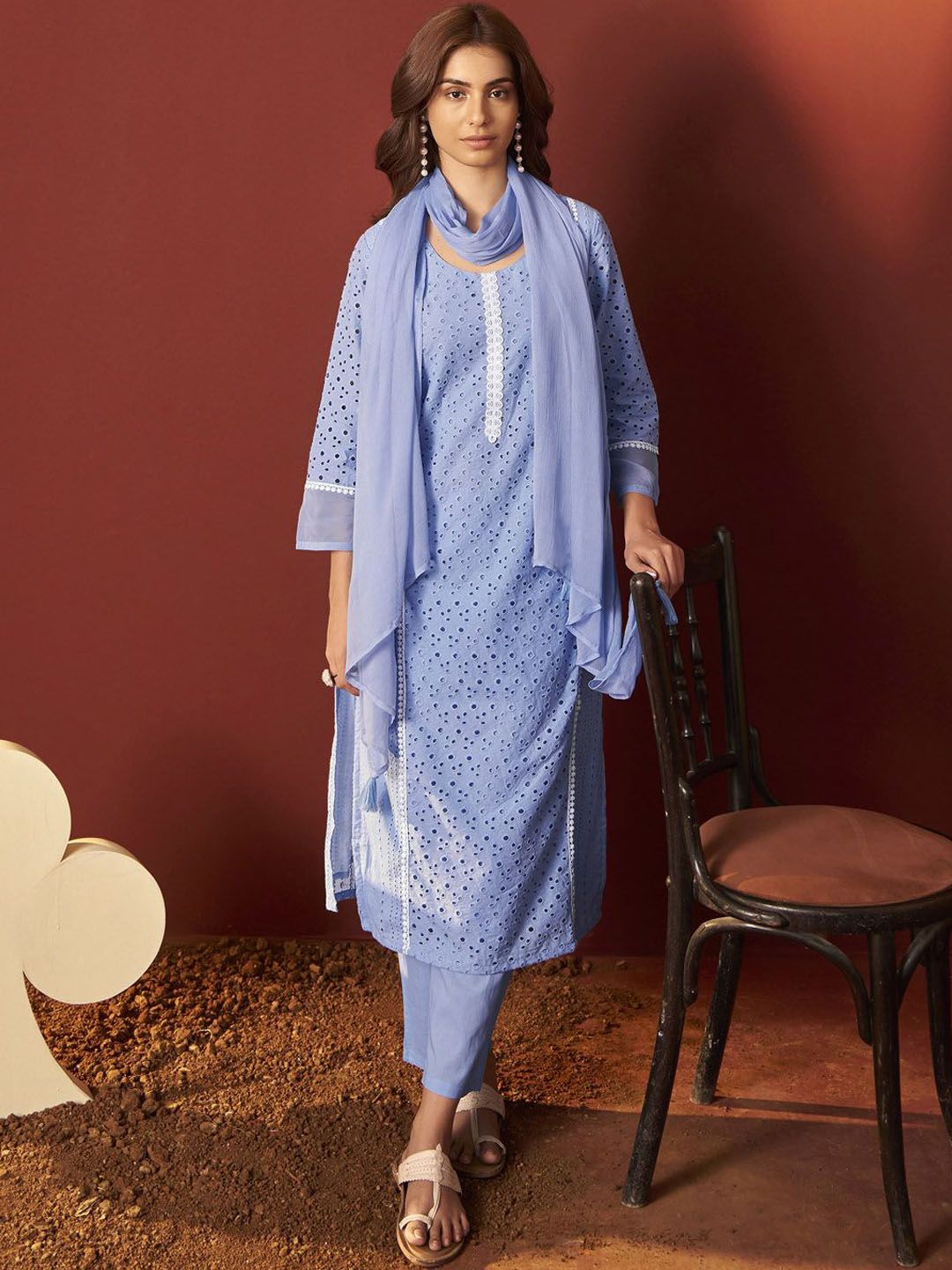 DRESOUL Women Embroidered Sky Blue Pure Cotton Schiffly Kurta Set With Dupatta
