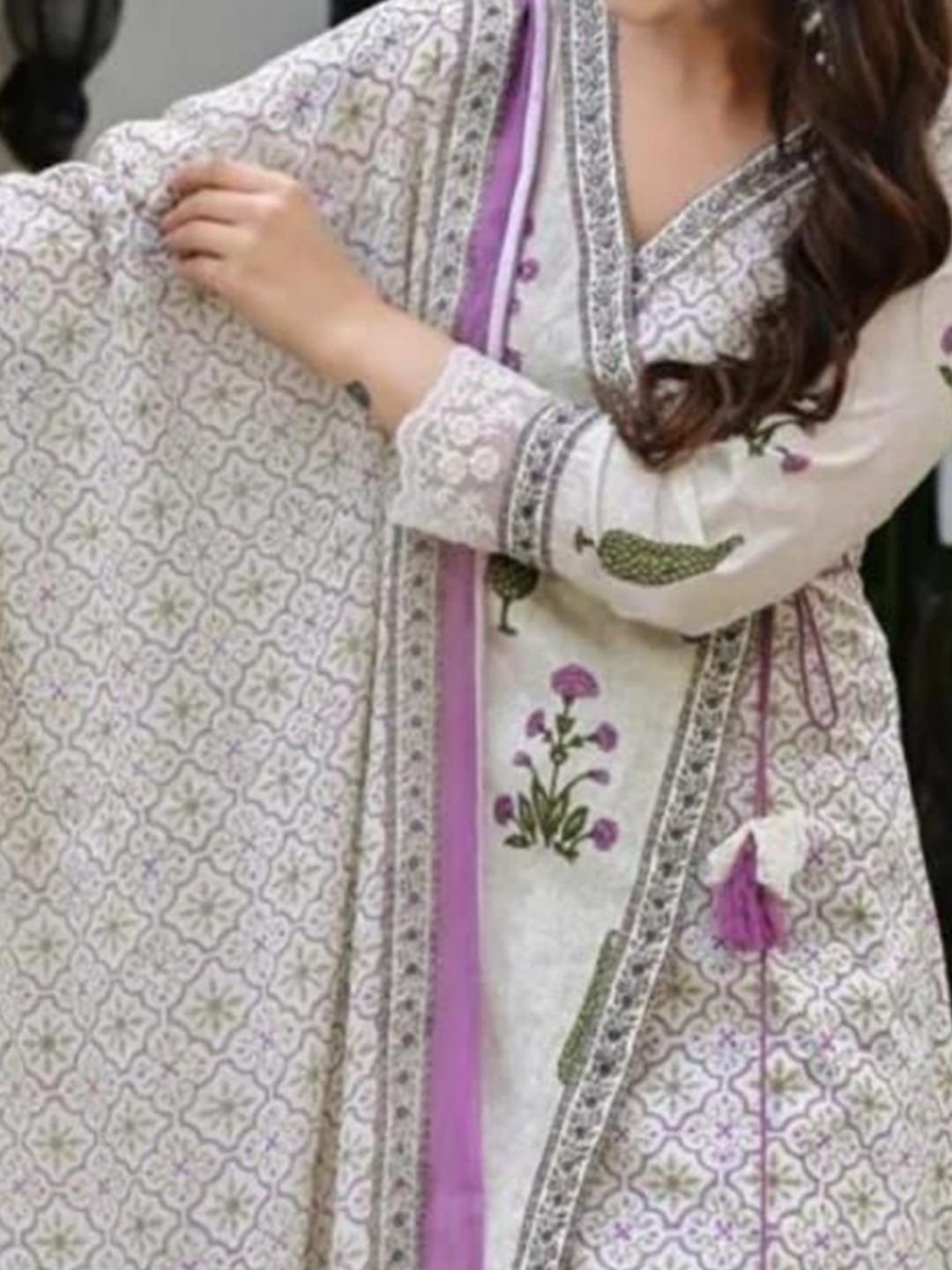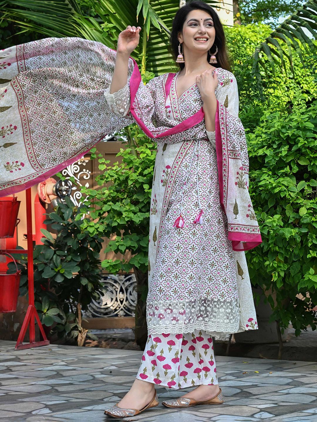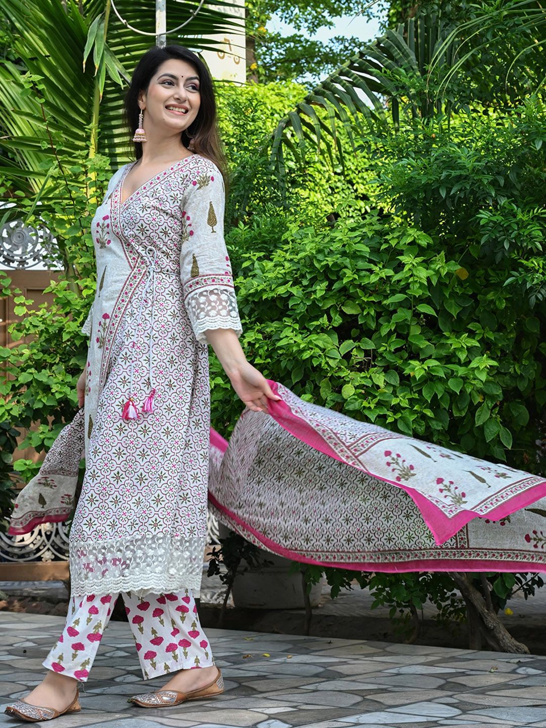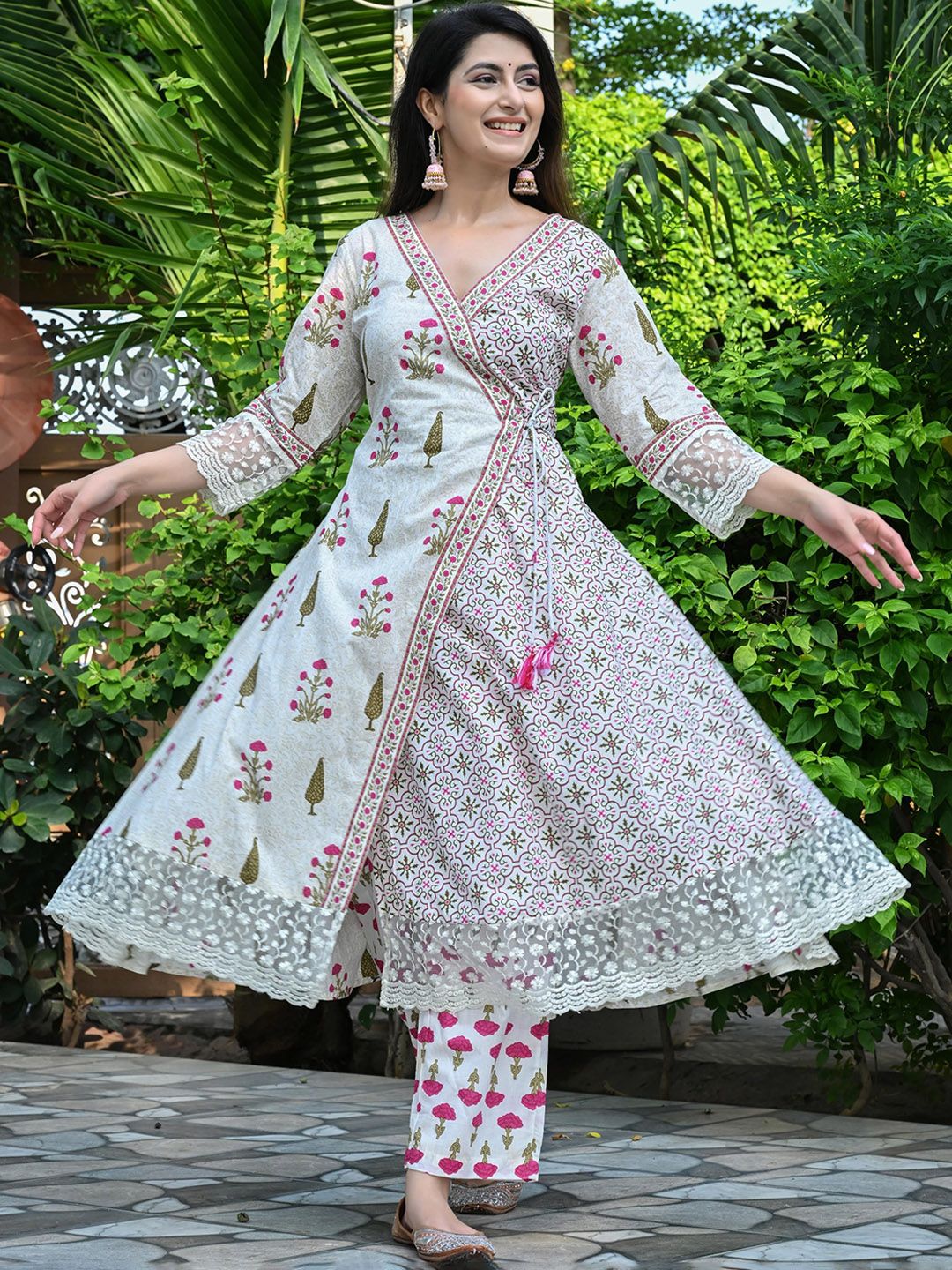 DSS FASHION Women Floral Printed Anarkali Angrakha Knee Length Pure Cotton Kurta Set