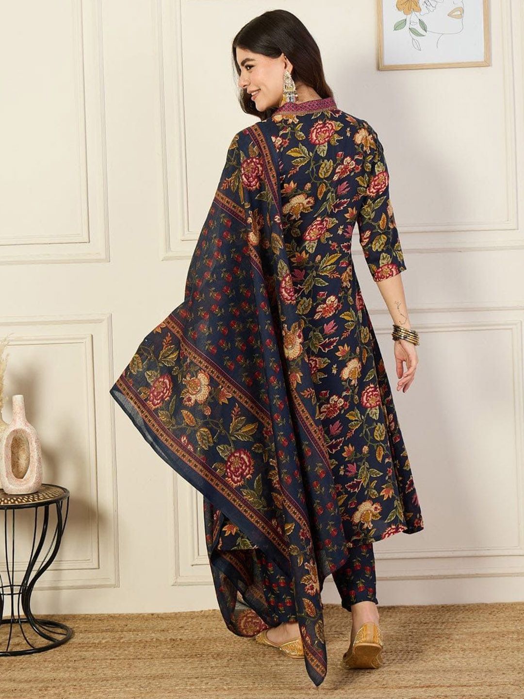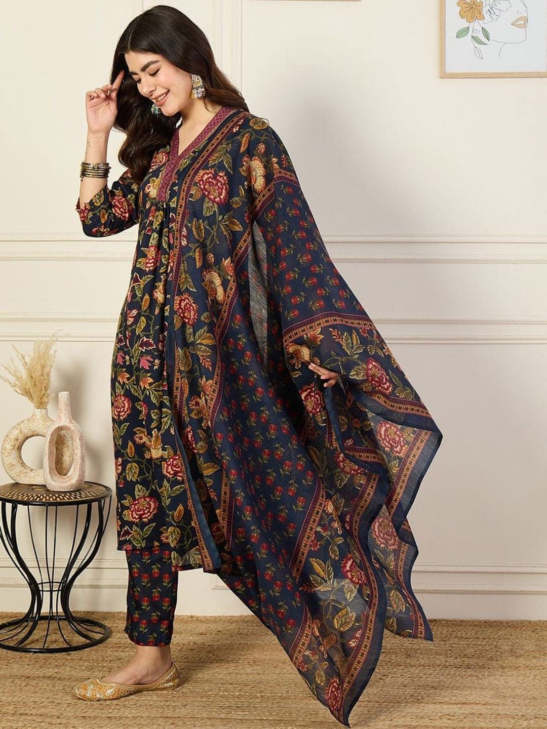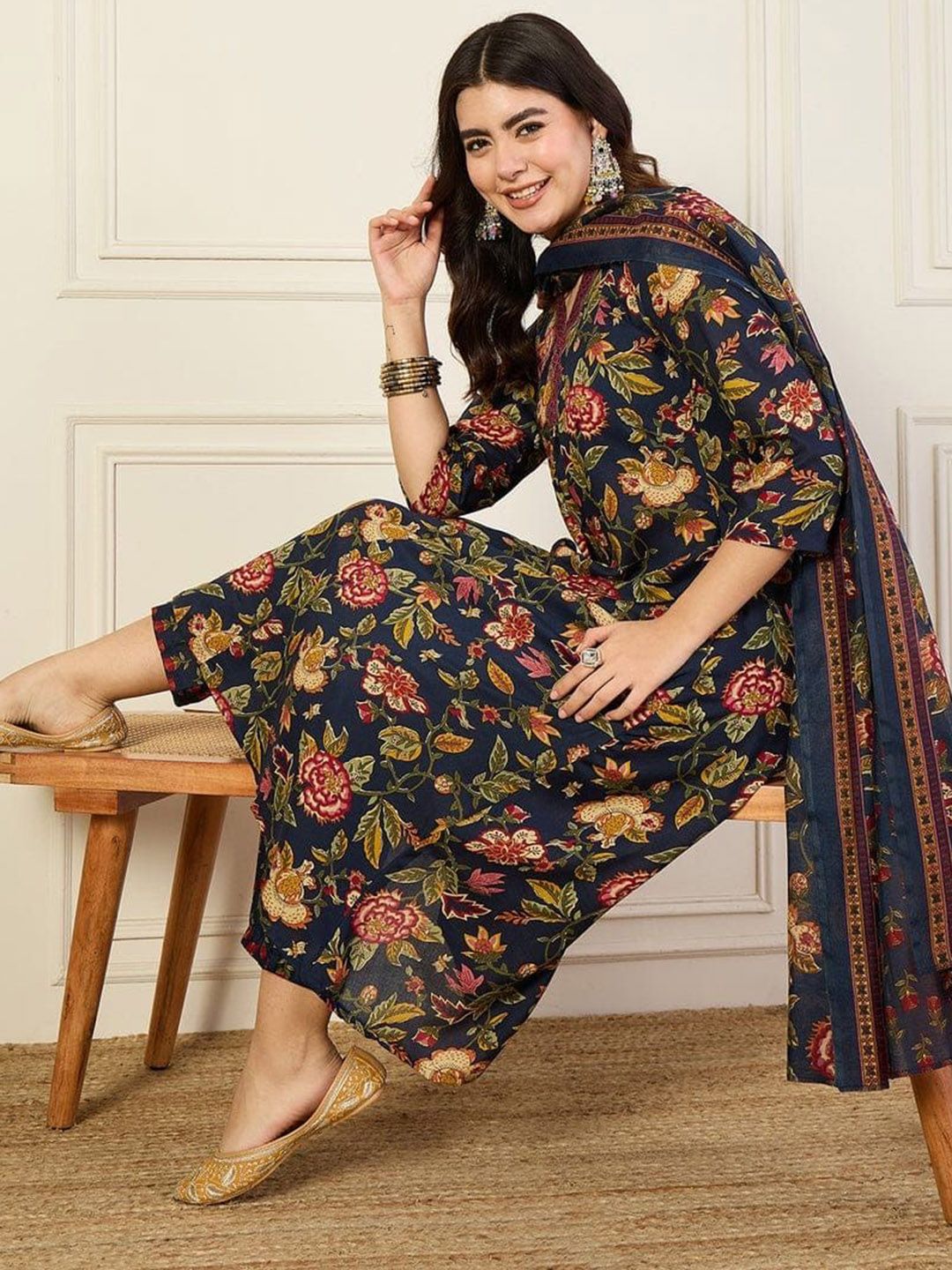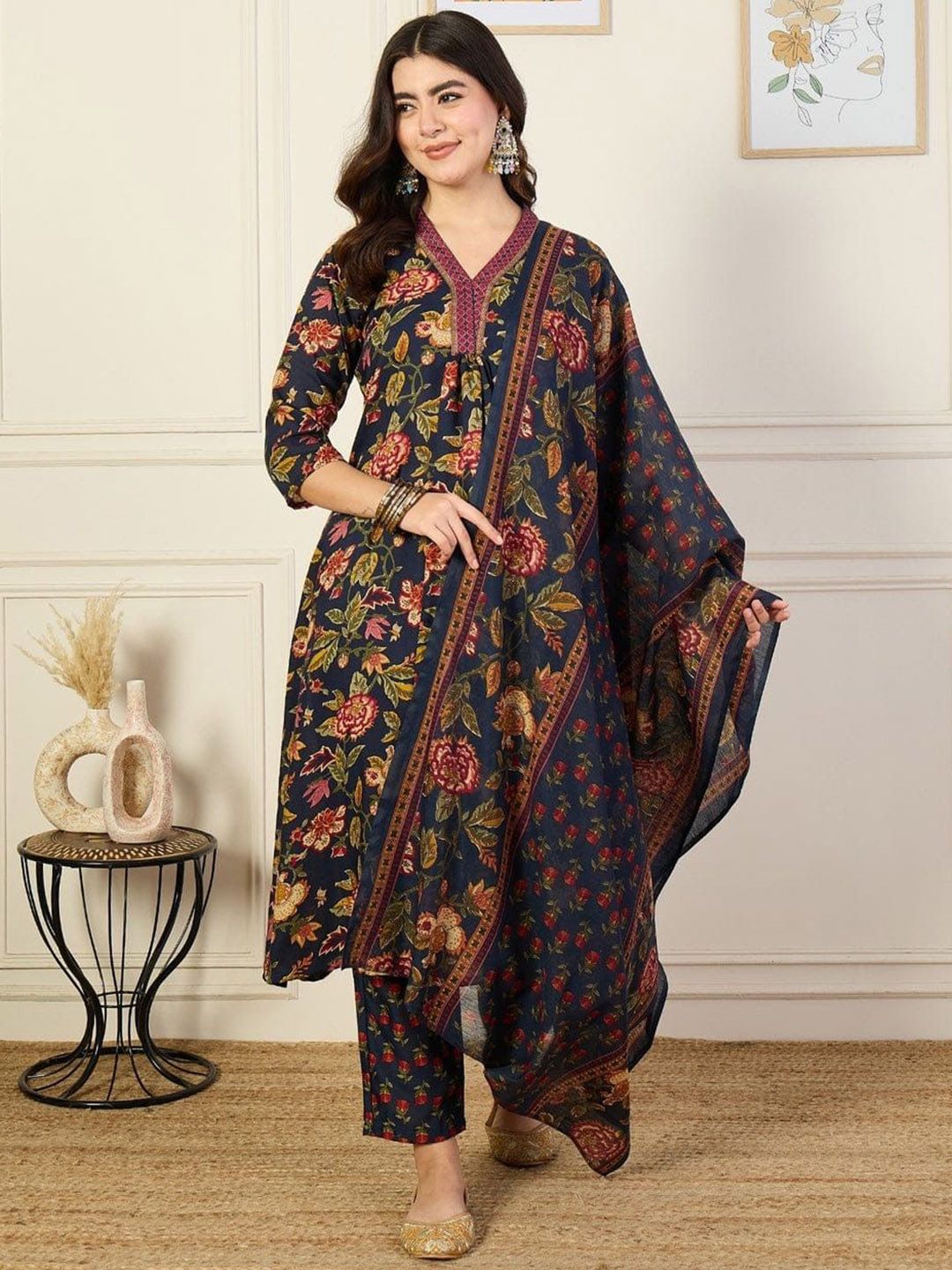 Ethnic 3 You Floral Printed Regular V-Neck Pure Cotton A-Line Kurta With Trouser & Dupatta