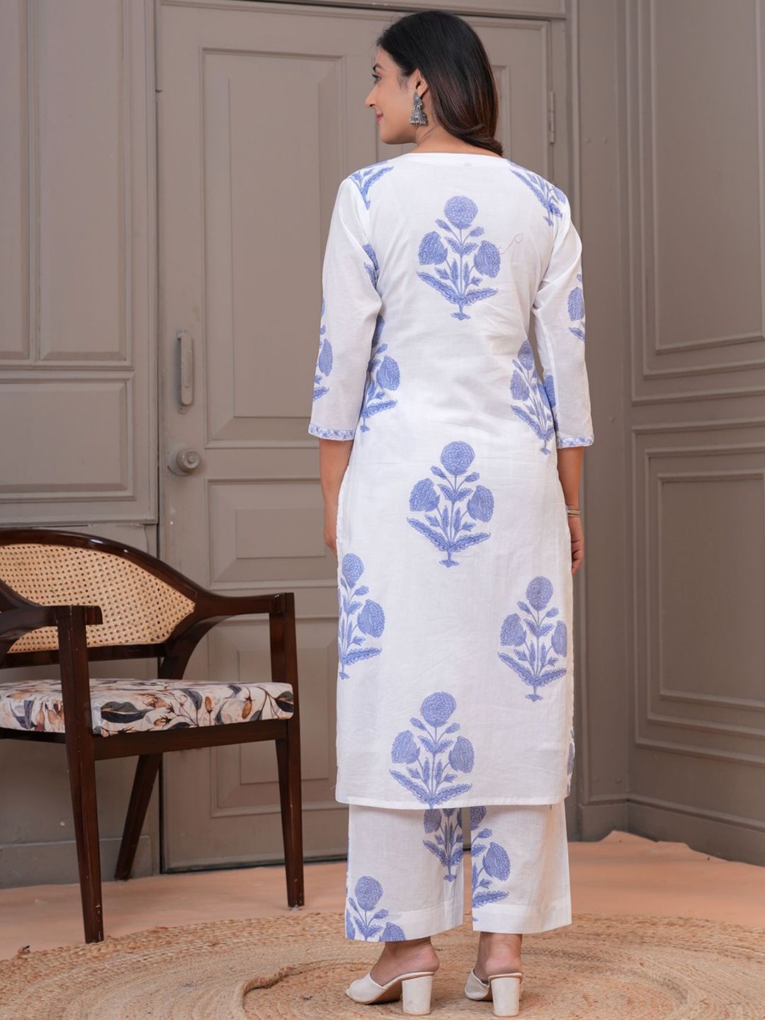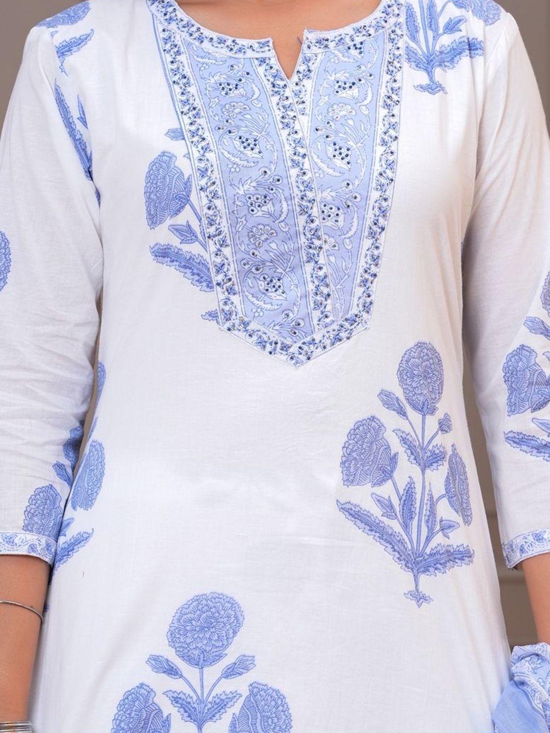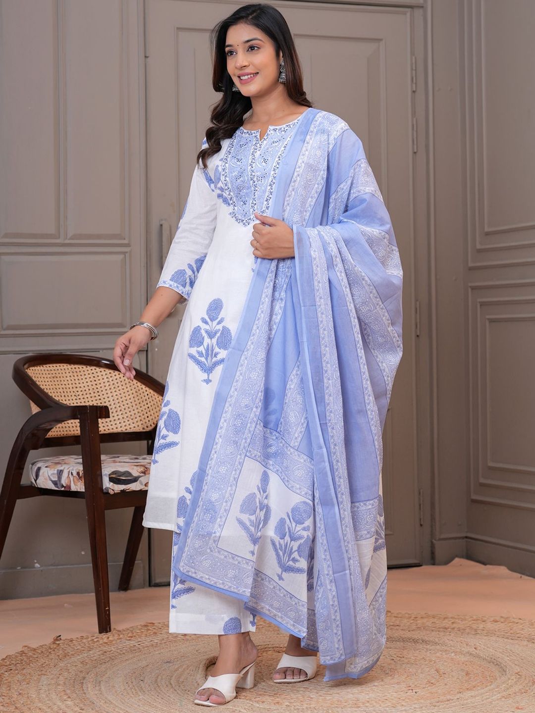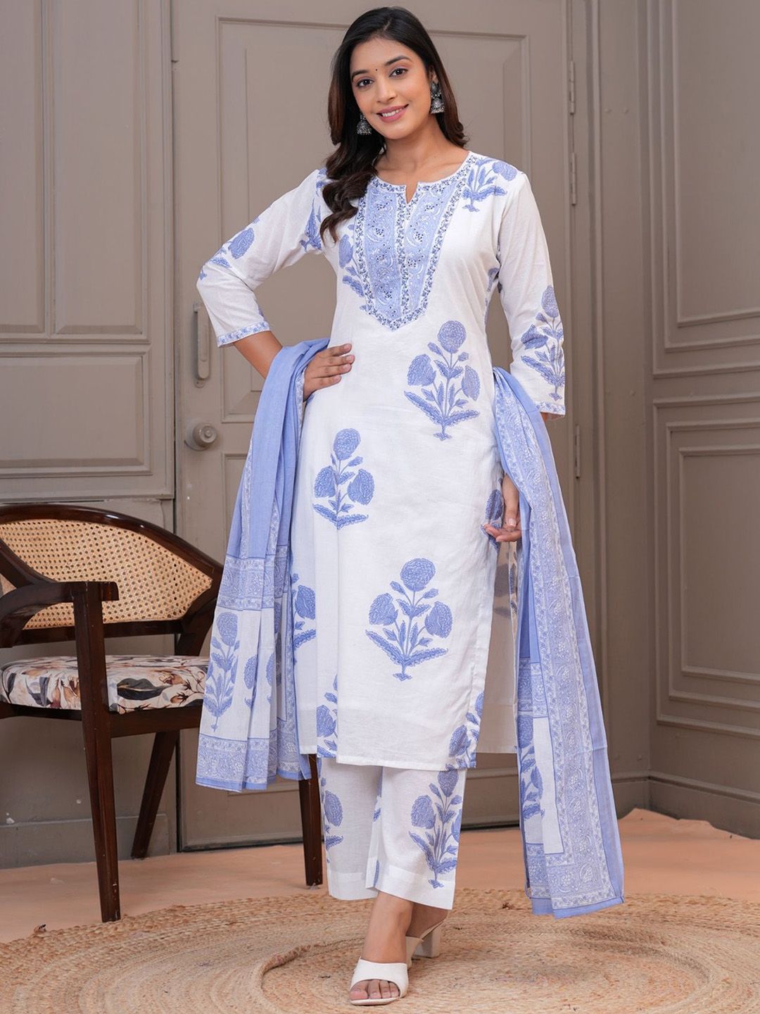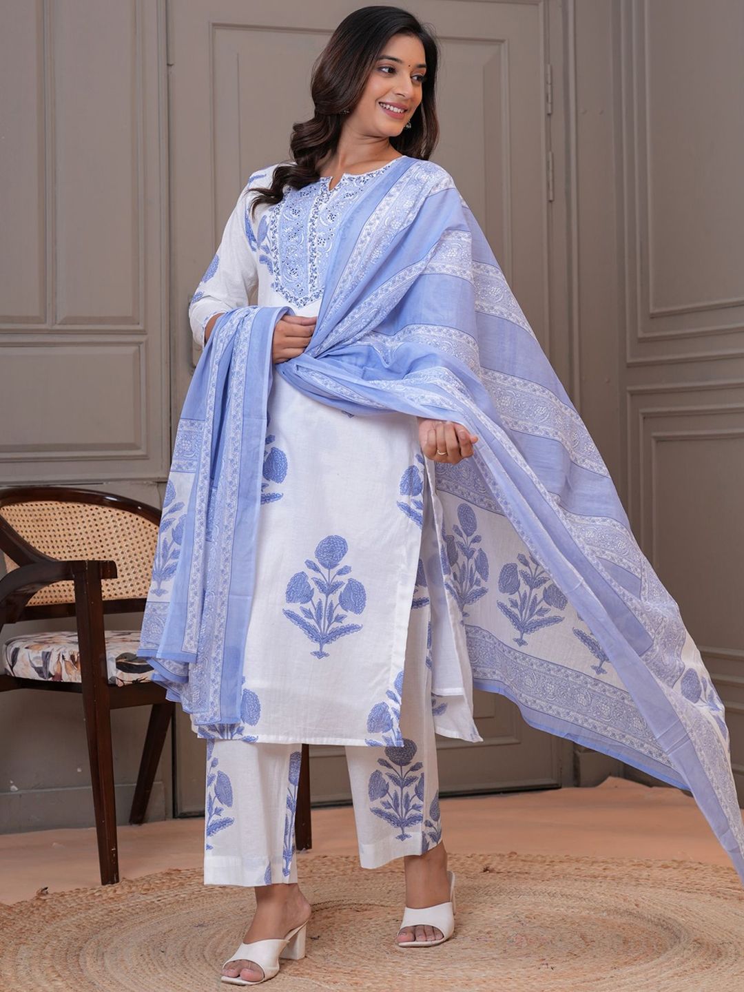 EtnicaWear Women Floral Printed Pure Cotton Kurta with Palazzo & Dupatta