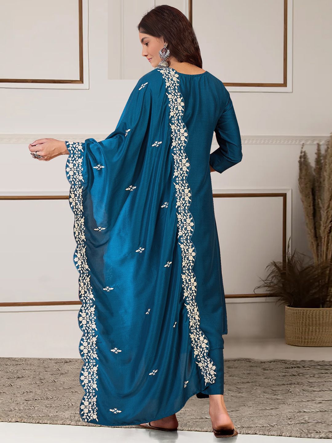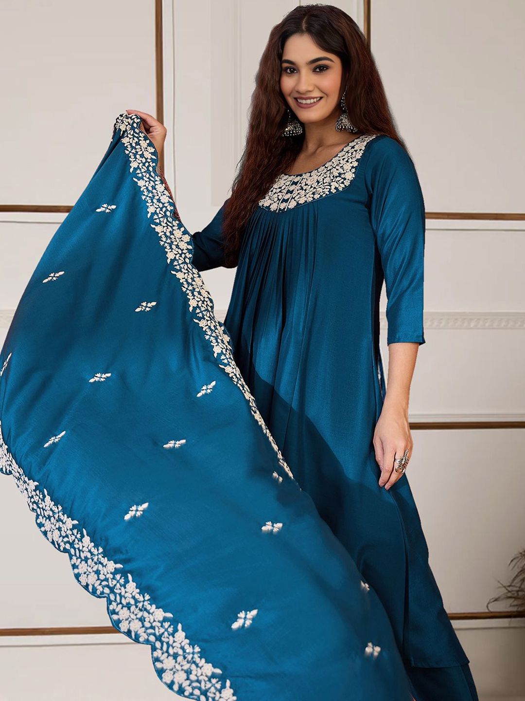 FASHION DREAM Yoke Design Round Neck Thread Work A-Line Kurta With Trousers & Dupatta