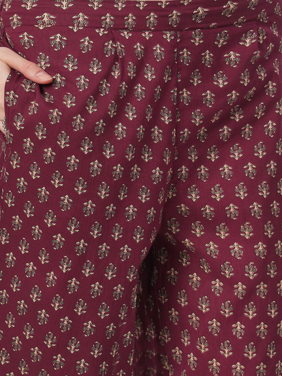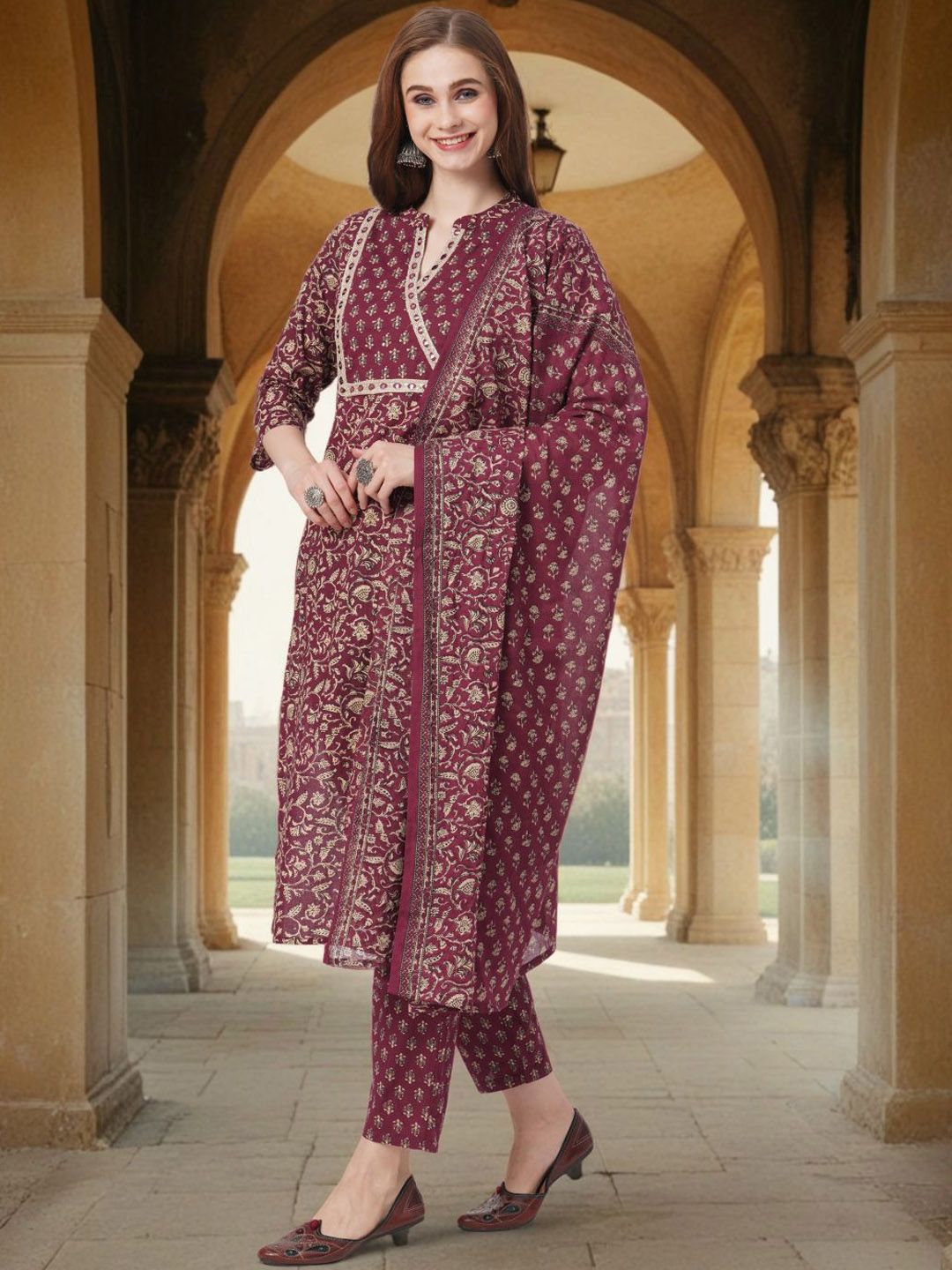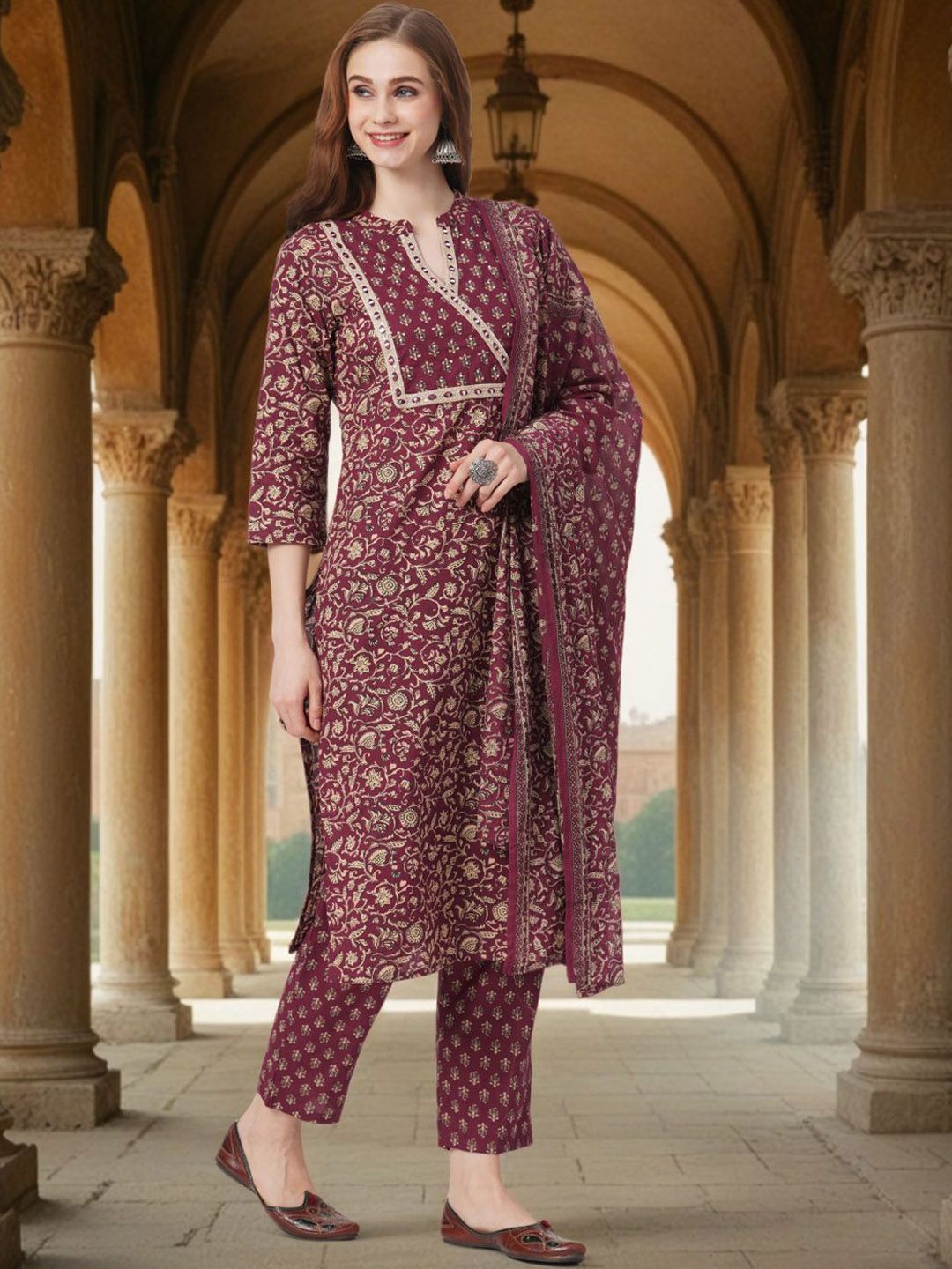 FASHOR Floral Printed Mirror Work Pure Cotton Straight Kurta With Trousers & Dupatta