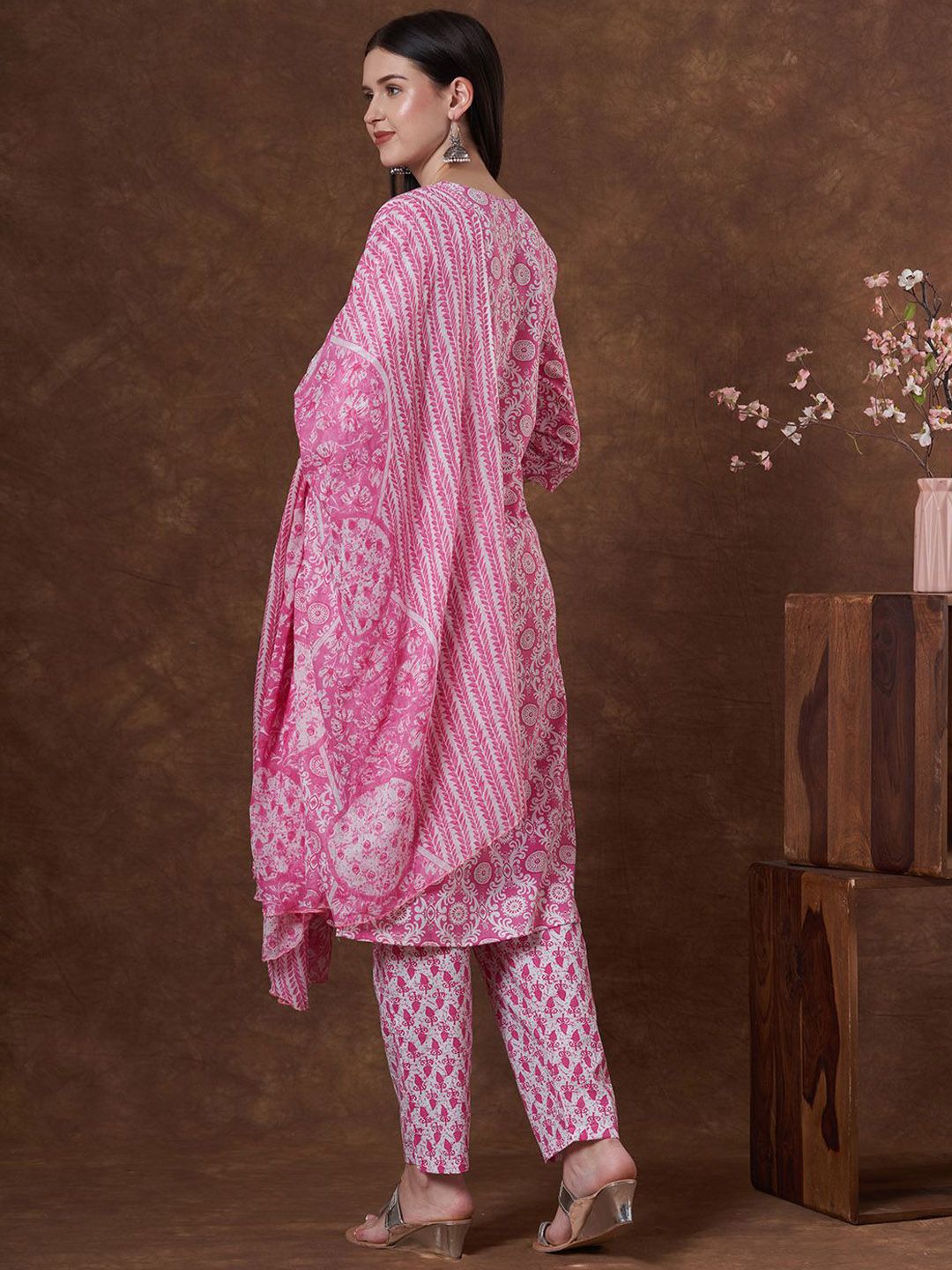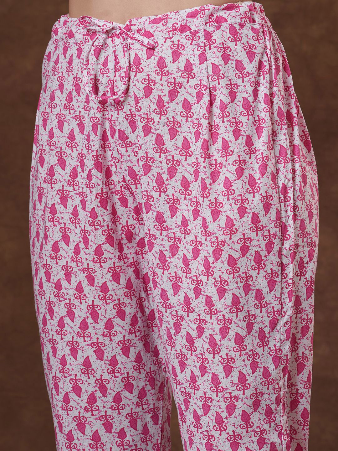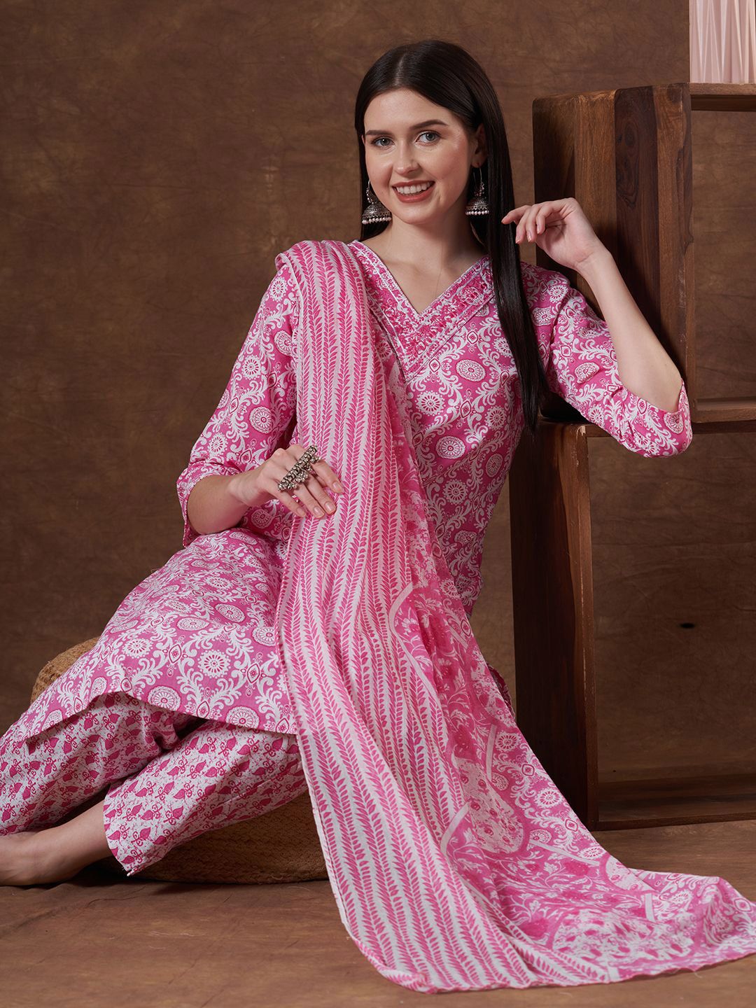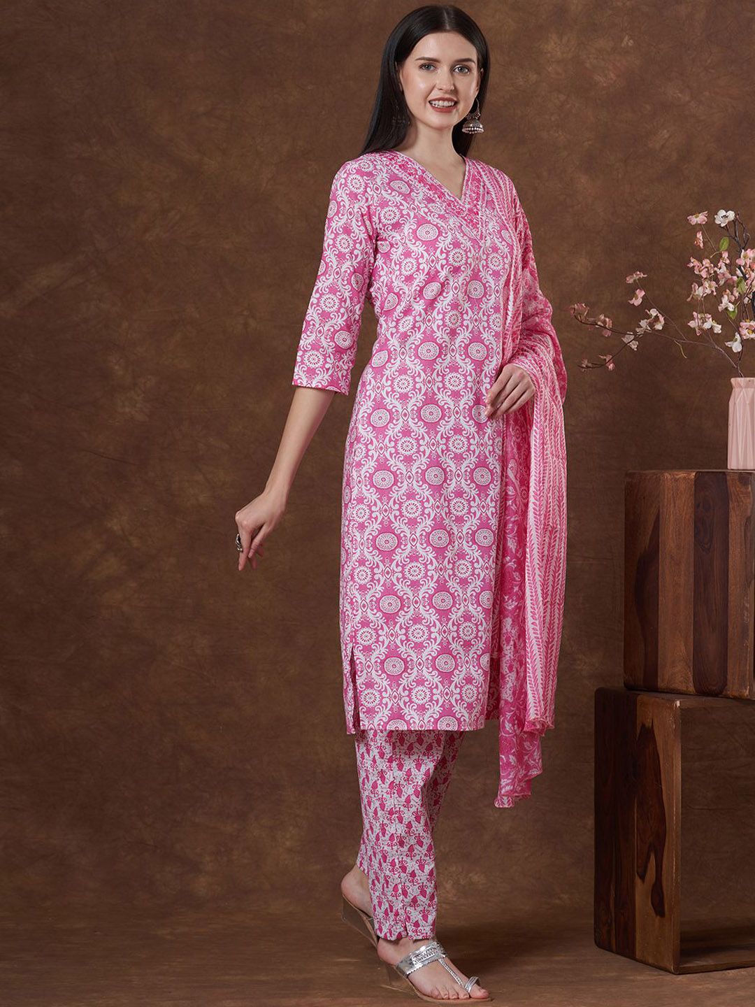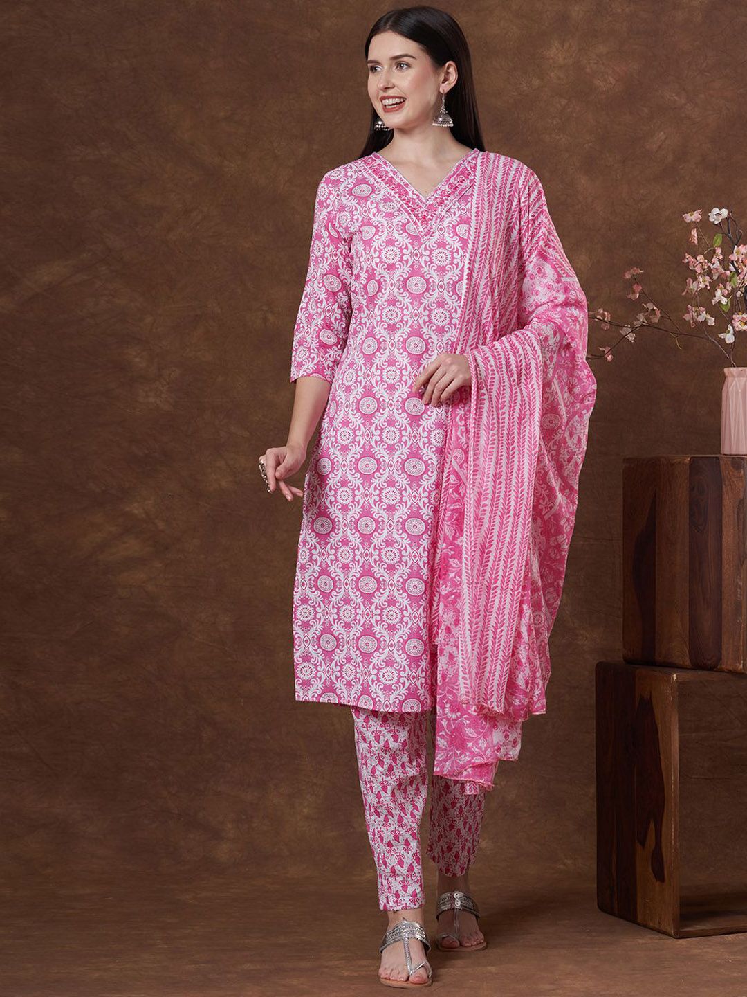 FASHOR Floral Printed V Neck Pure Cotton Straight Kurta & Trousers With Dupatta