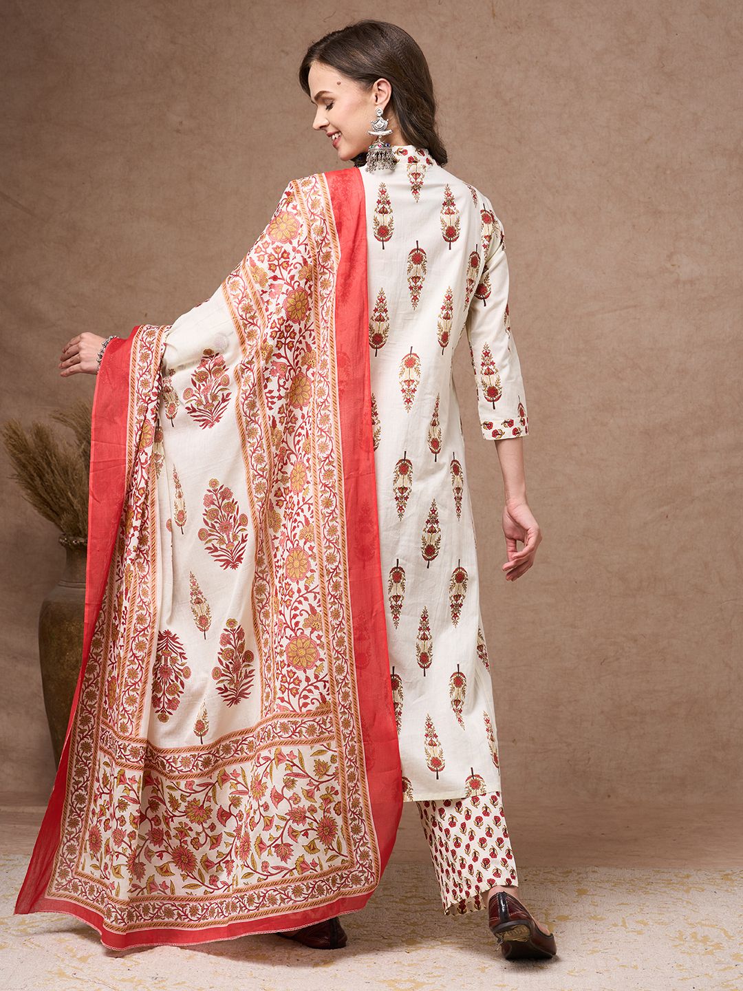 FASHOR Women Ethnic Motifs Printed Cotton Anarkali Kurta with Trousers & Dupatta