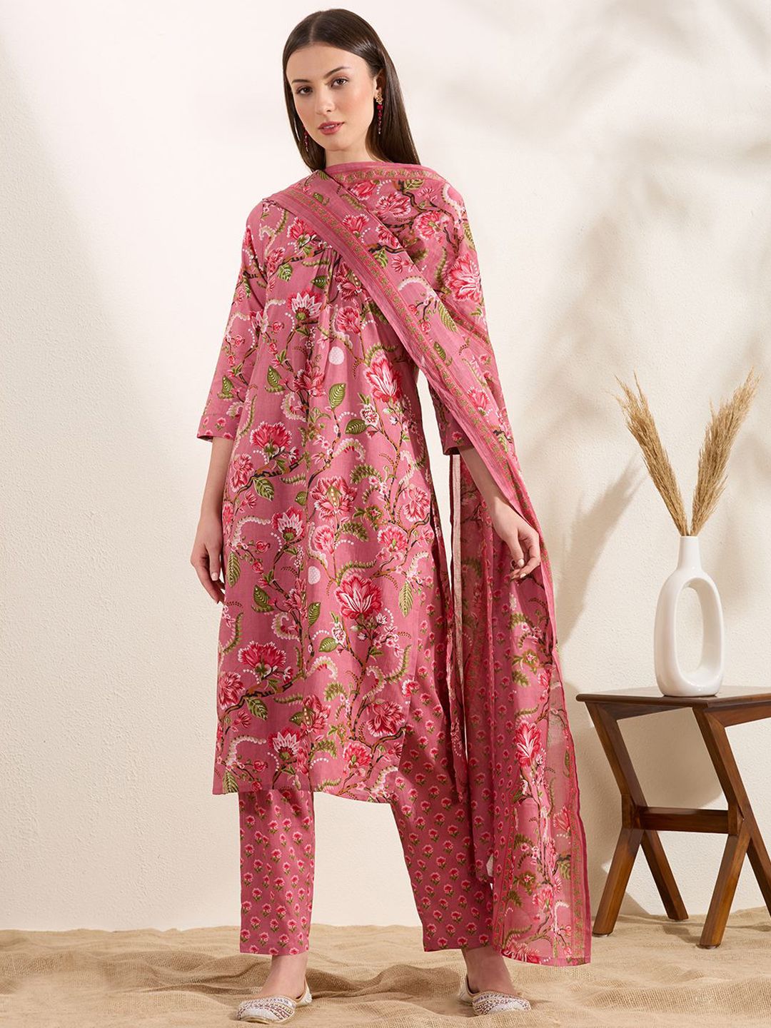 FASHOR Women Floral Printed Beads and Stones Pure Cotton Kurta with Trousers & Dupatta