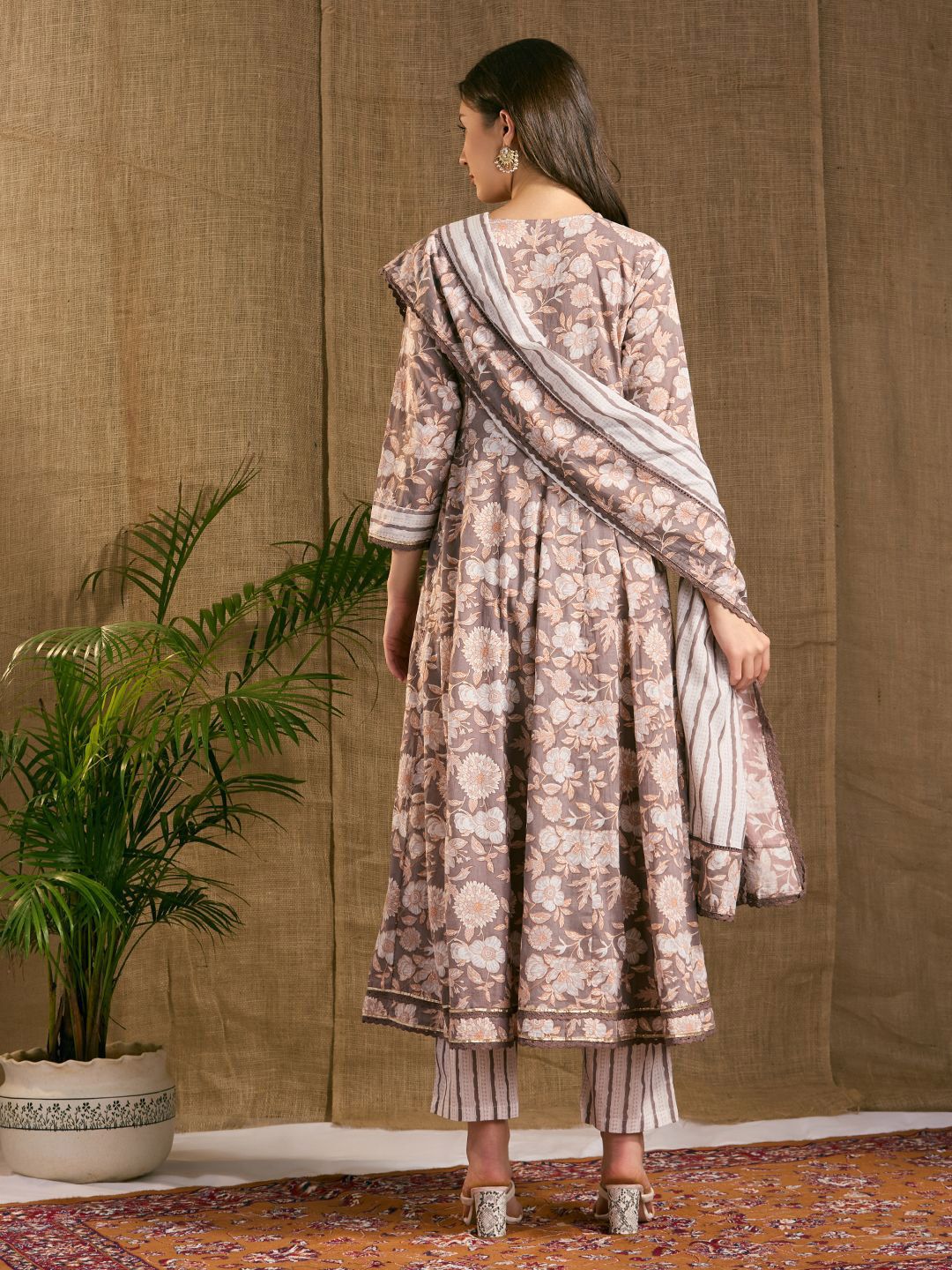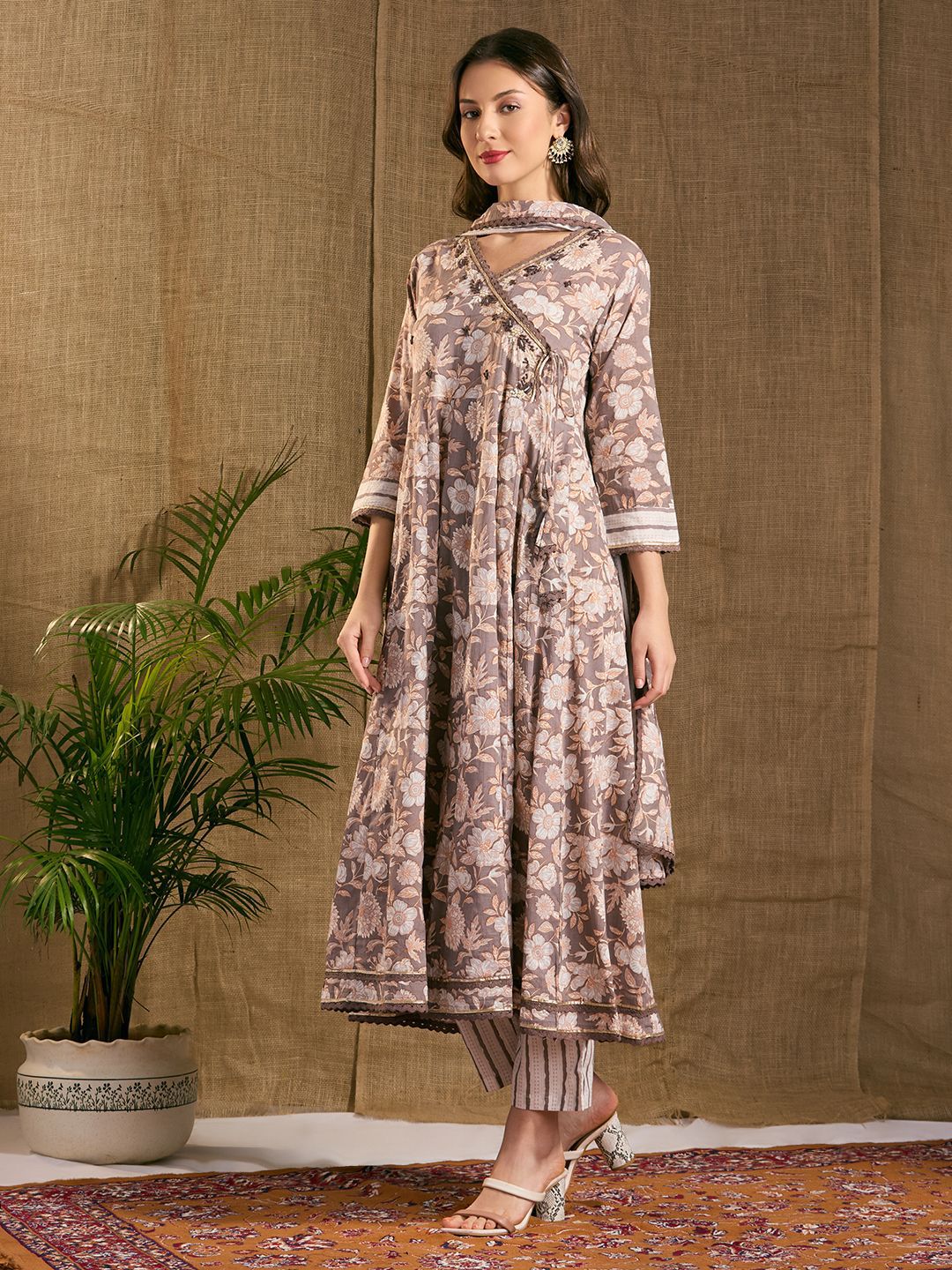 FASHOR Women Floral Printed Cotton Anarkali Kurta with Trousers & Dupatta