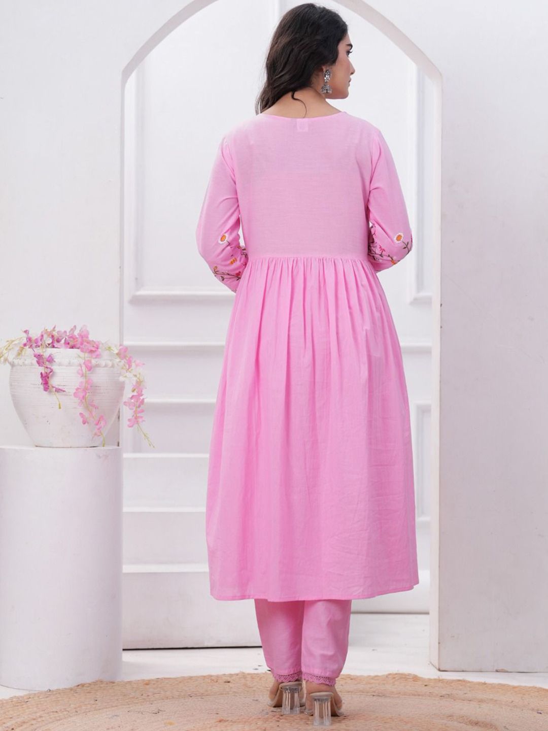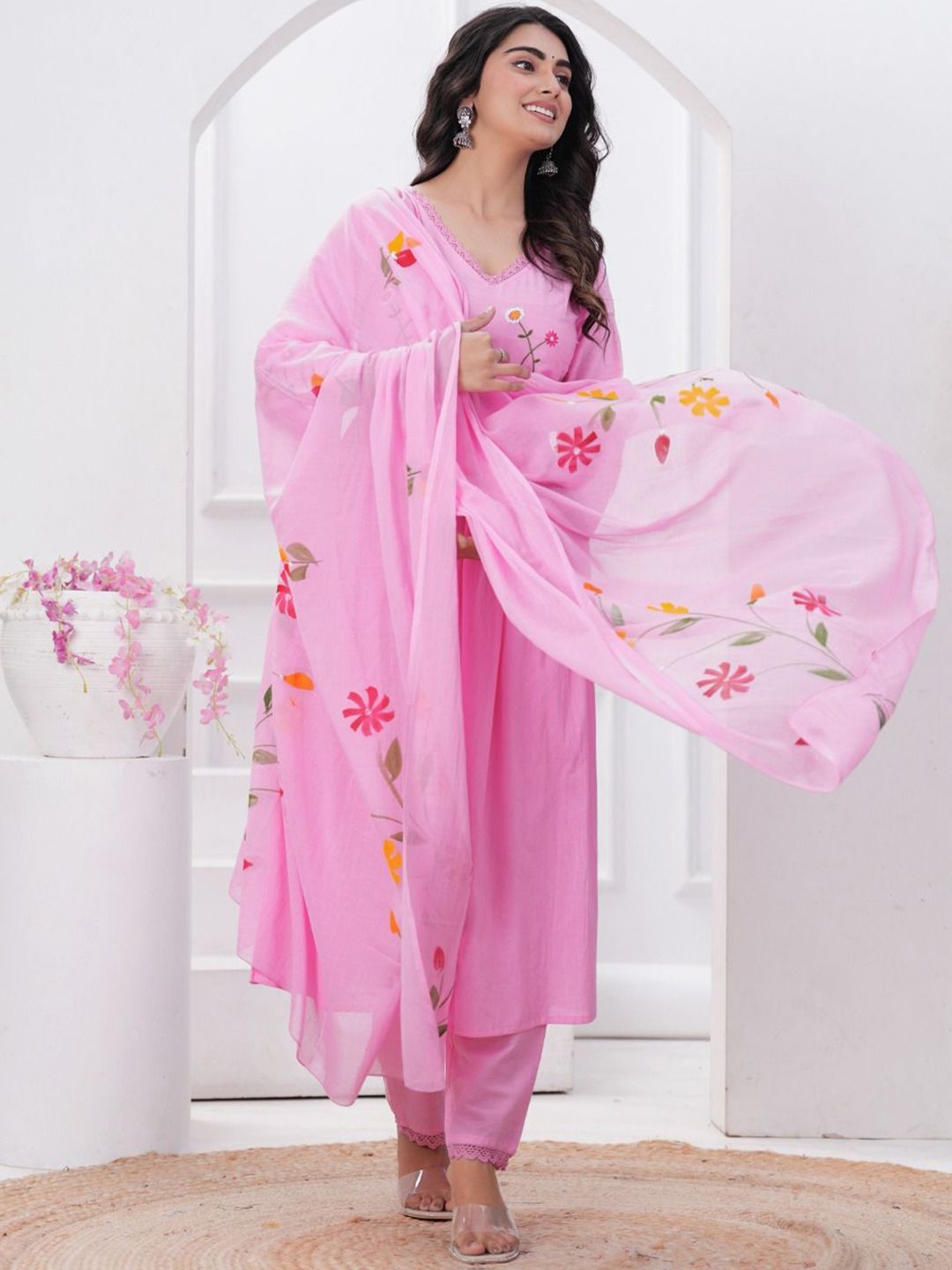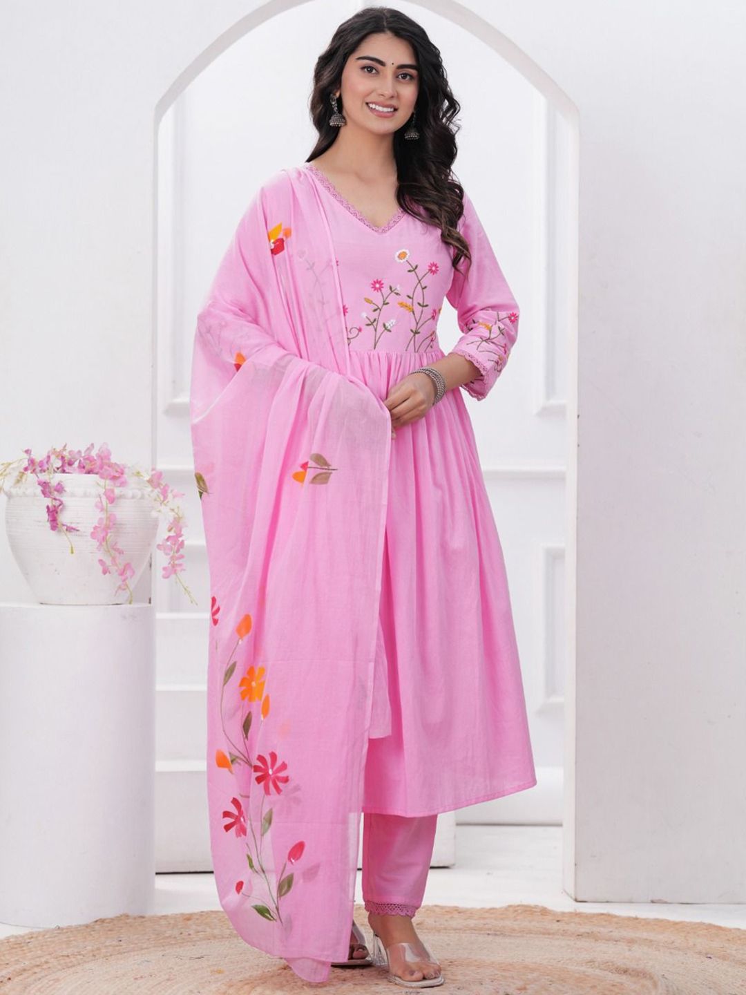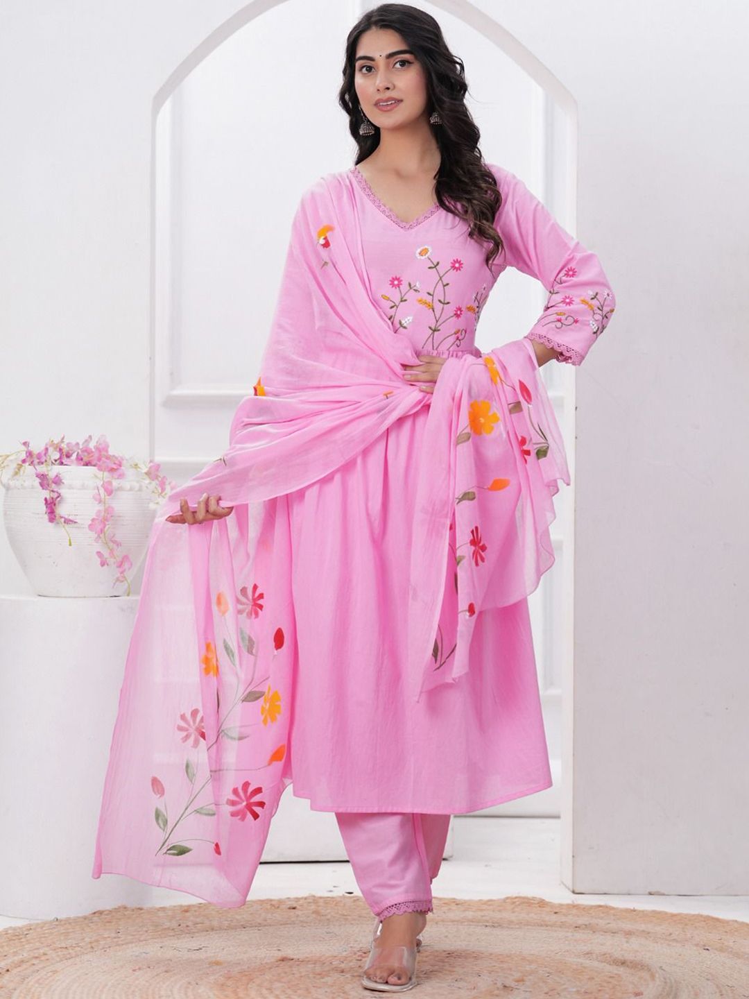 FCV Women Floral Embroidered Regular Thread Work Pure Cotton Kurti with Salwar & With Dupatta