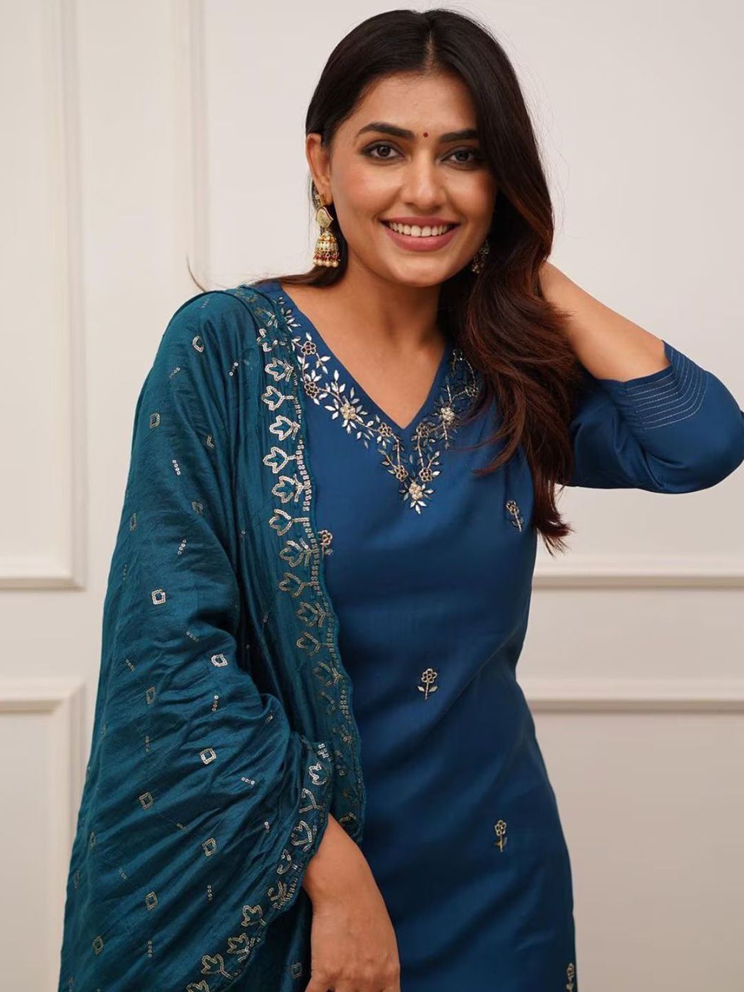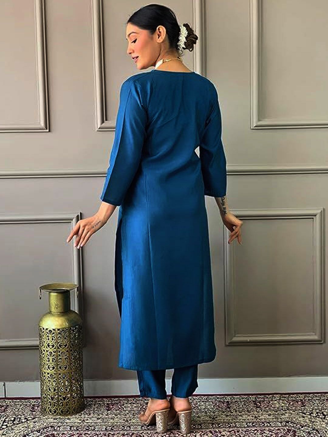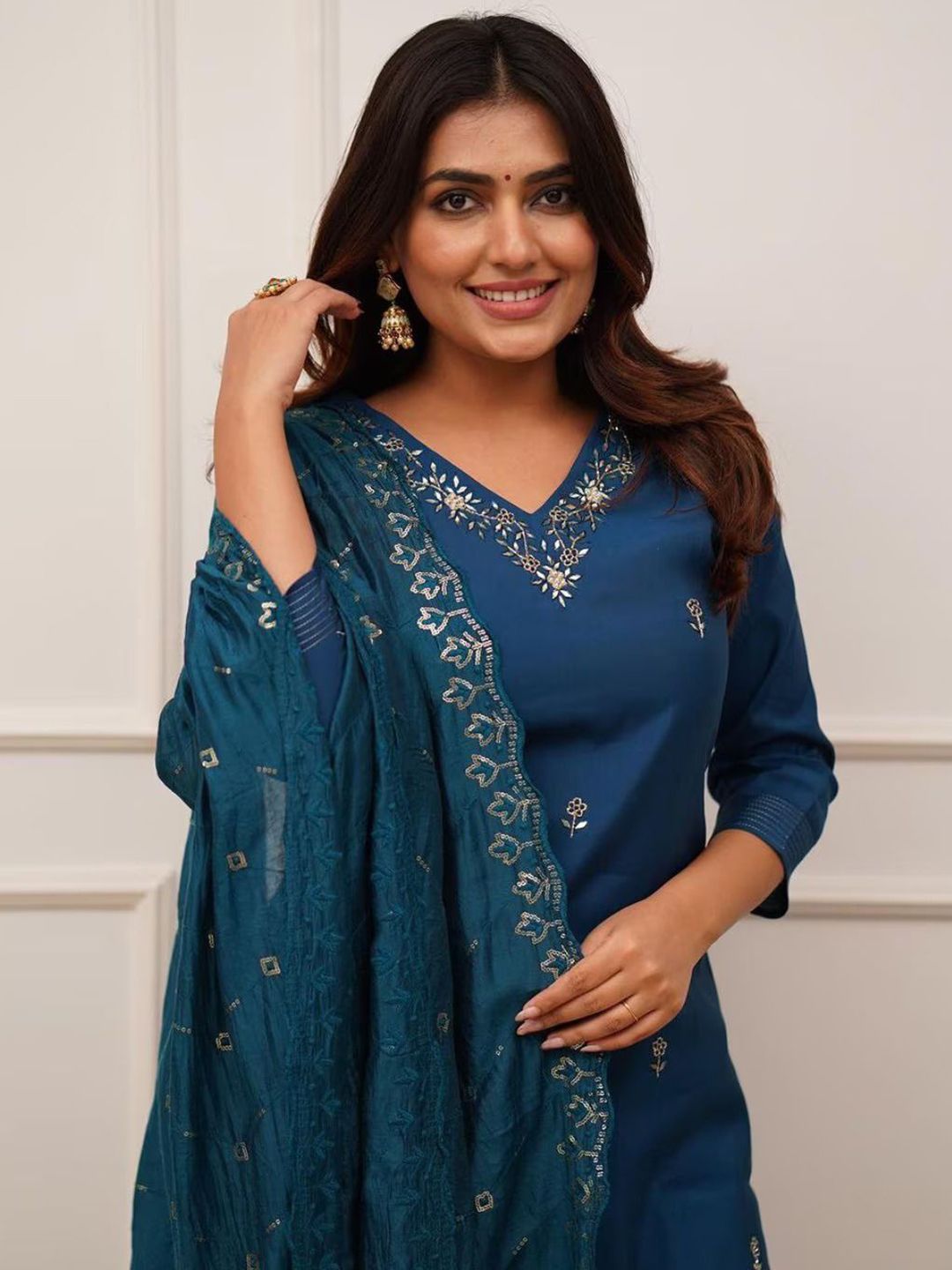 FoxDX Women Floral Embroidered Silk Kurta with Trousers & Dupatta