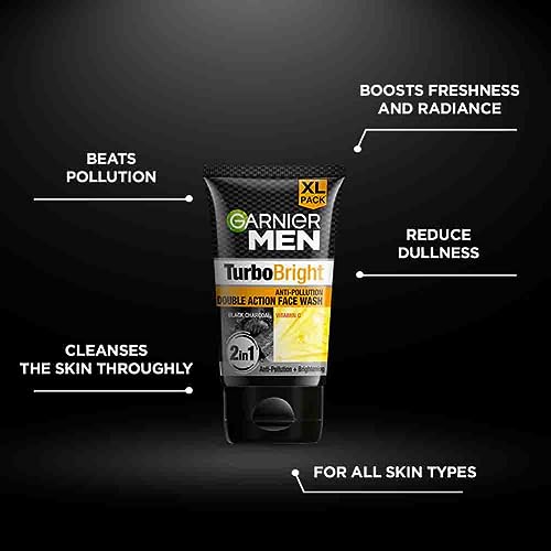 Garnier Men Turbo Bright Double Action Face Wash, Deep Cleansing Anti Pollution Face Wash with Charcoal and Vitamin C, Suitable for all Skin Types, 150g x2 (Pack of 2)