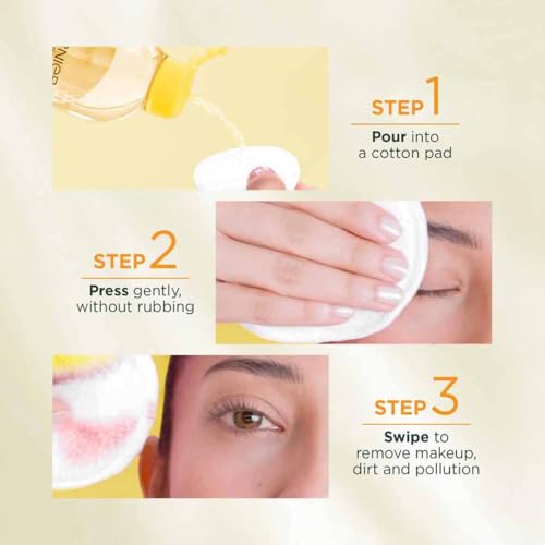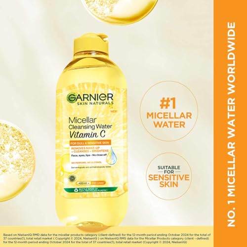 REMOVES DIRT AND POLLUTION: The effective micelles in Garnier Vitamin C Micellar Water lift away upto 100% of makeup alongside dirt and impurities without over-drying your skin. The Vitamin C in Micellar Water helps to brighten skin and remove dullness. ONE-SWIPE CLEANSE: The Garnier Vitamin C Micellar Water cleanses impurities, removes makeup, and brightens skin in a go. The Garnier Micellar Water removes dirt and dullness without harsh scrubbing or rinsing. VITAMIN C-RICH FORMULA: Infused with the powerful antioxidant of Vitamin C, the Garnier Micellar Water combats dullness, restores glow, and delivers instantly bright skin on the go. Vitamin C also gives you an even tone and a healthy looking skin. SUITABLE FOR ALL SKIN TYPES: Due to its gentle formula, all skin types can experience the benefits of Vitamin C Micellar Water. This micellar water for bright skin works effectively on dull and sensitive skin. CLEAN FORMULA: The Garnier Vitamin C Micellar Water is cruelty-free, vegan, and formulated without alcohol, oils, fragrances, parabens, and sulfates. Committing to green beauty, the Garnier Micellar Water uses recyclable bottles made from 100% Recycled Plastics.