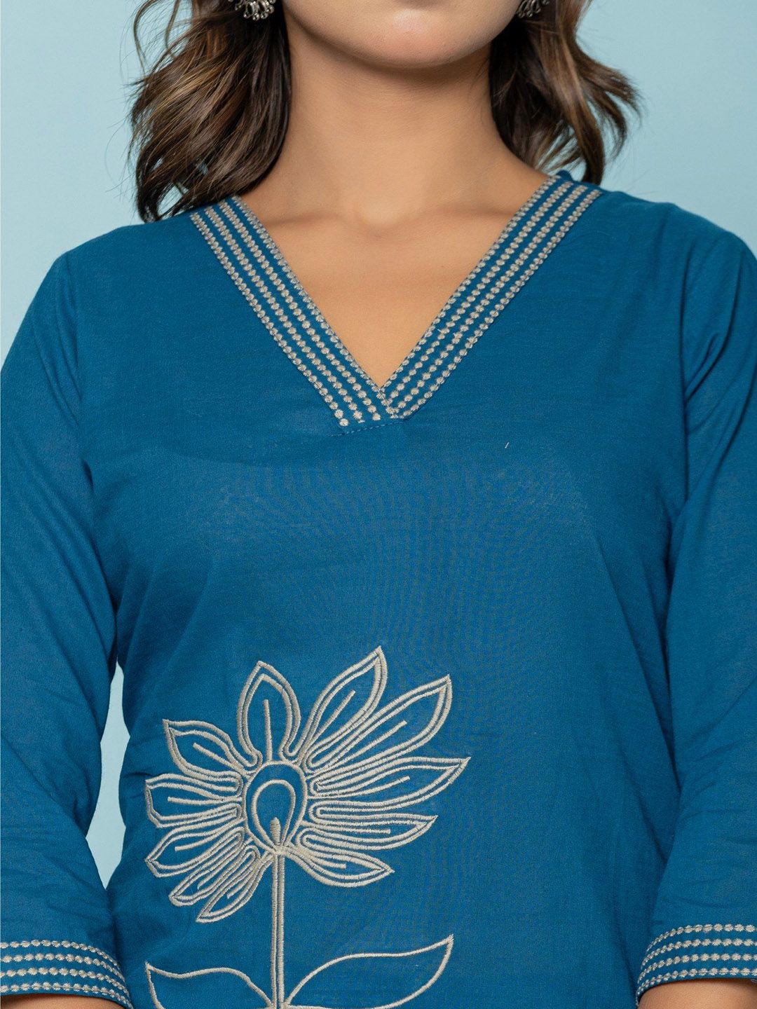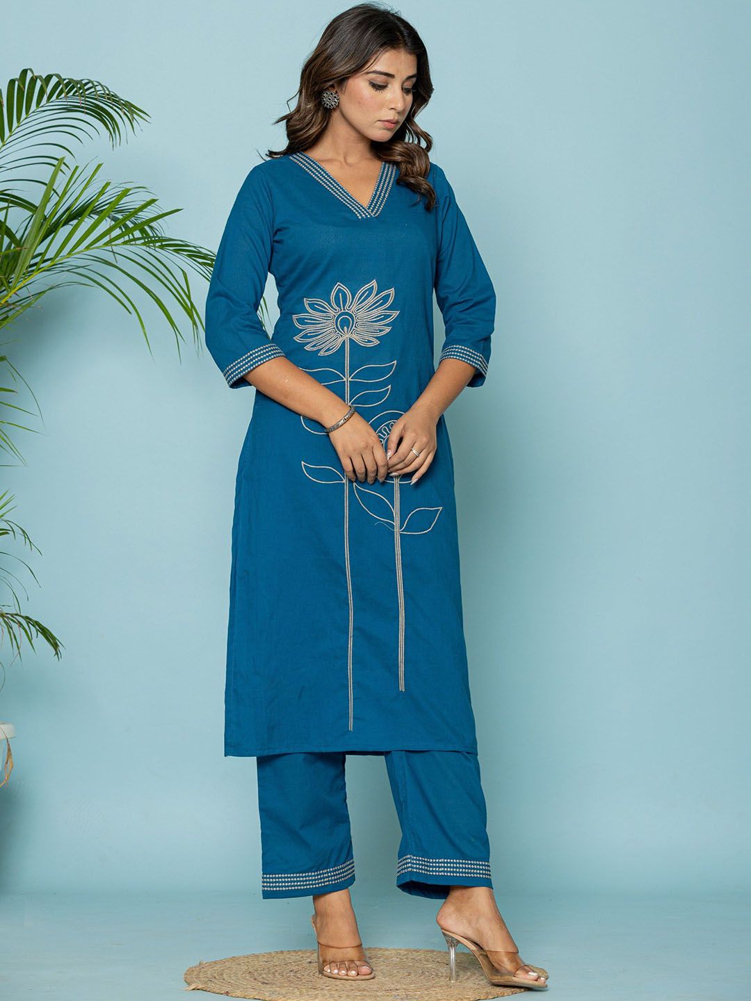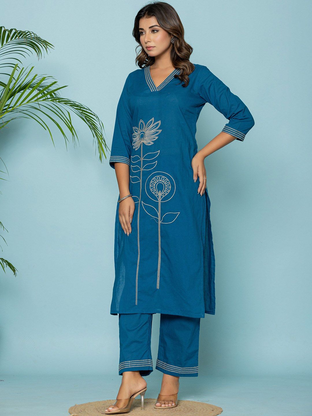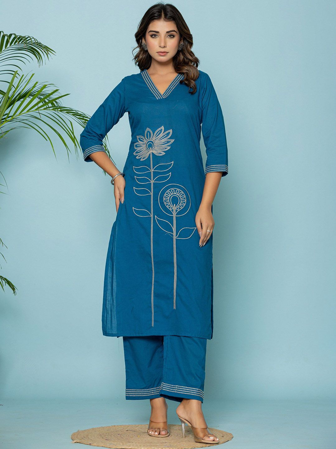 GHUMMAN SONAKSHI Floral Embroidered Straight Thread Work Pure Cotton Kurta With Palazzos