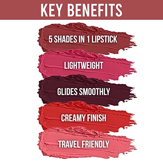 5-in-1 formula for versatile use Bold, rich red color for an eye-catching look Long-lasting, matte finish for all-day wear Infused with nourishing ingredients like Vitamin E and Shea Butter Hydrates and protects lips from dryness and chapping Sleek and elegant packaging for easy portability