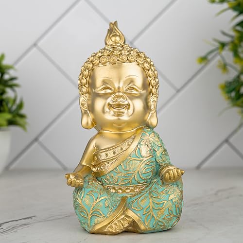 Global Grabbers Laughing Buddha Baby Monk Idol Statue Showpiece Home Decor Items for Living Room and Gifts (Golden Green)