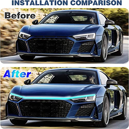 Brighter LED Beads: This car hood light strip is built with 5050SMD high quality lamp beads, super brightness. Cool Car Accessories: This led car lights has dynamic Scan Start-up Effect and it will make your car even cooler. In addition, with an eye-catching light, the led lights exterior can increase the lighting of the car at night, ensure your travel safety. High Quality Material: Hood light strip is made of silicone, non-heating elastic material. It can be bent at your will and has a long lifespan. Soft and safe. Easy to Install: Car hood led strip with super glue on the back, which is strongly sticky. It can be attached easily to the gap of the hood. The red wire is connected to ACC insurance, black wire is connected to the negative pole. Wide Application: LED car strip lights is suitable for all cars and trucks. It can be used as car hood lights, car door lights, turn light, daytime running lights, pedal lights, etc., even can be used as home decoration.