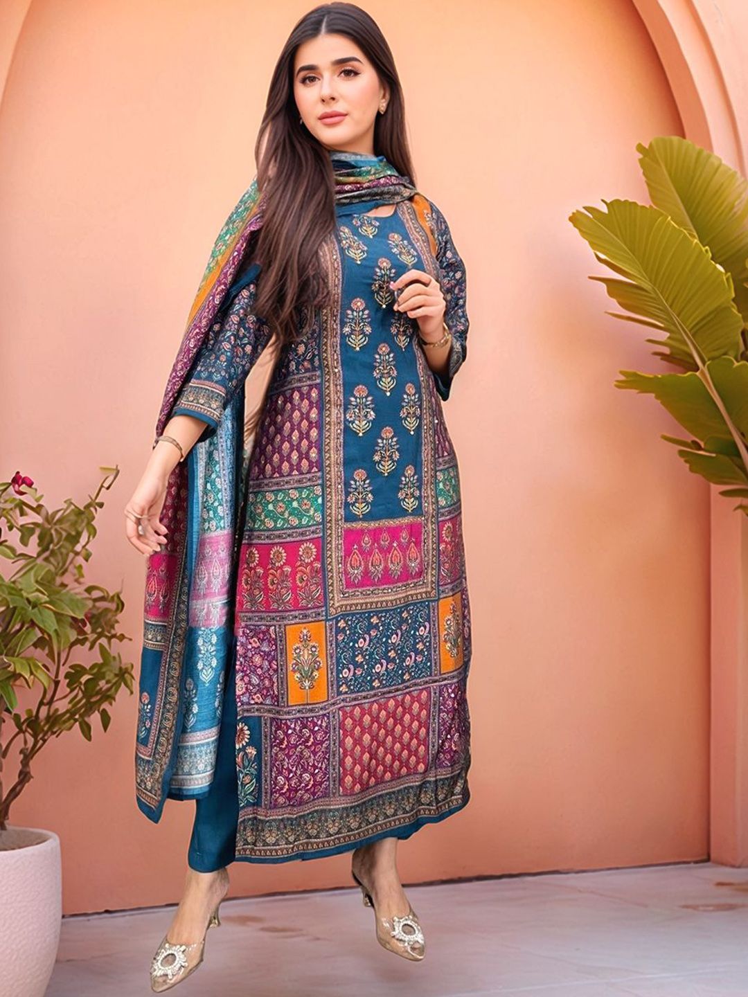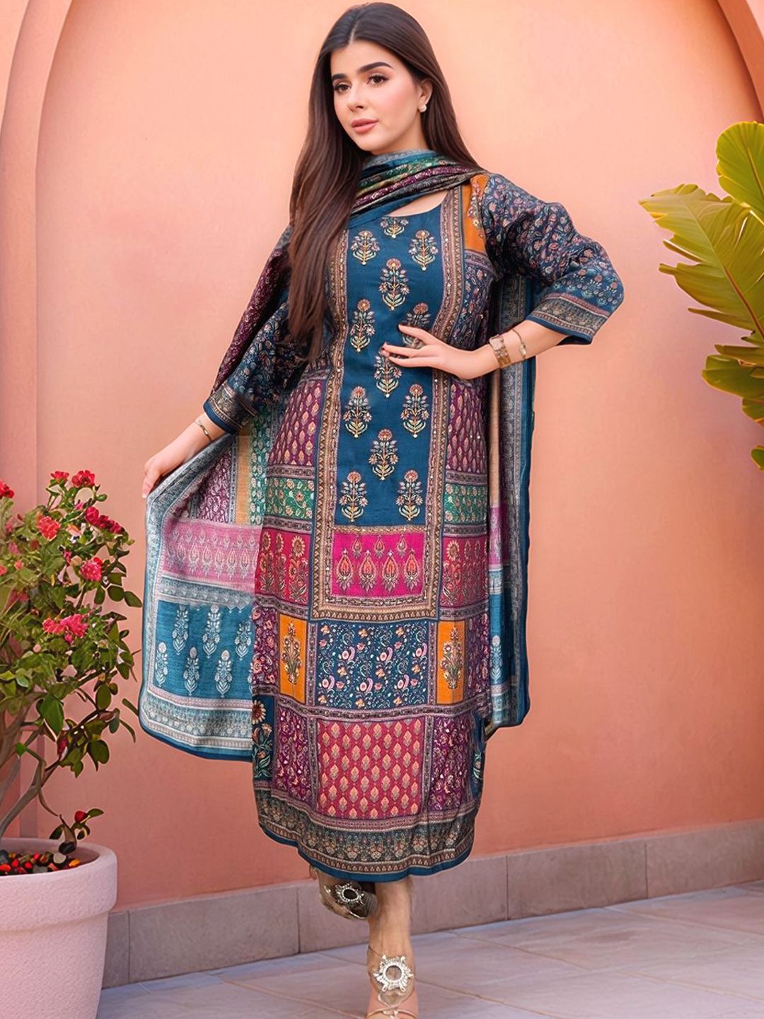 GoSriKi Ethnic Motifs Printed Round Neck Straight Kurta & Trousers With Dupatta