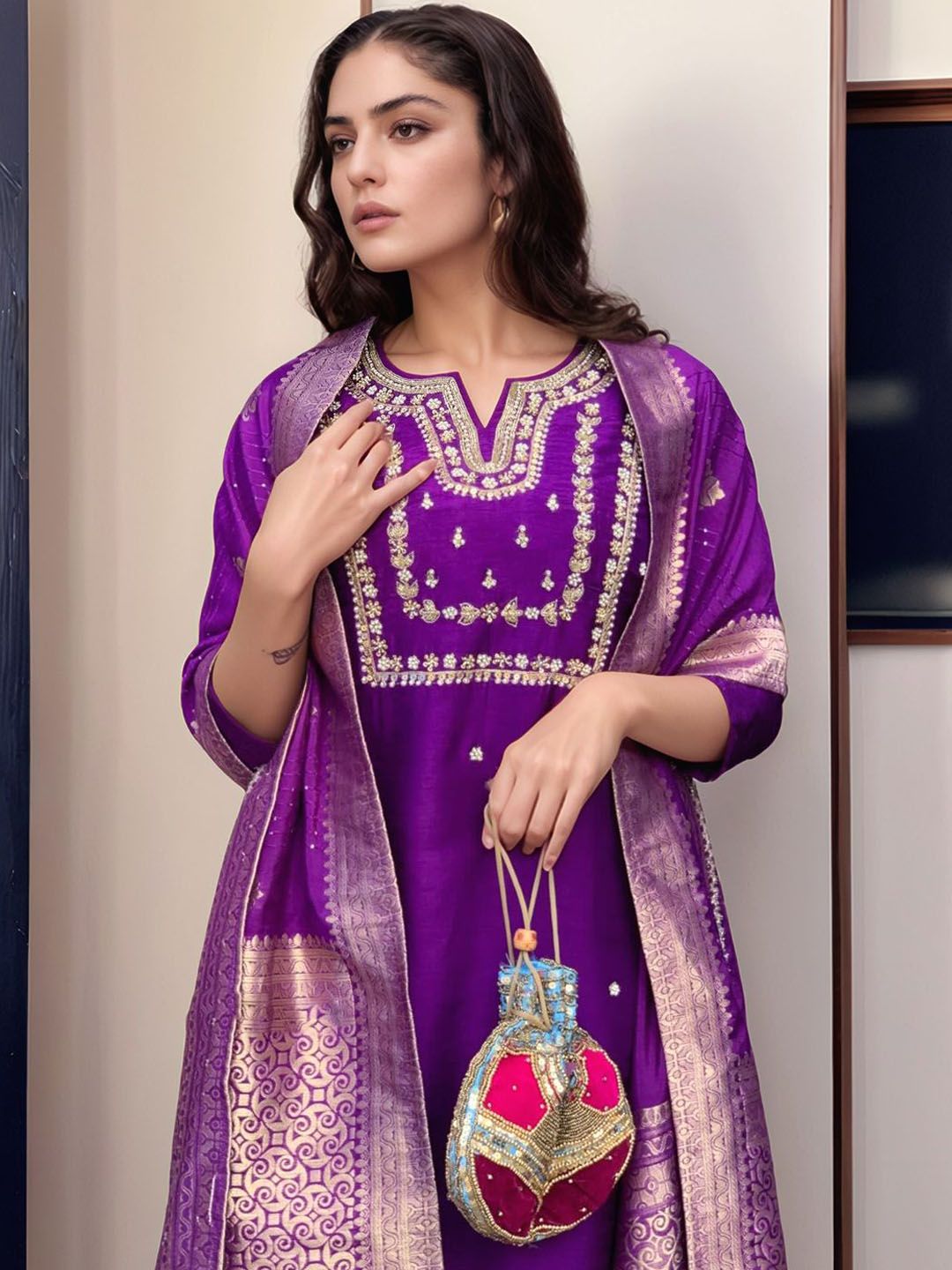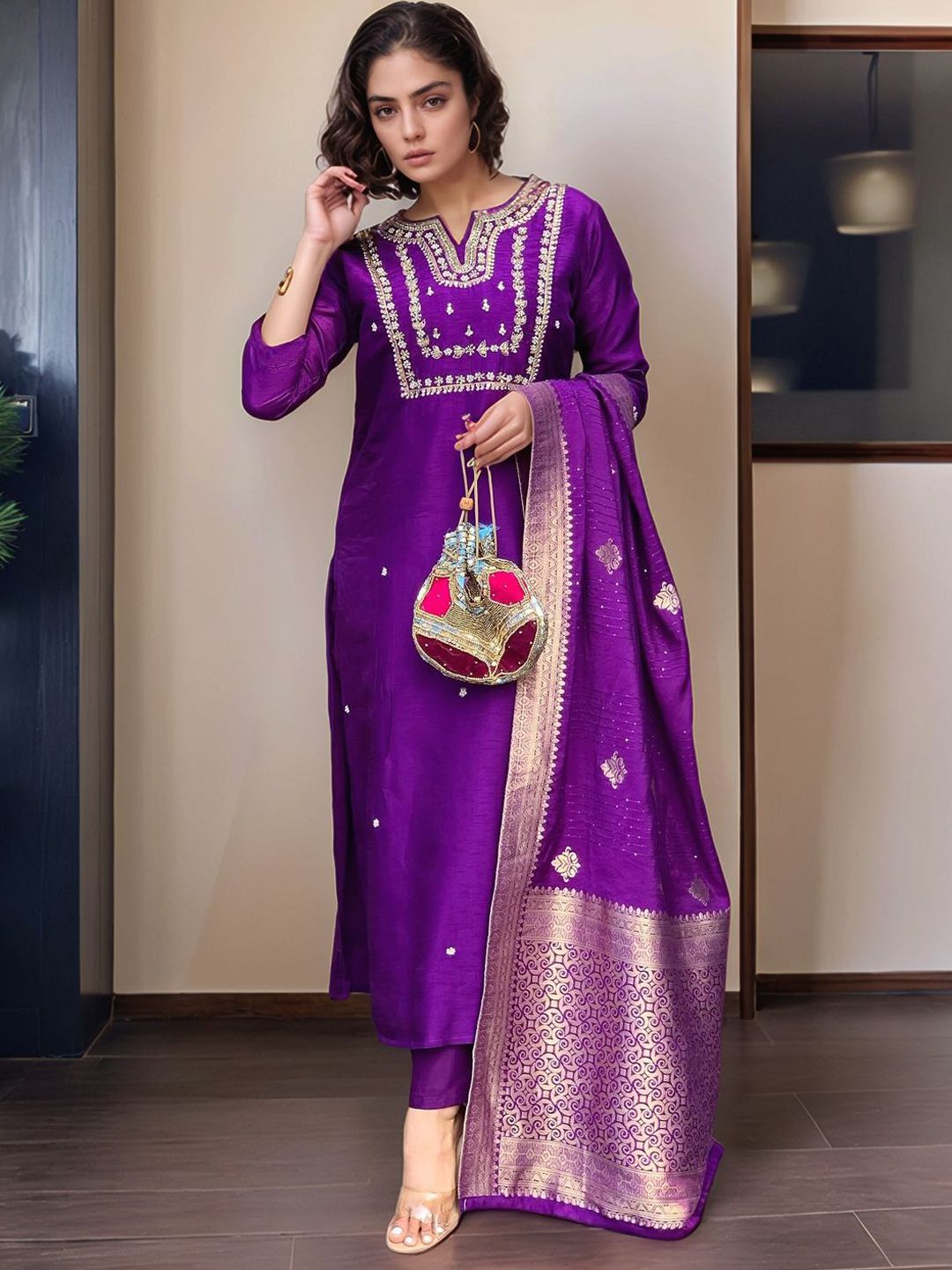 GoSriKi Floral Embroidered Beads And Stones Straight Kurta with Trousers & Dupatta
