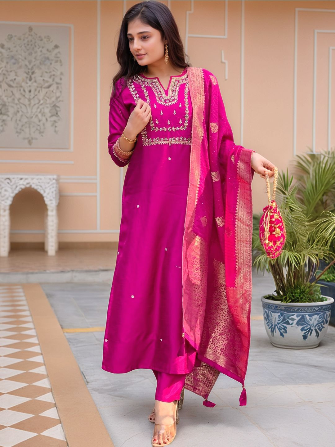 GoSriKi Floral Embroidered Notch neck Zari Straight Kurta & Trousers With Dupatta