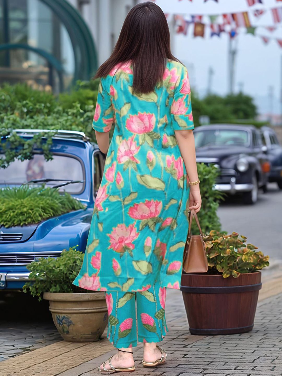 GoSriKi Floral Printed Mandarin Collar Kurta With Trousers