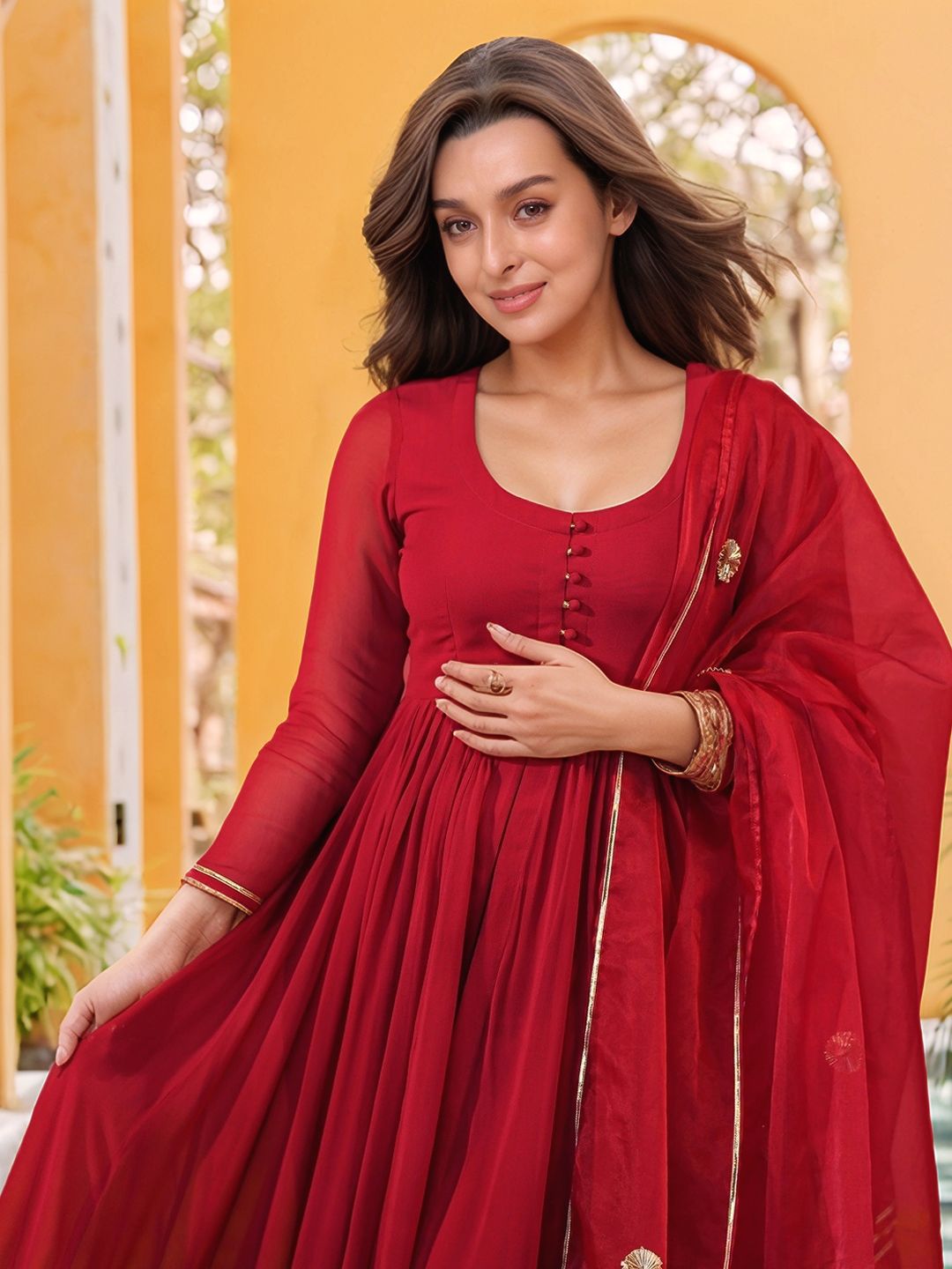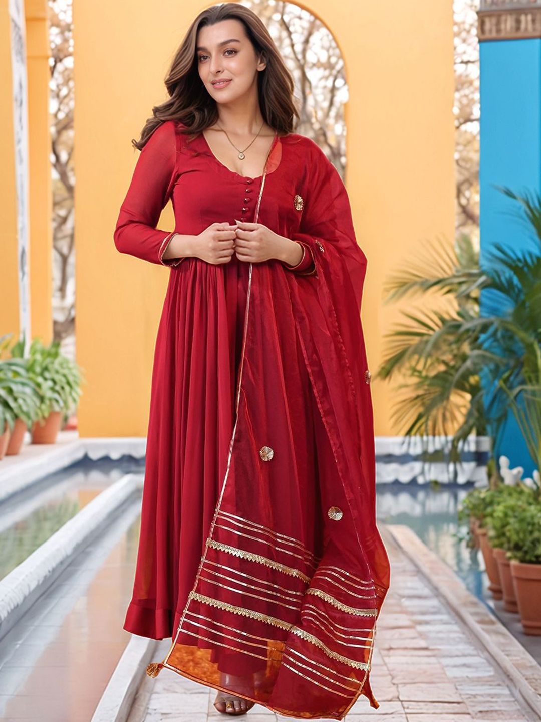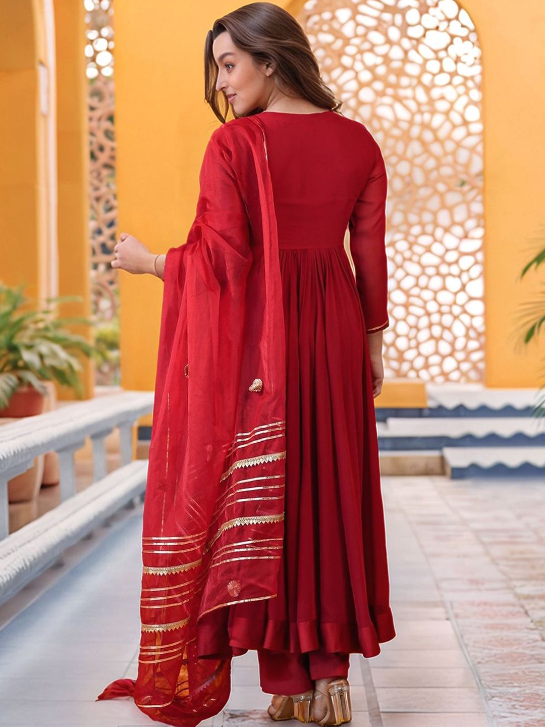 GoSriKi U-Neck Gotta Patti Pleated Anarkali Kurta & Trousers With Dupatta