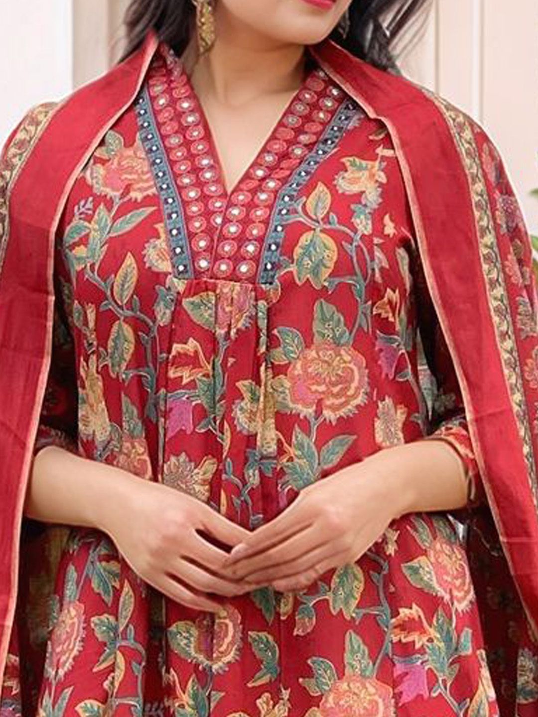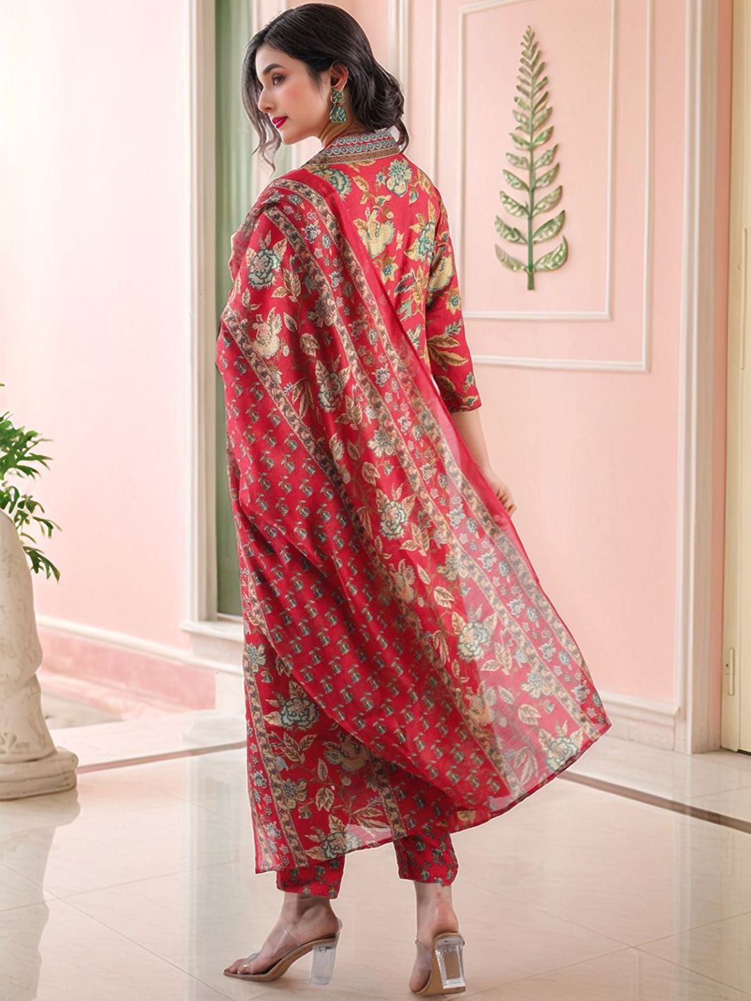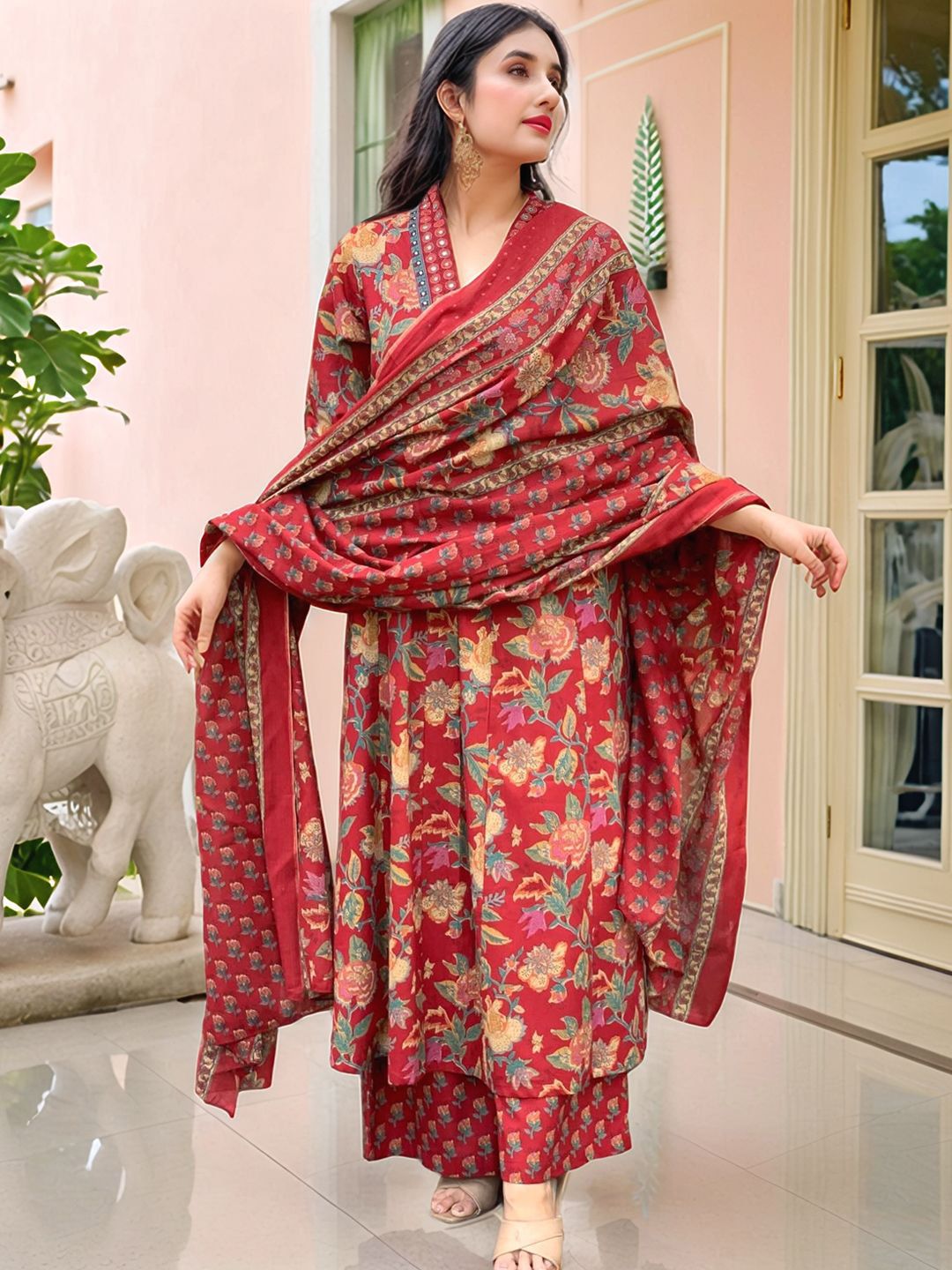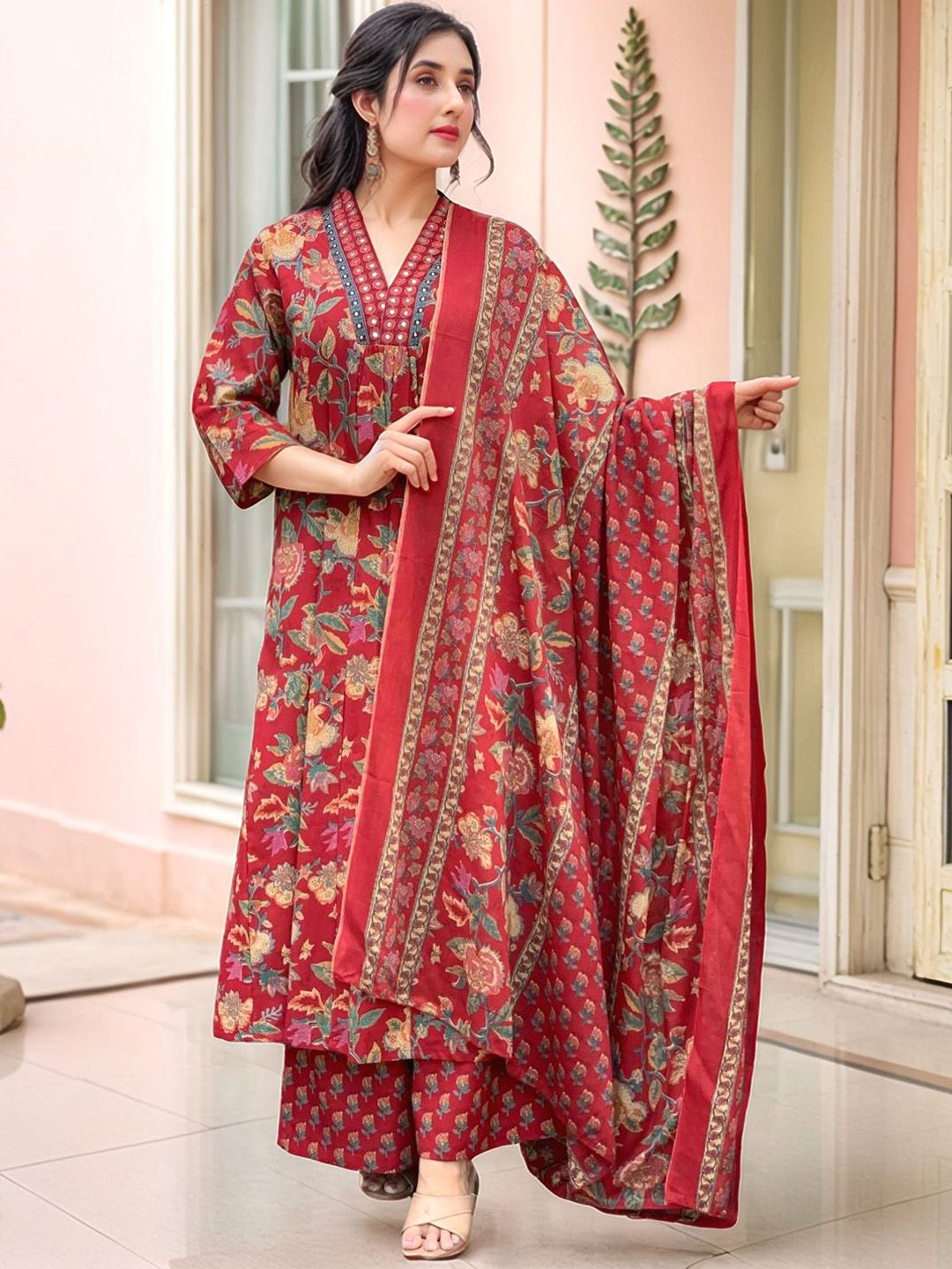 GoSriKi Women Floral Printed V-Neck Kurta with Palazzos & Dupatta