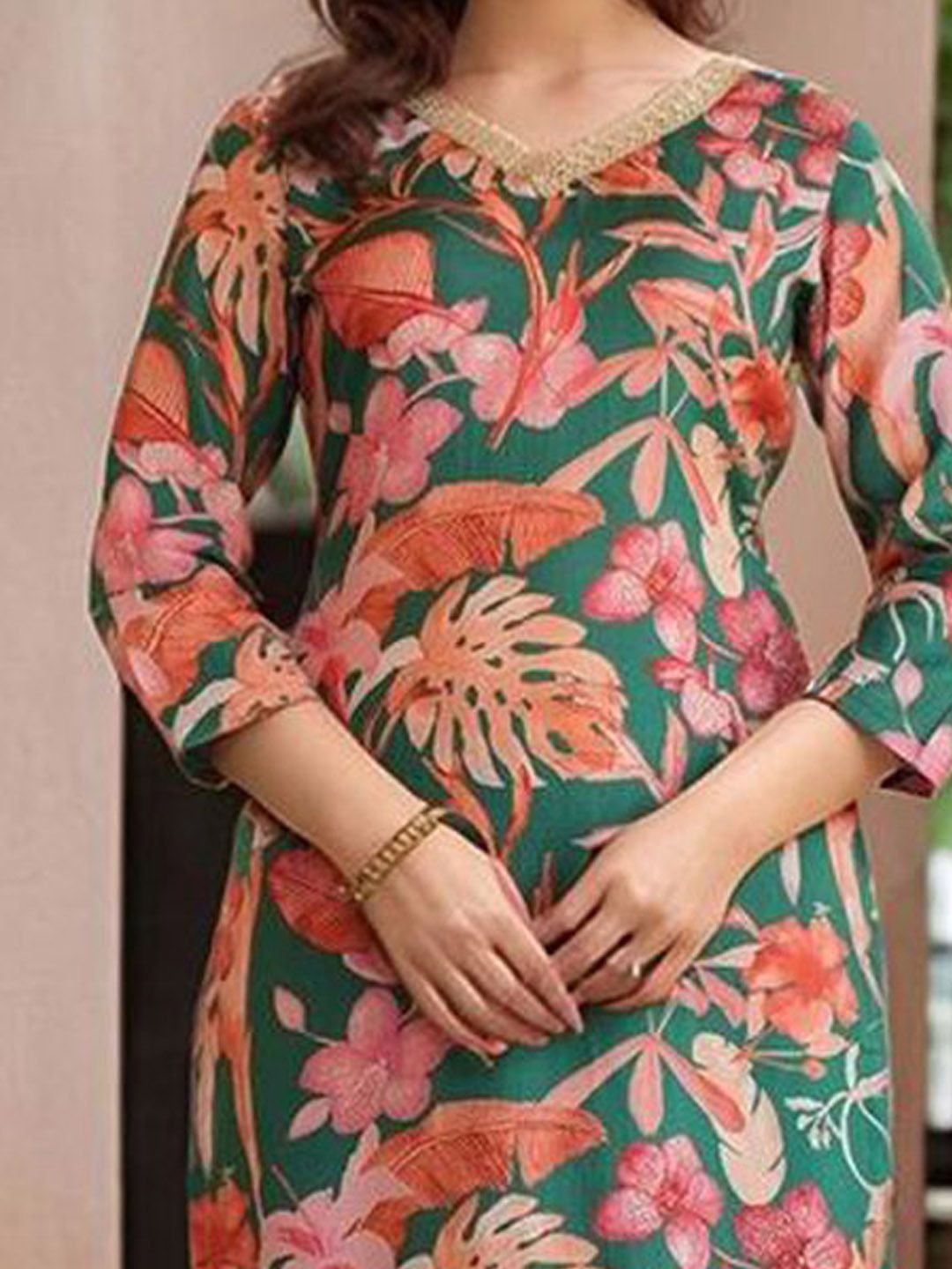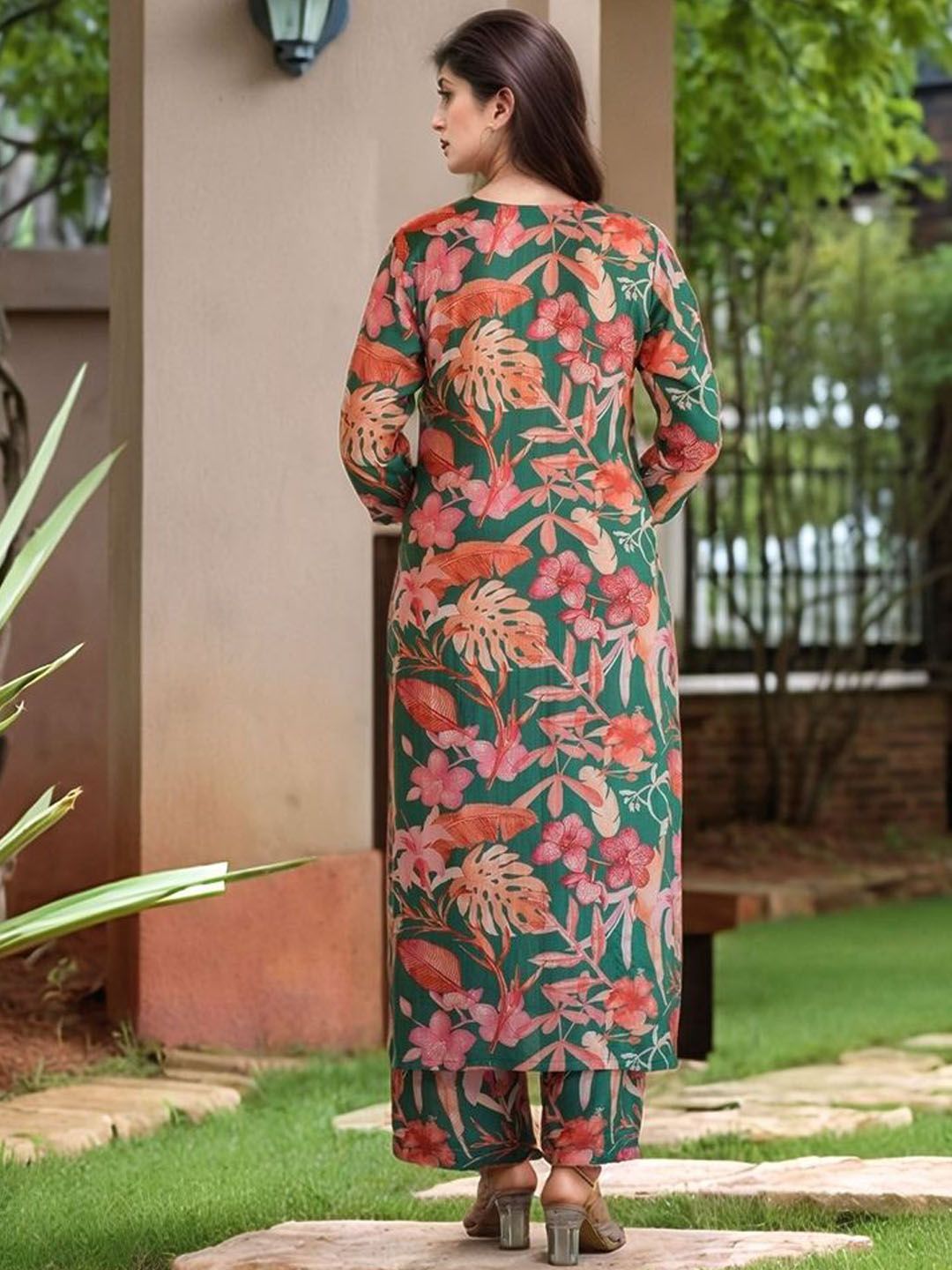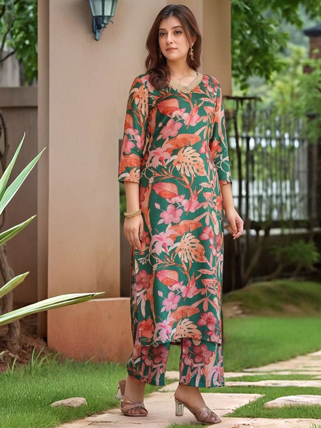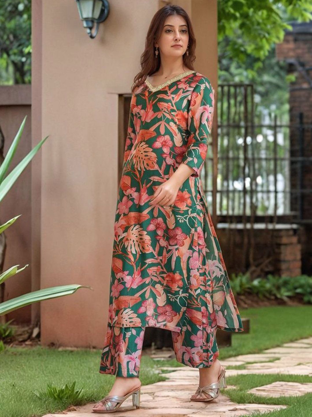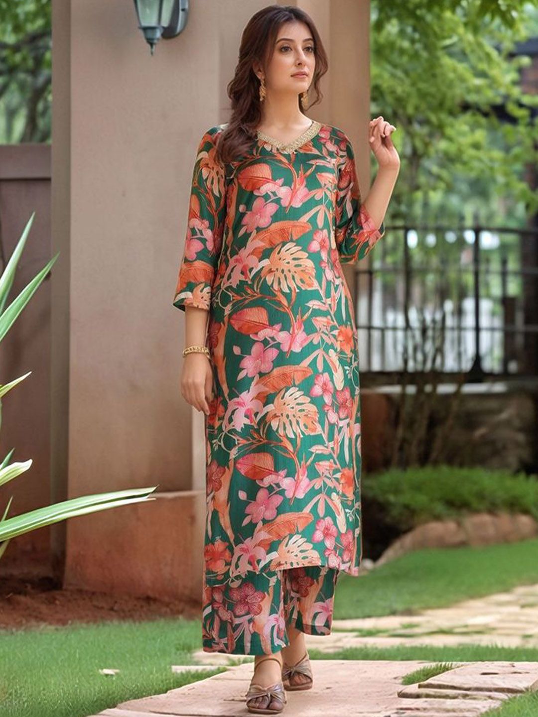 GoSriKi Women Floral Printed V-Neck Regular Kurta with Palazzos