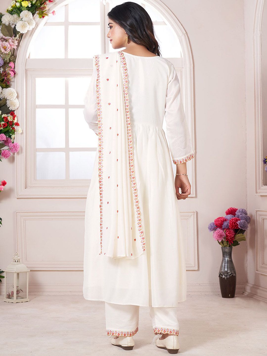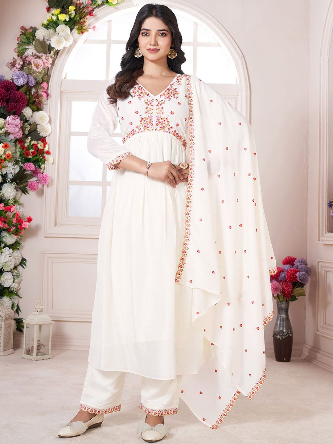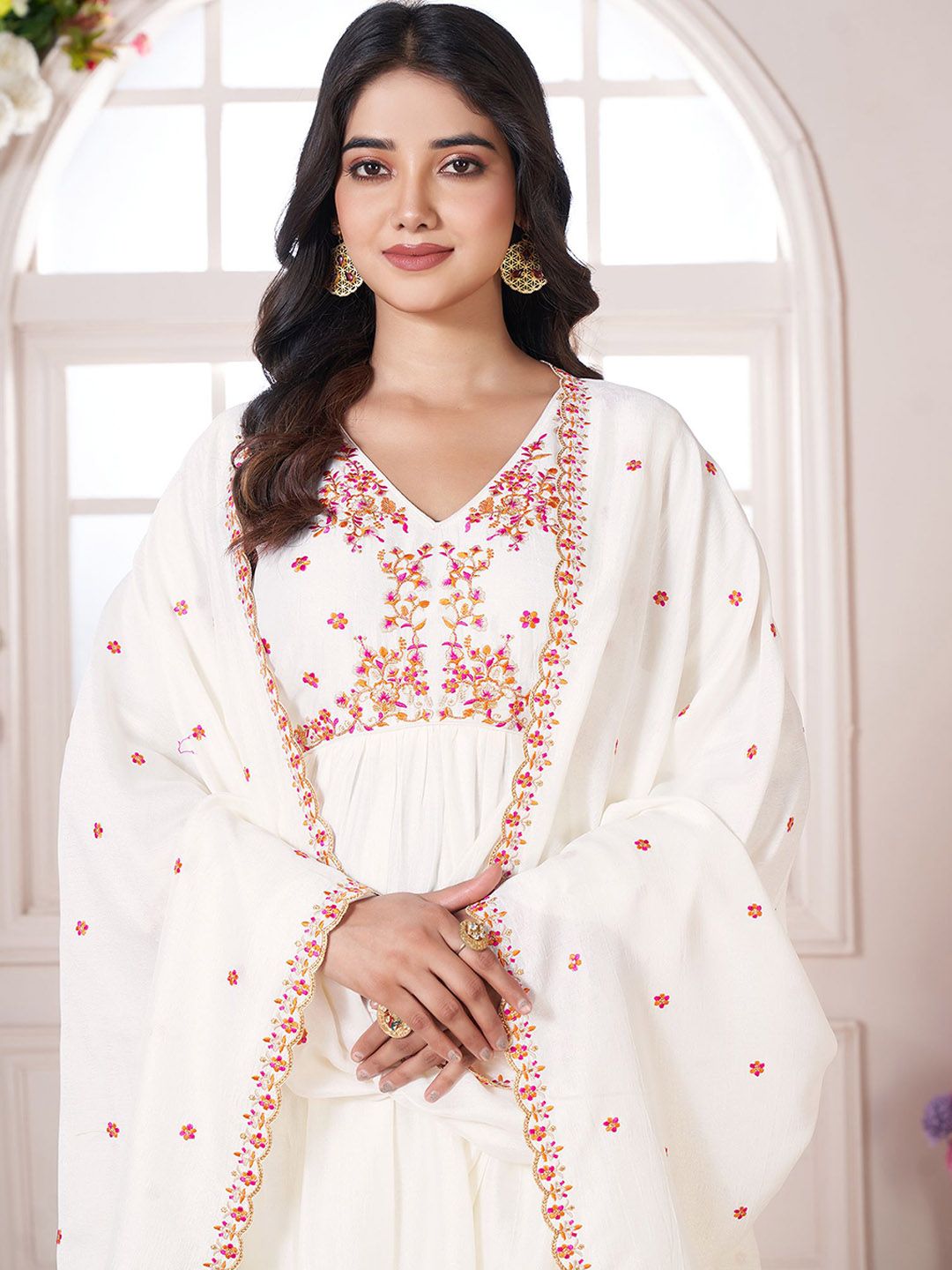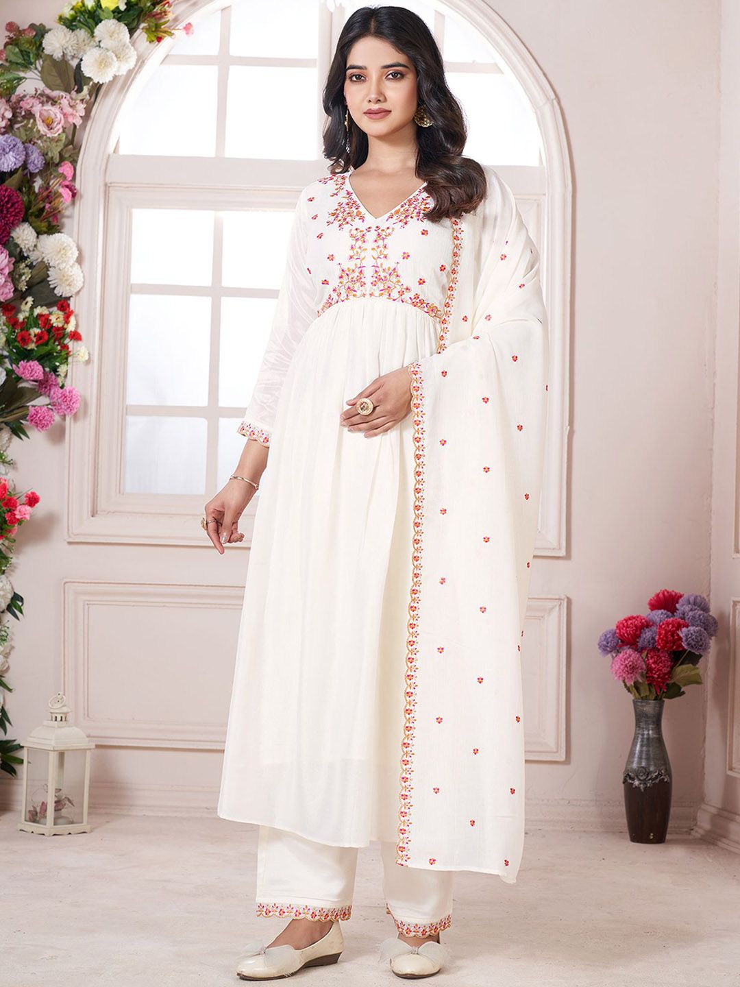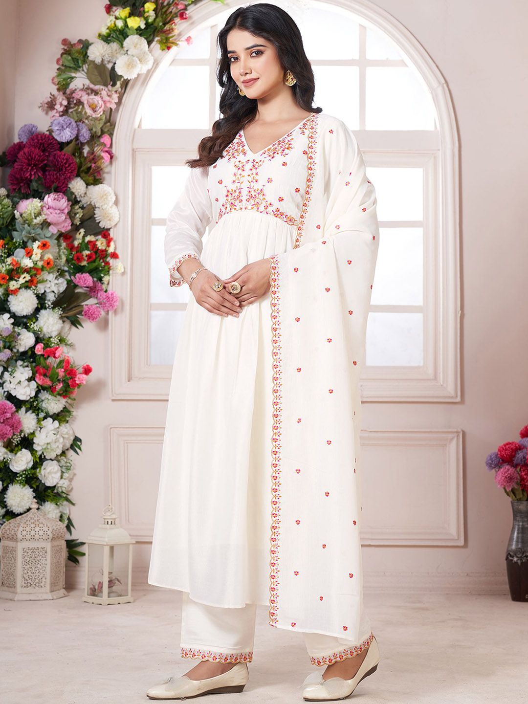 Granthva Fab Floral Yoke Design V-Neck Thread Work Anarkali Kurta With Trousers & Dupatta