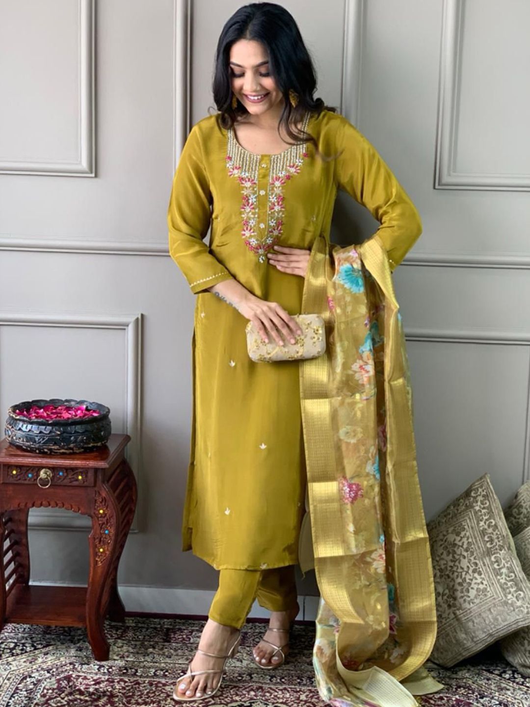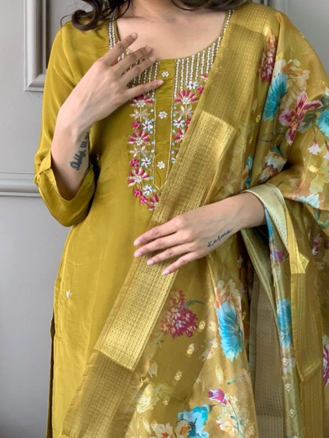 Growdamy Women Ethnic Motifs Embroidered Straight Kurta with Trousers & Dupatta