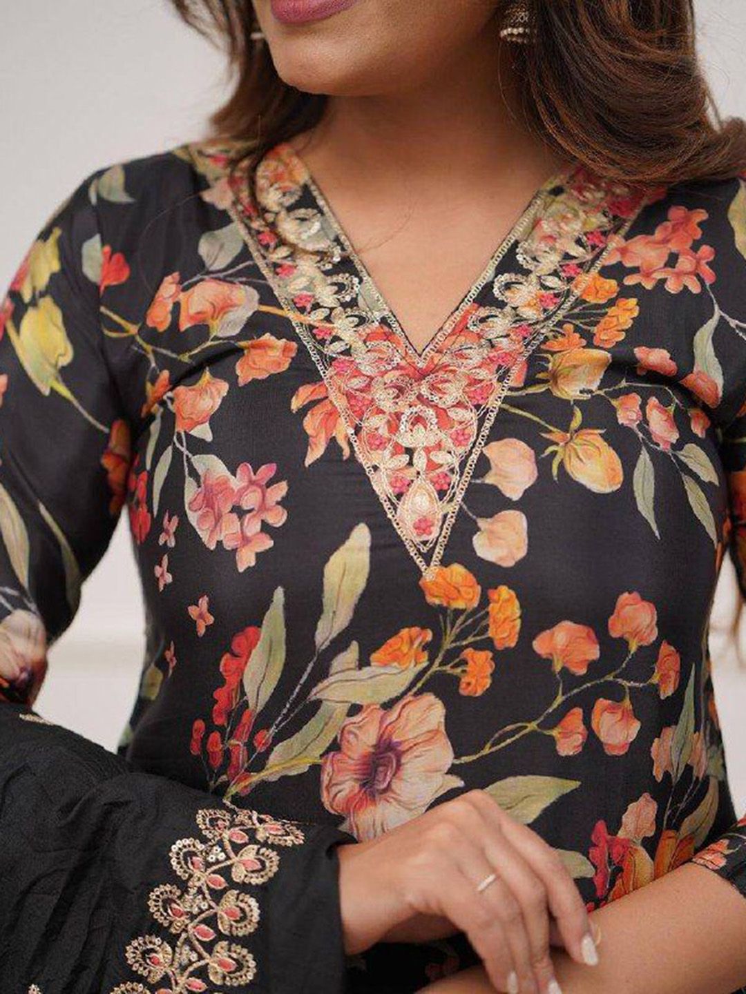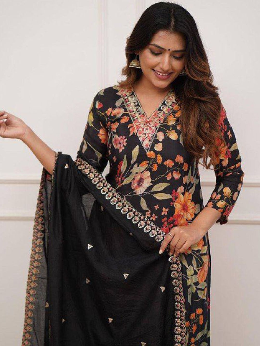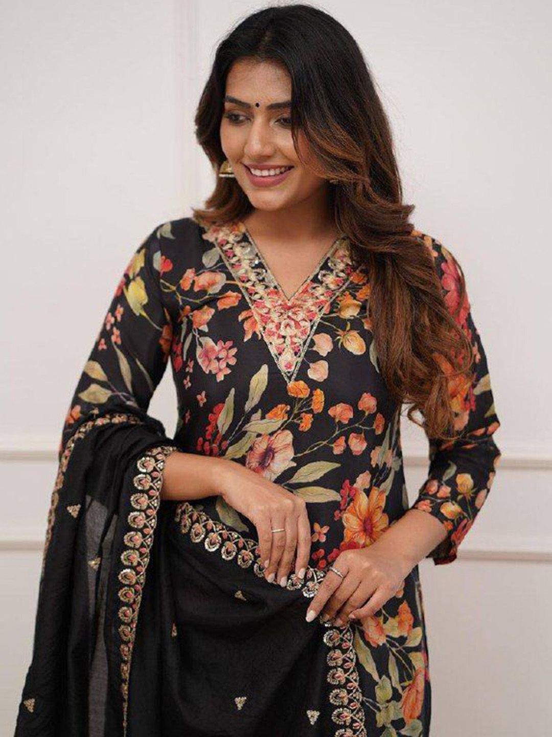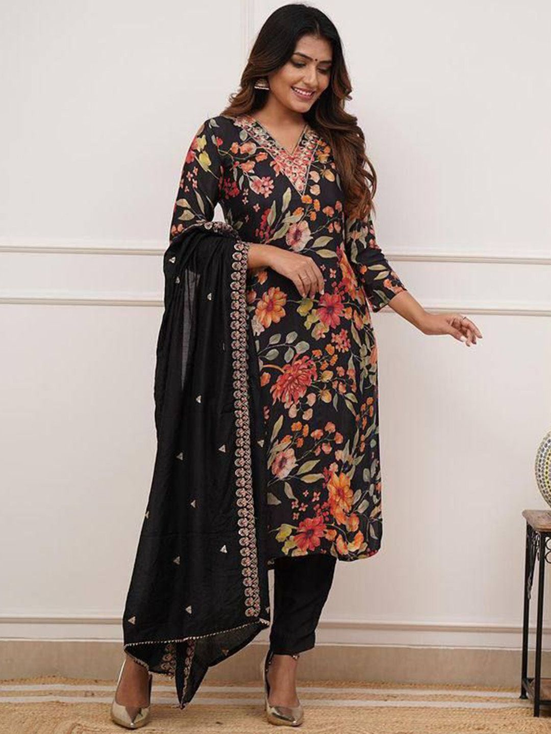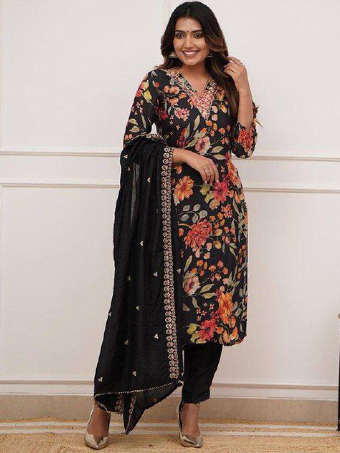 Growdamy Women Floral Embroidered Silk Kurta with Trousers & Dupatta