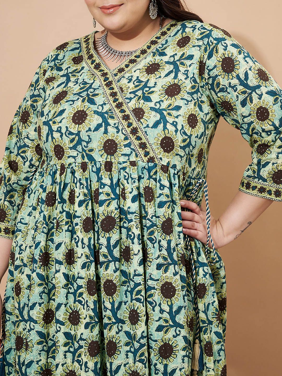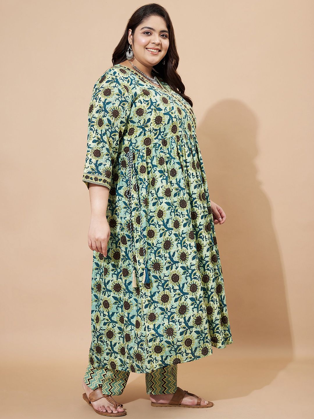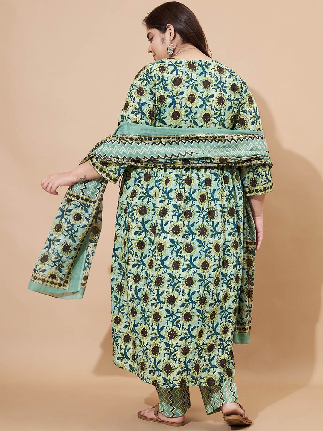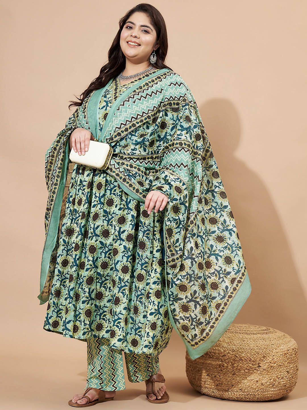 GULMEHAK Floral Printed Anarkali Pure Cotton Kurta With Trousers & Dupatta