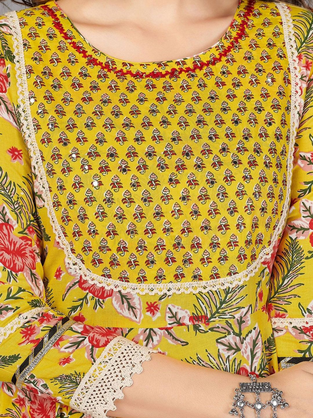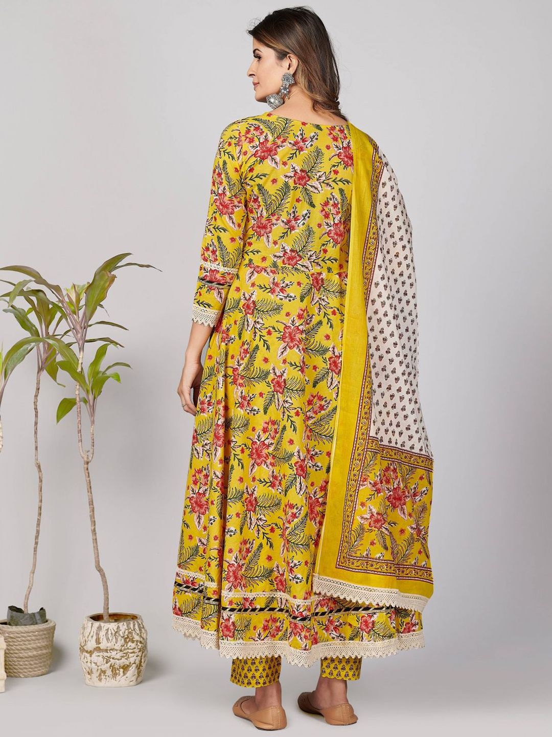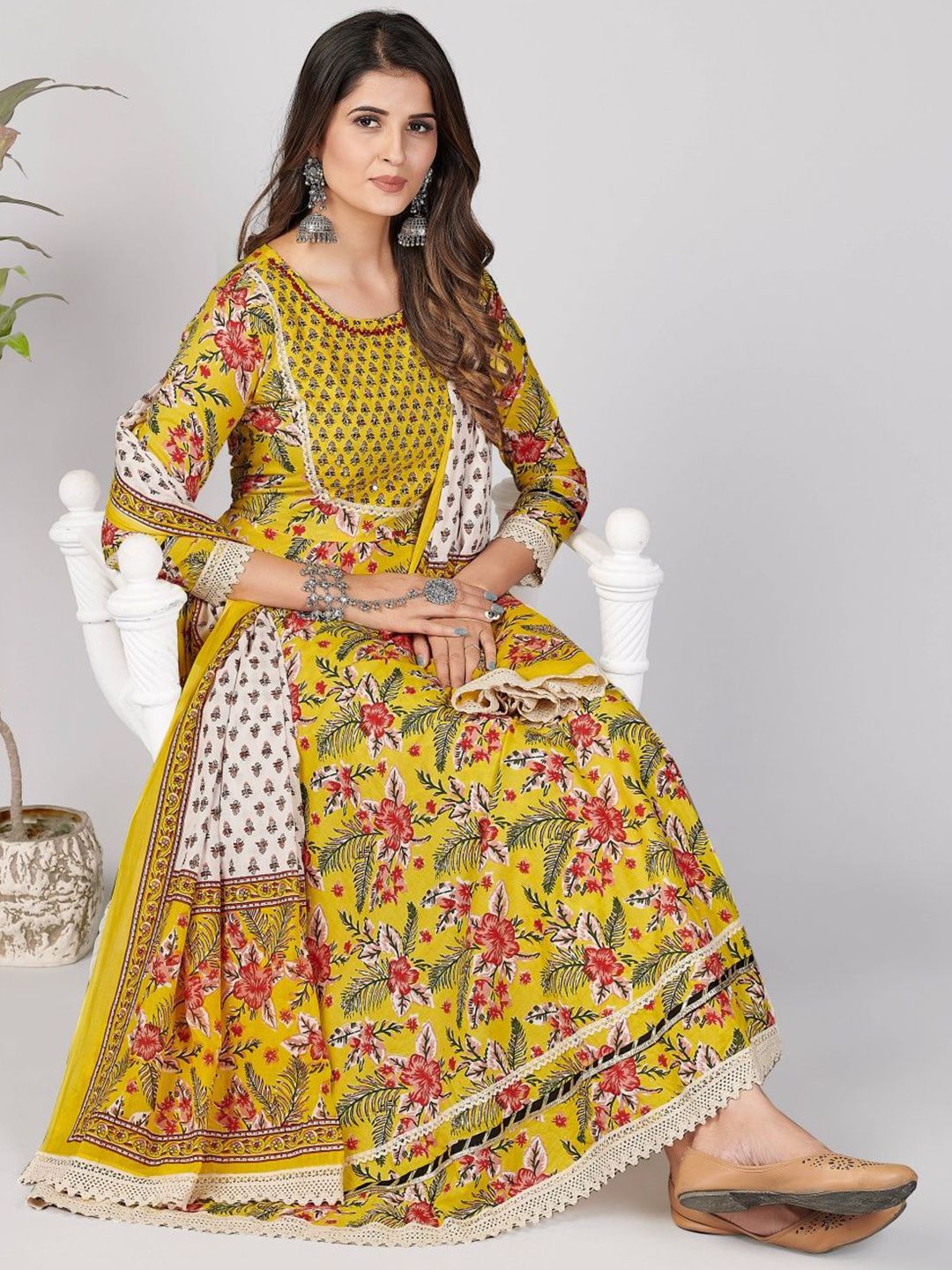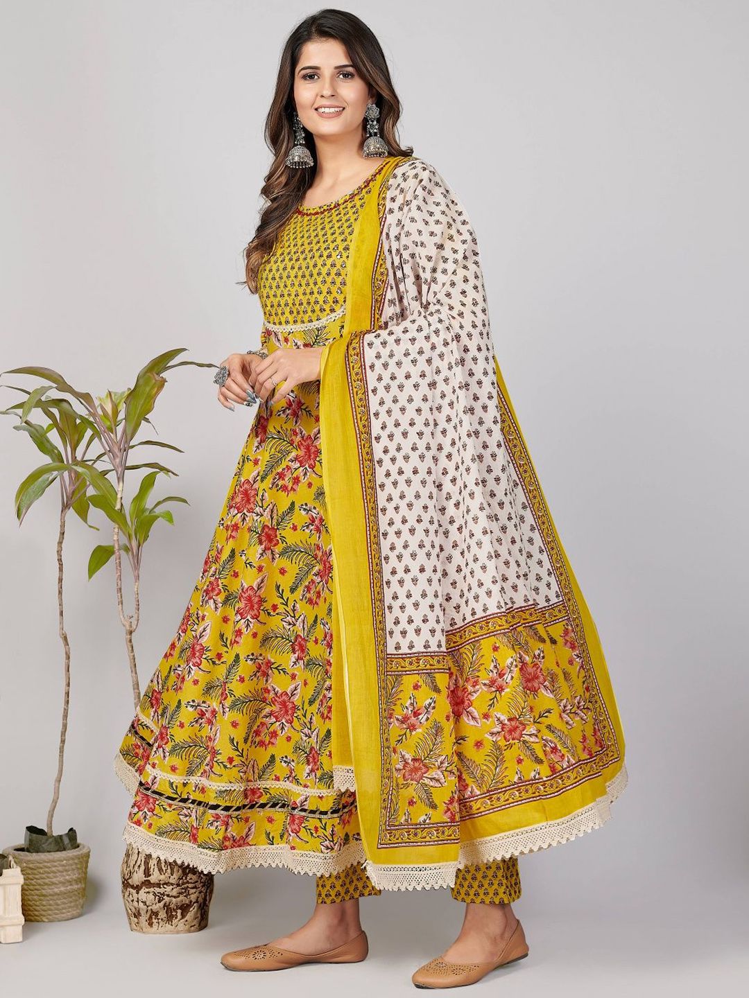 GULMEHAK Floral Printed Round Neck Pure Cotton Anarkali Kurta & Trousers With Dupatta